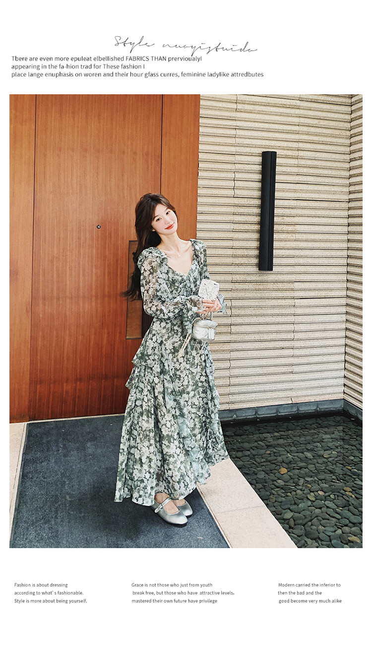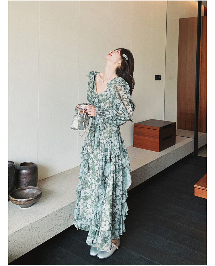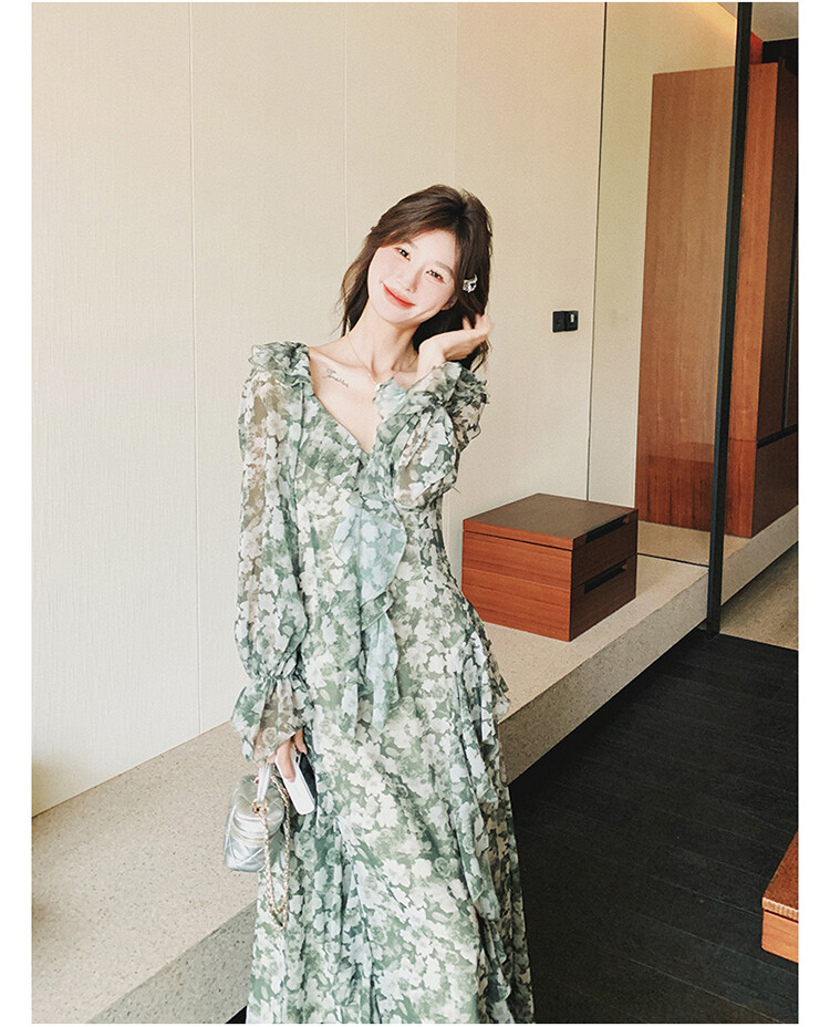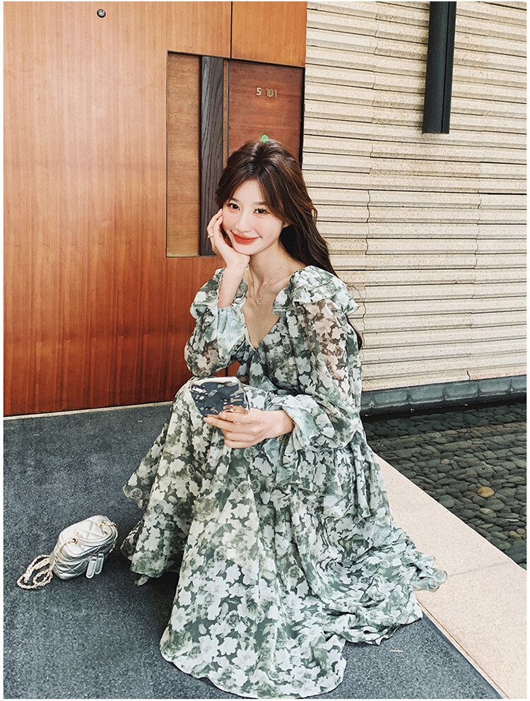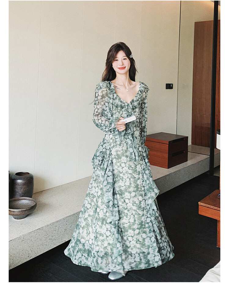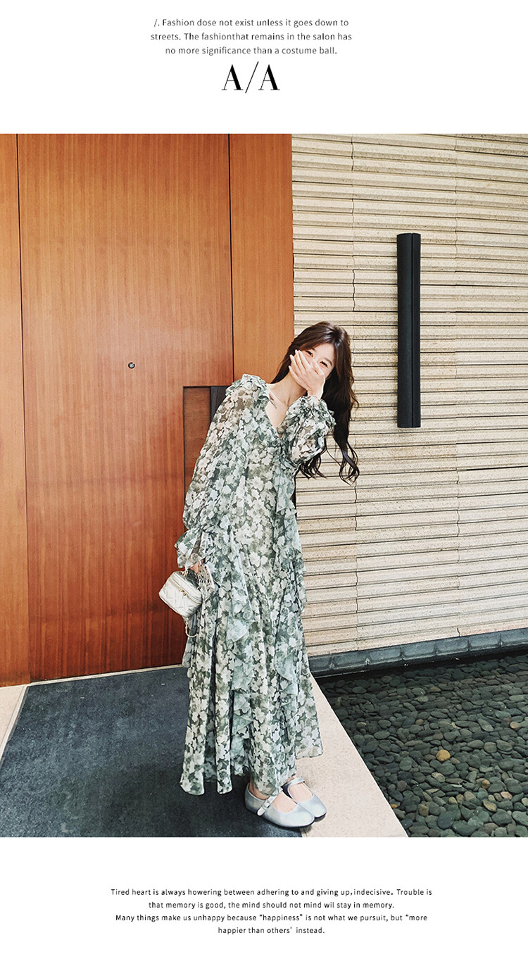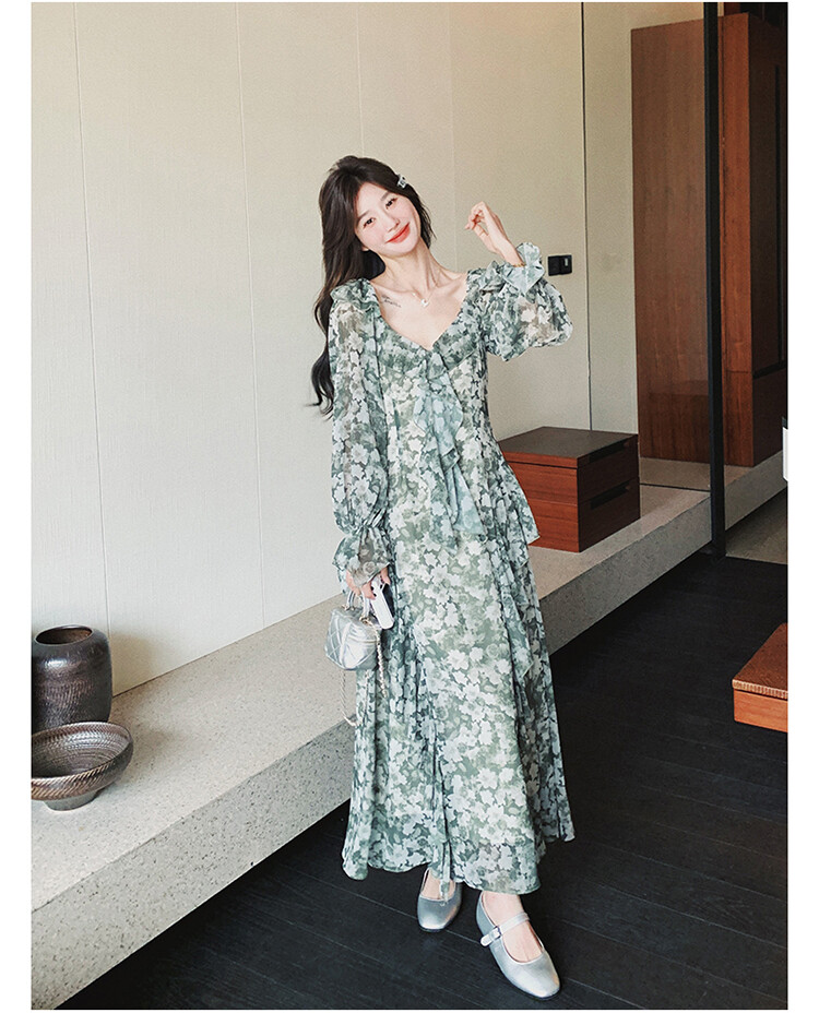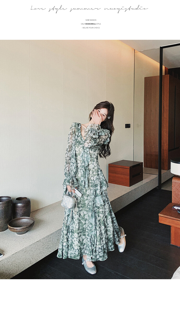 【ワンピース】森系花柄シフォン長袖ワンピース レディース 春夏秋 薄手 ウエストマーク Aライン ロング丈【SHシリーズ】