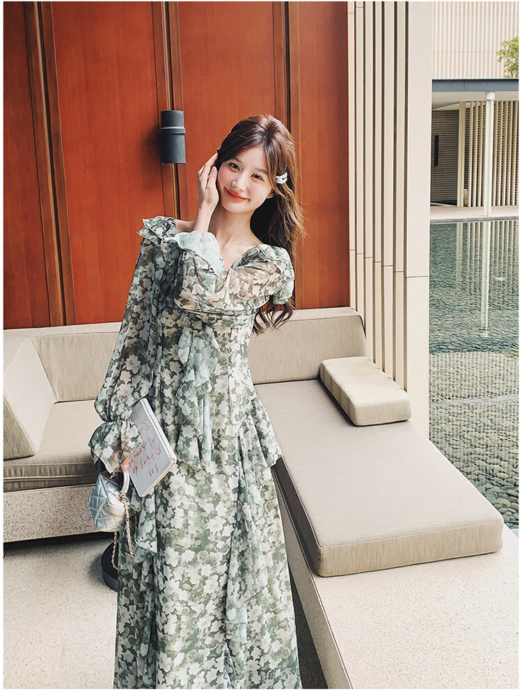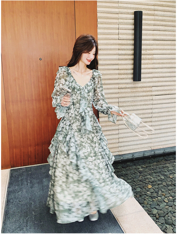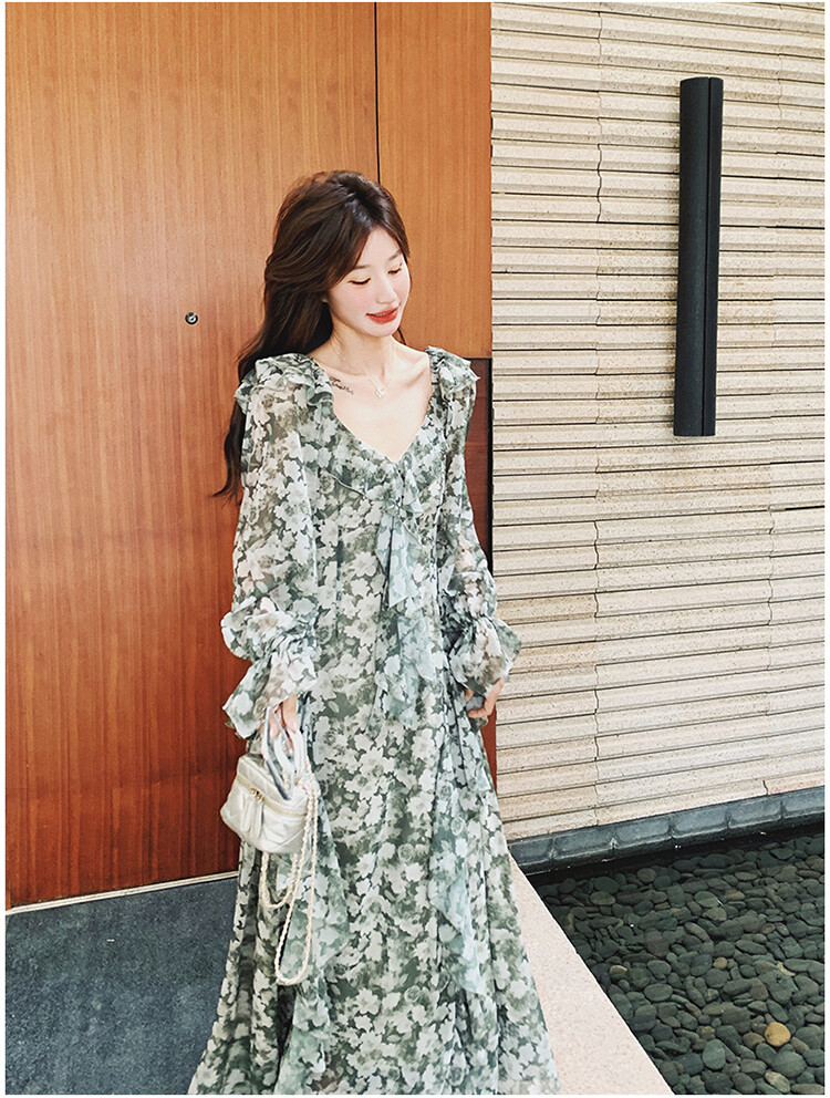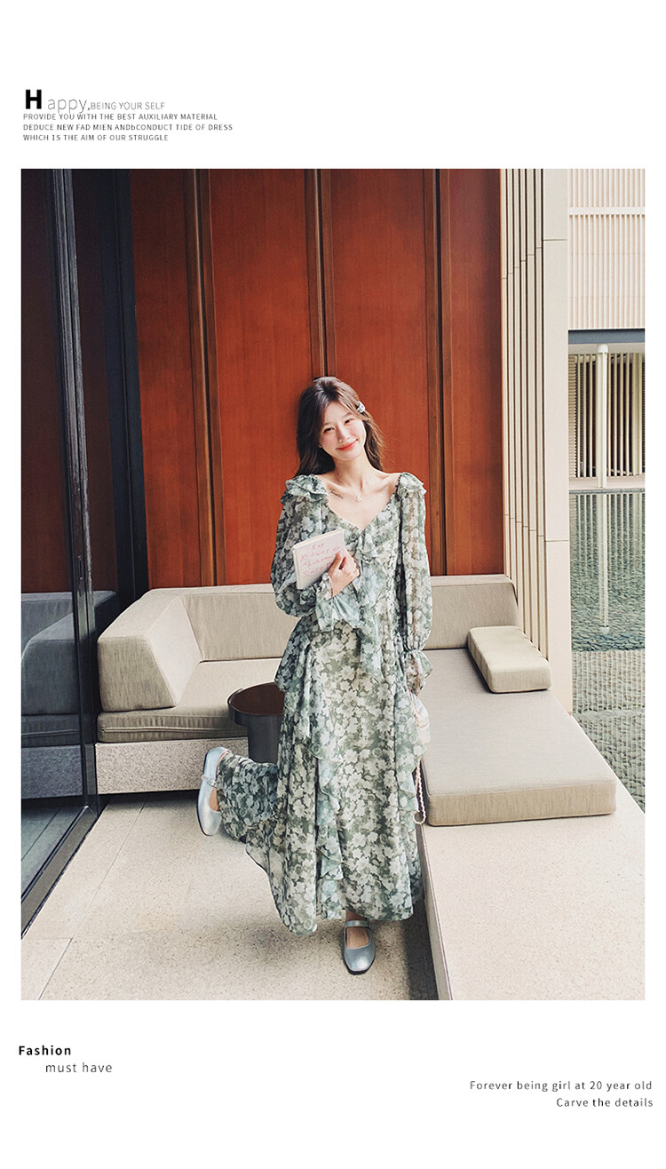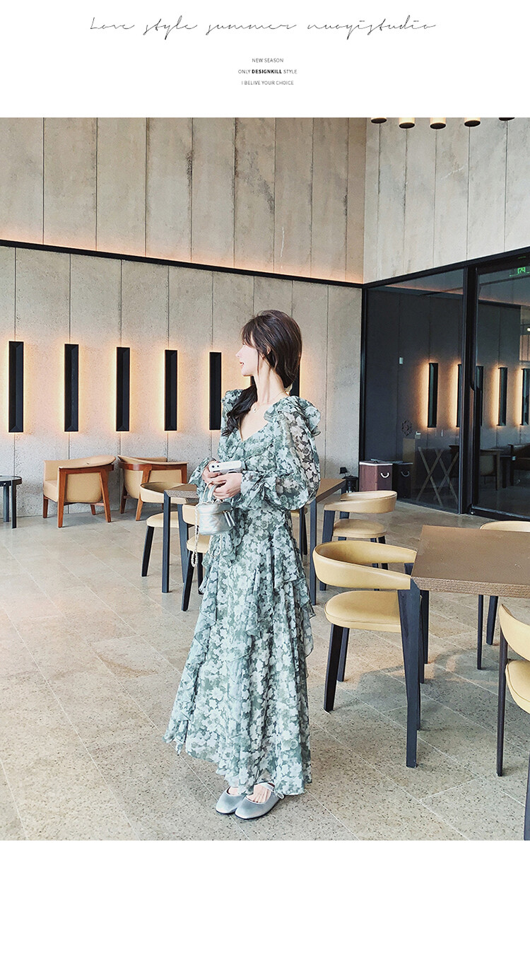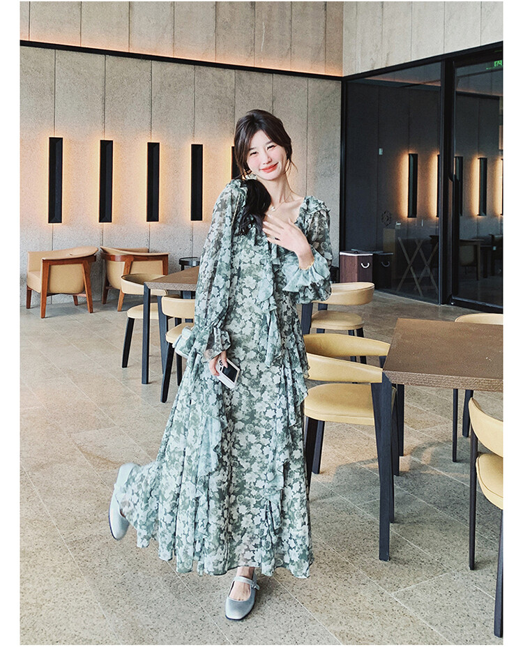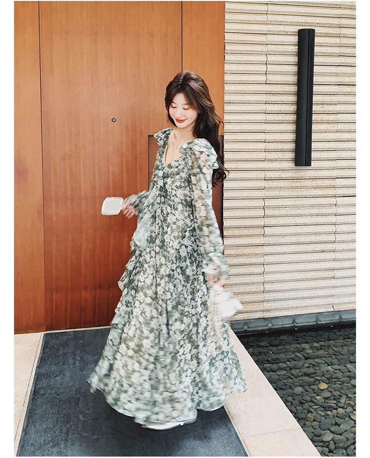 【ワンピース】森系花柄シフォン長袖ワンピース レディース 春夏秋 薄手 ウエストマーク Aライン ロング丈【SHシリーズ】