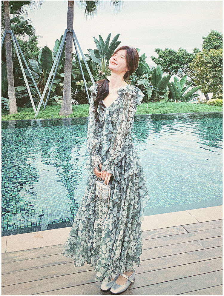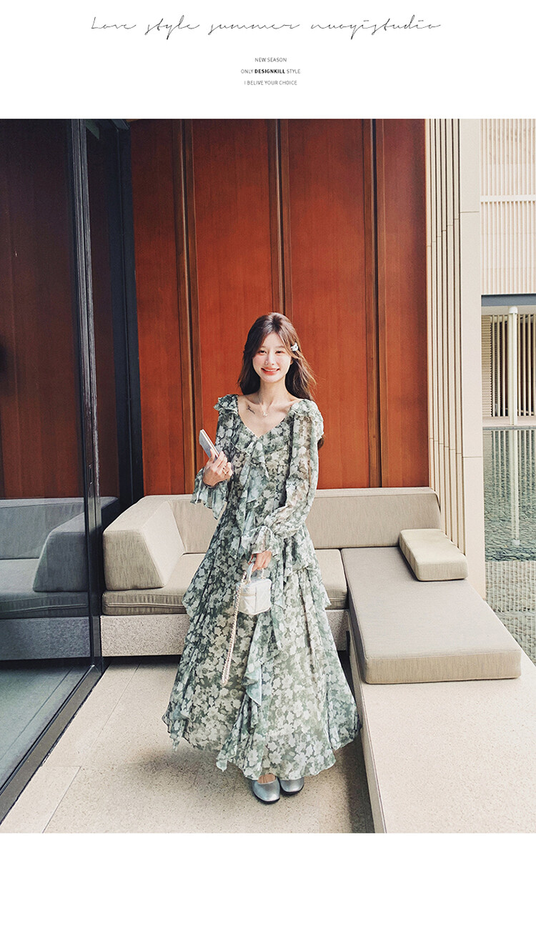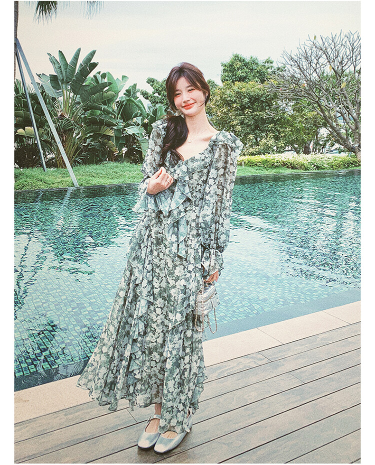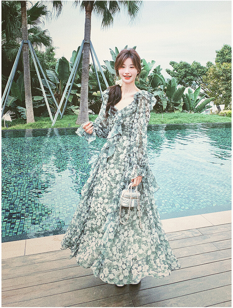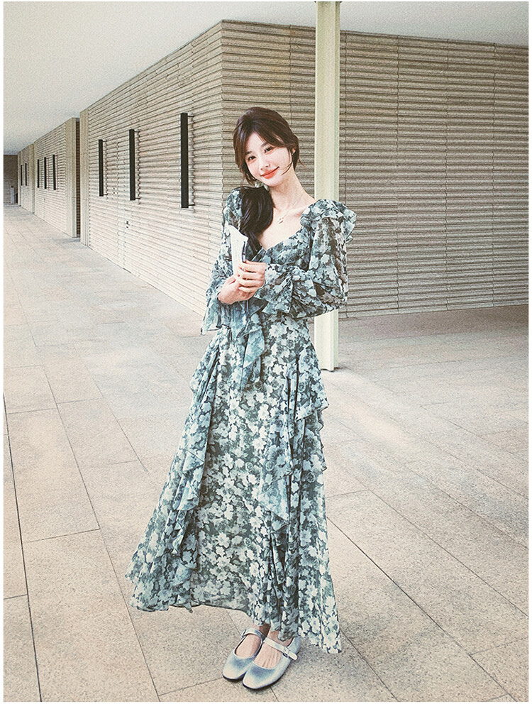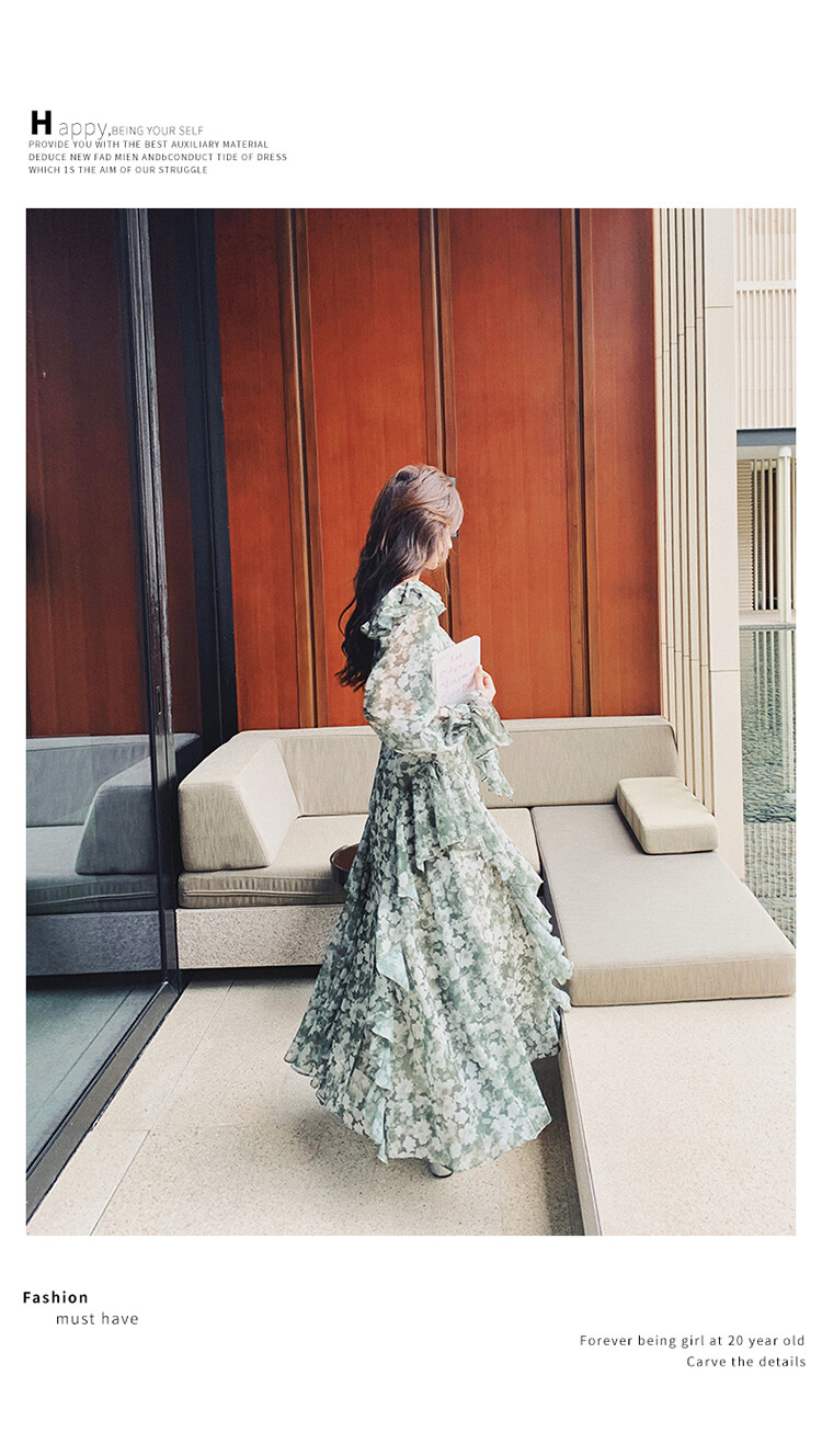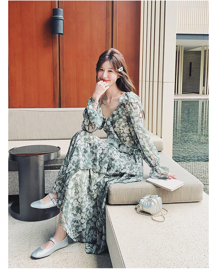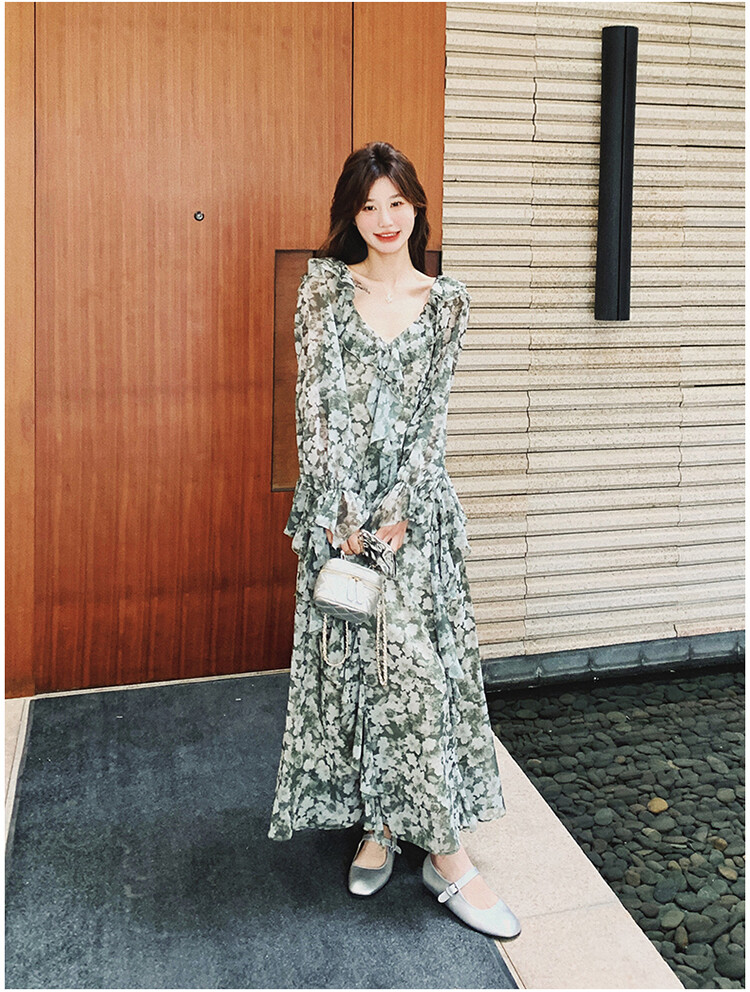 【ワンピース】森系花柄シフォン長袖ワンピース レディース 春夏秋 薄手 ウエストマーク Aライン ロング丈【SHシリーズ】