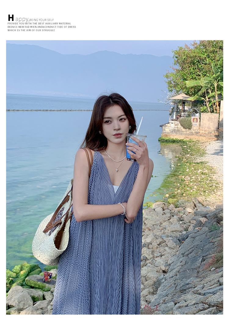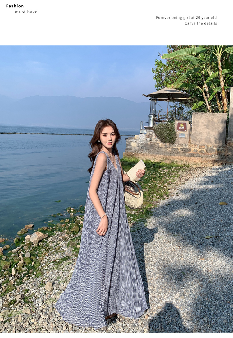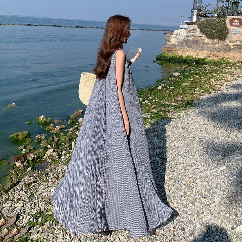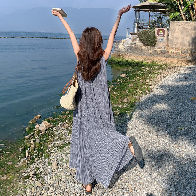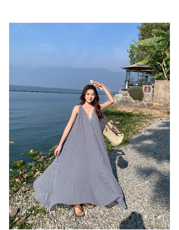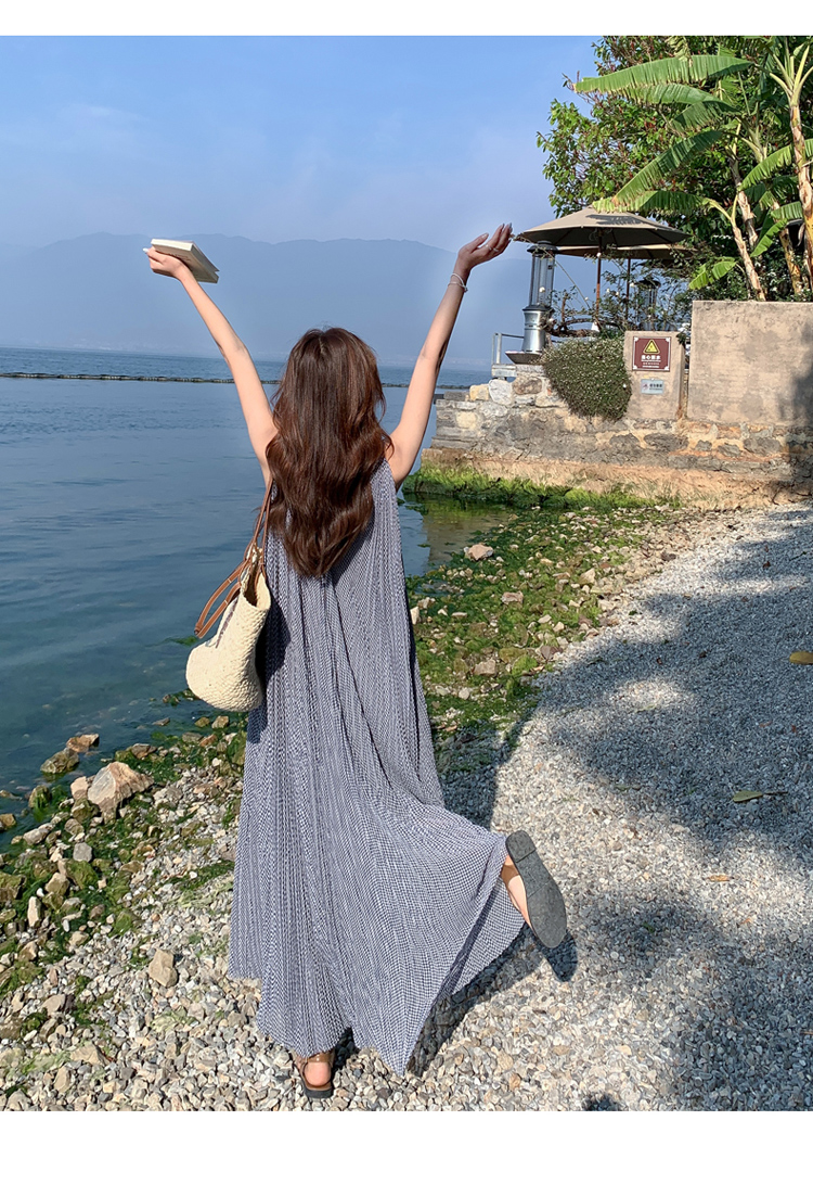 【商品名】【ワンピース】韓国風 千鳥格 ノースリーブワンピース レディース 夏 大きめ裾 ロング丈 高見え【SHシリーズ】