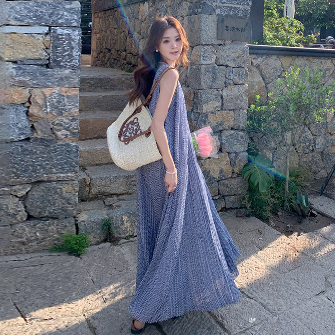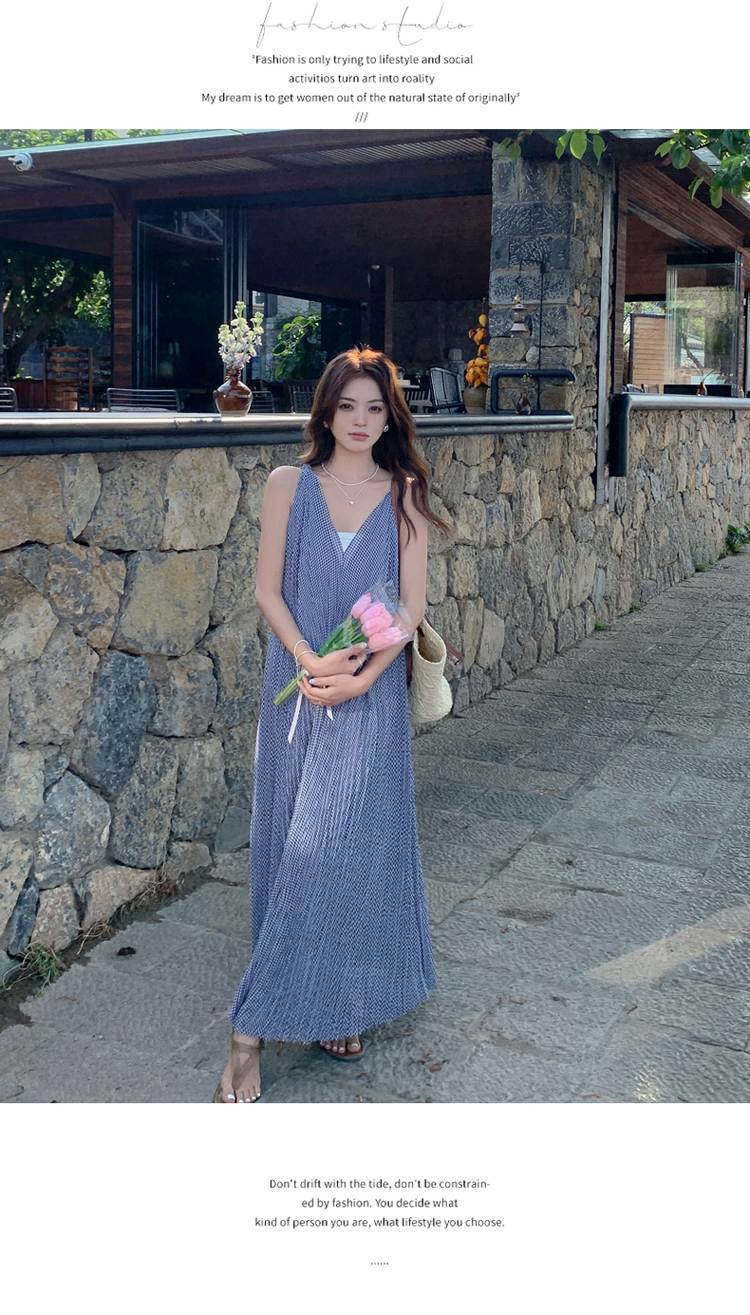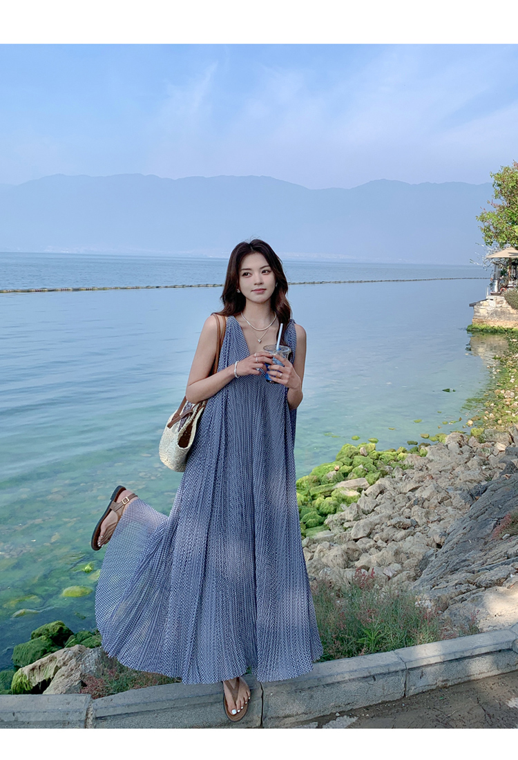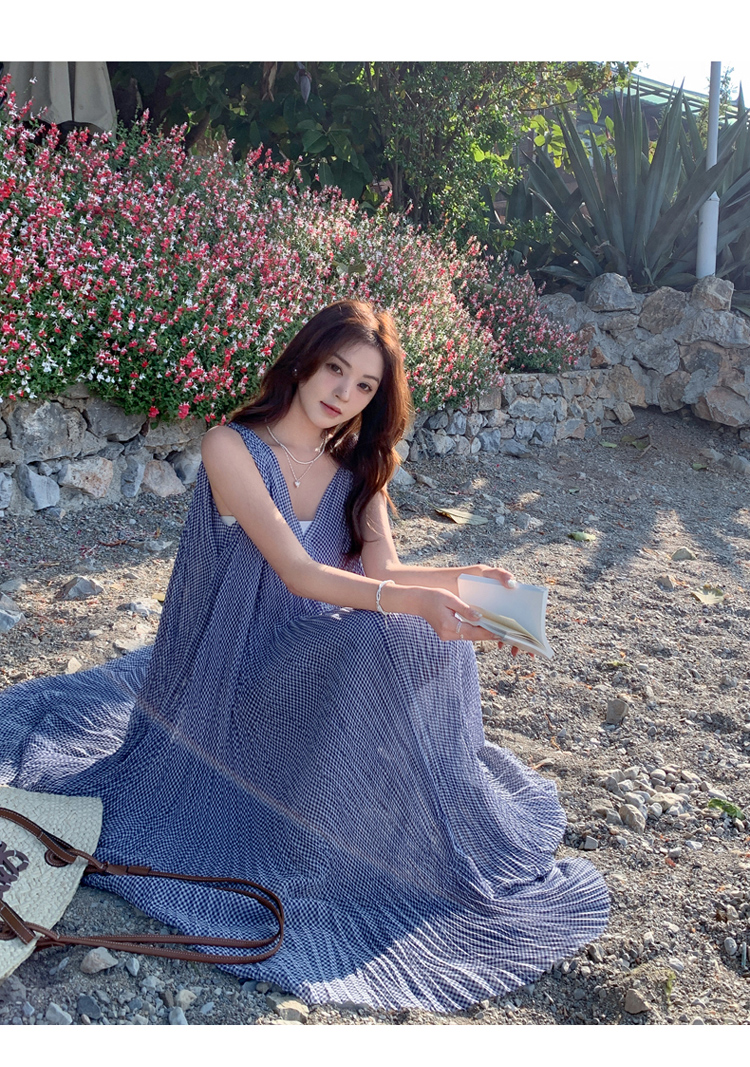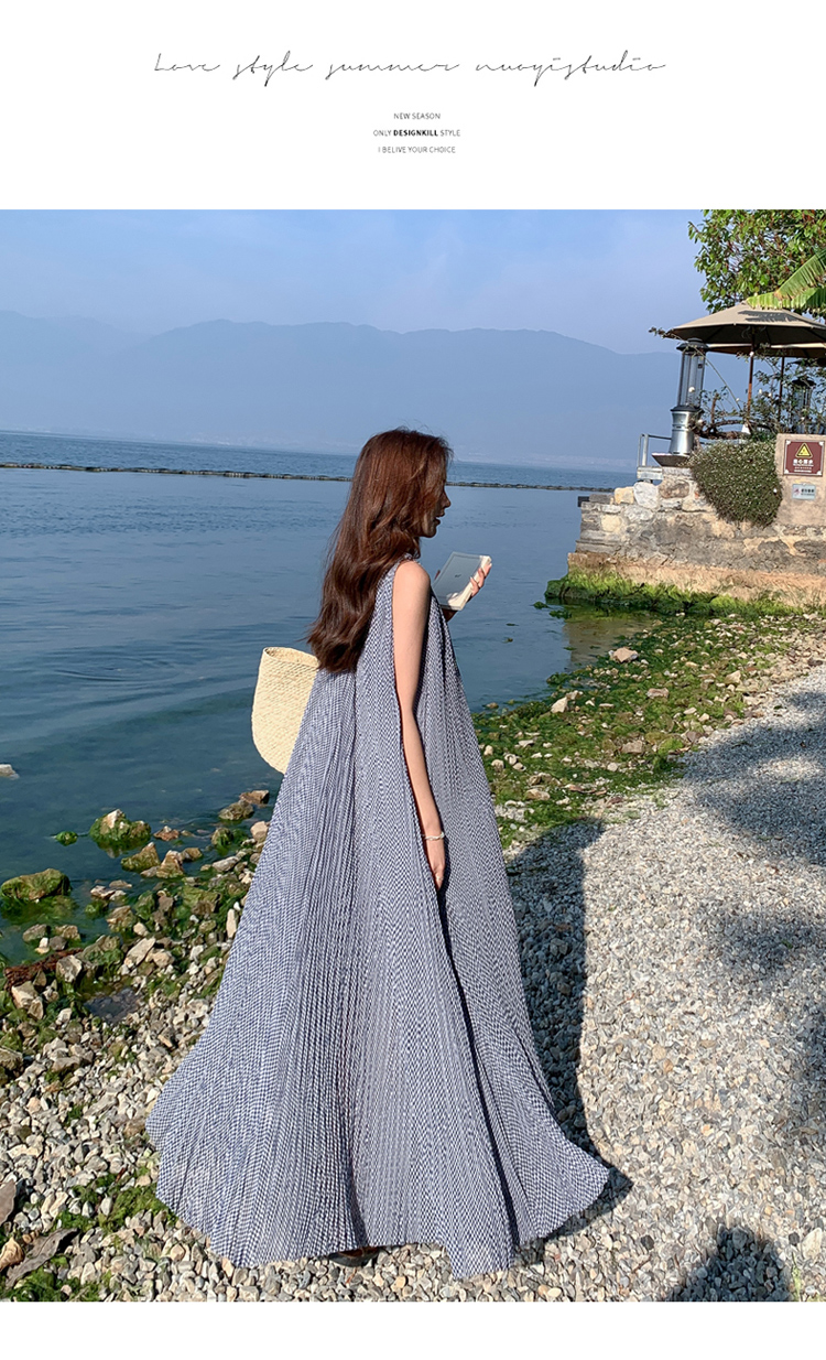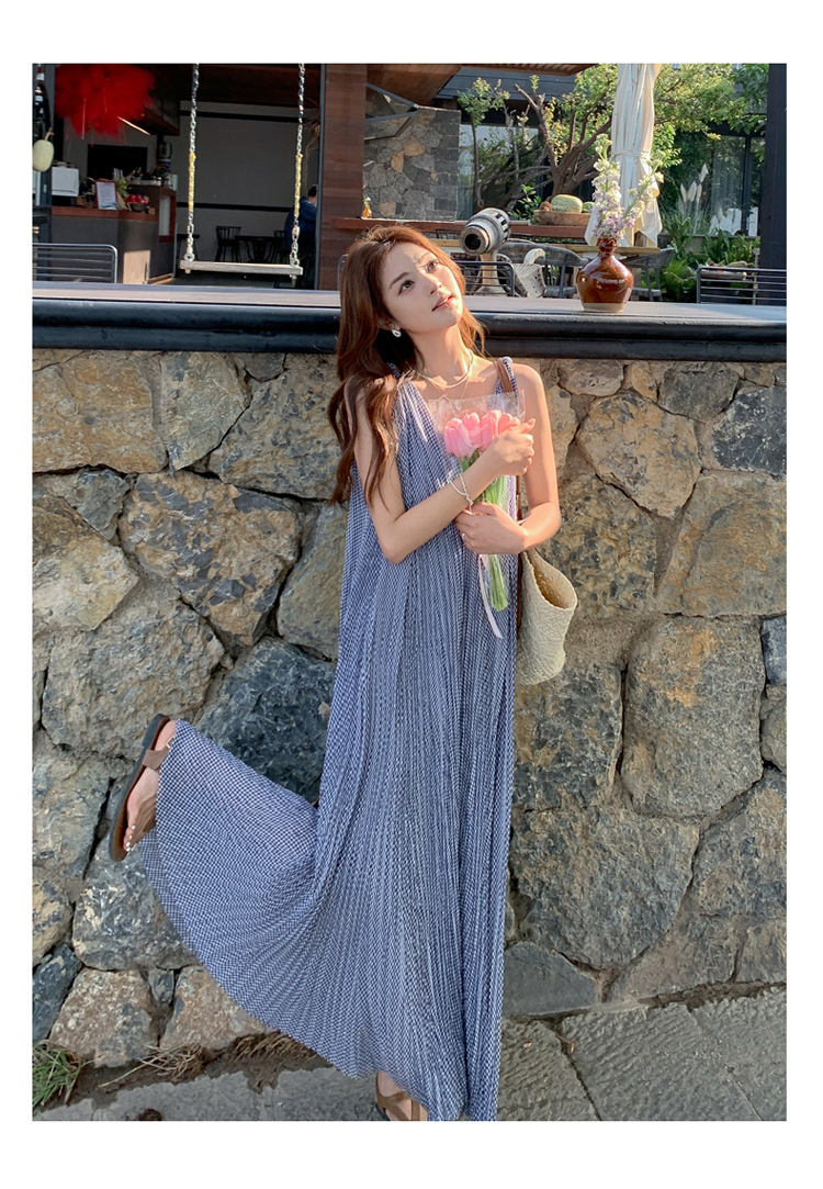 【商品名】【ワンピース】韓国風 千鳥格 ノースリーブワンピース レディース 夏 大きめ裾 ロング丈 高見え【SHシリーズ】