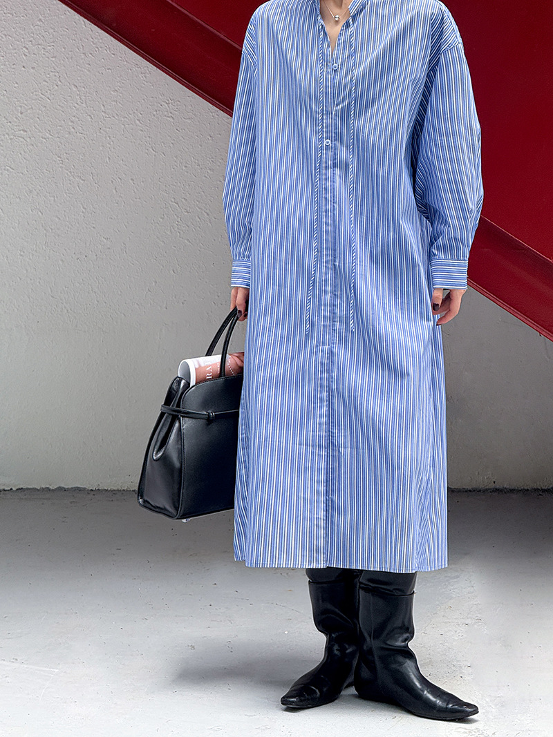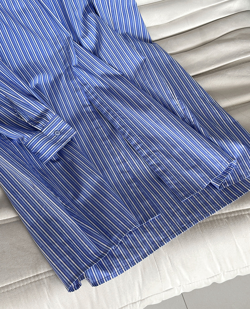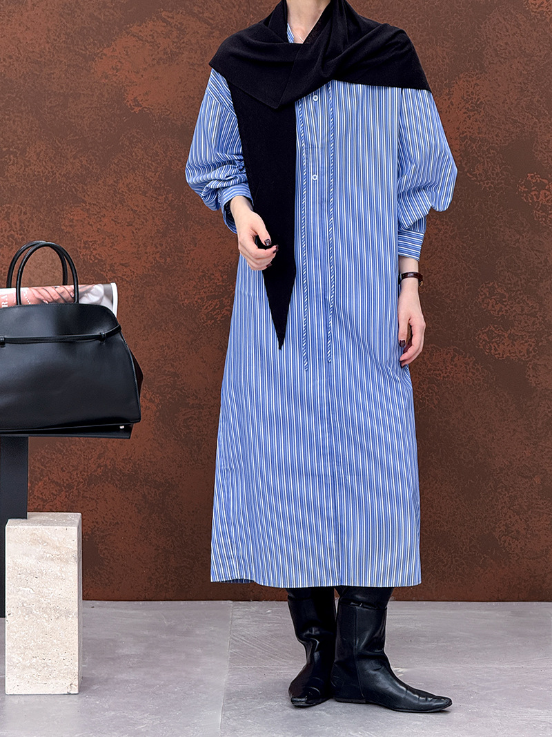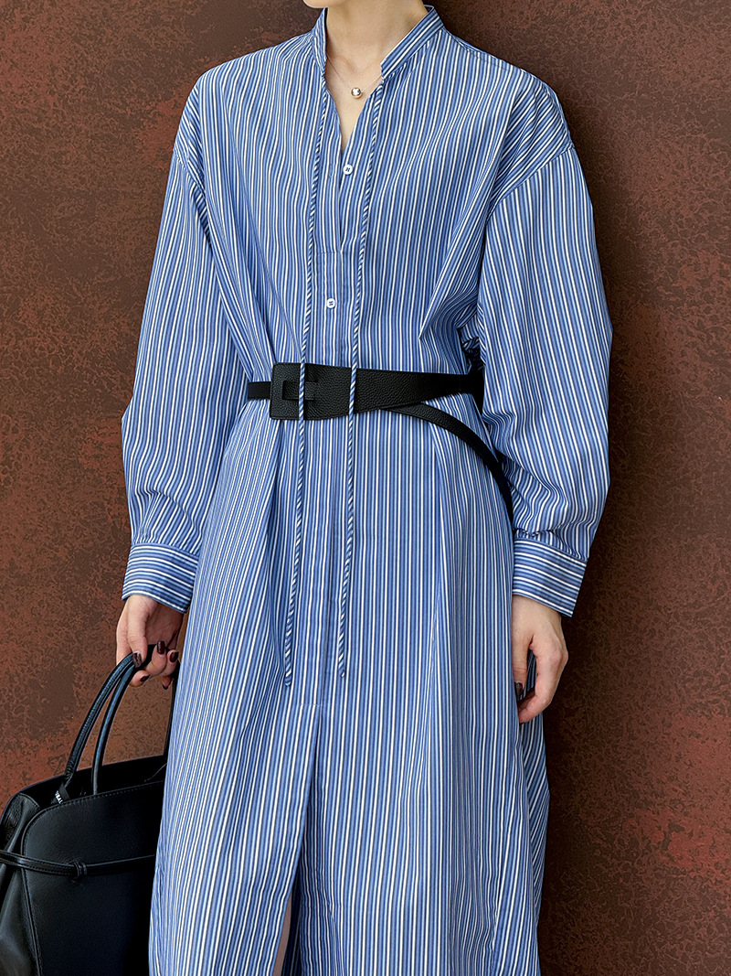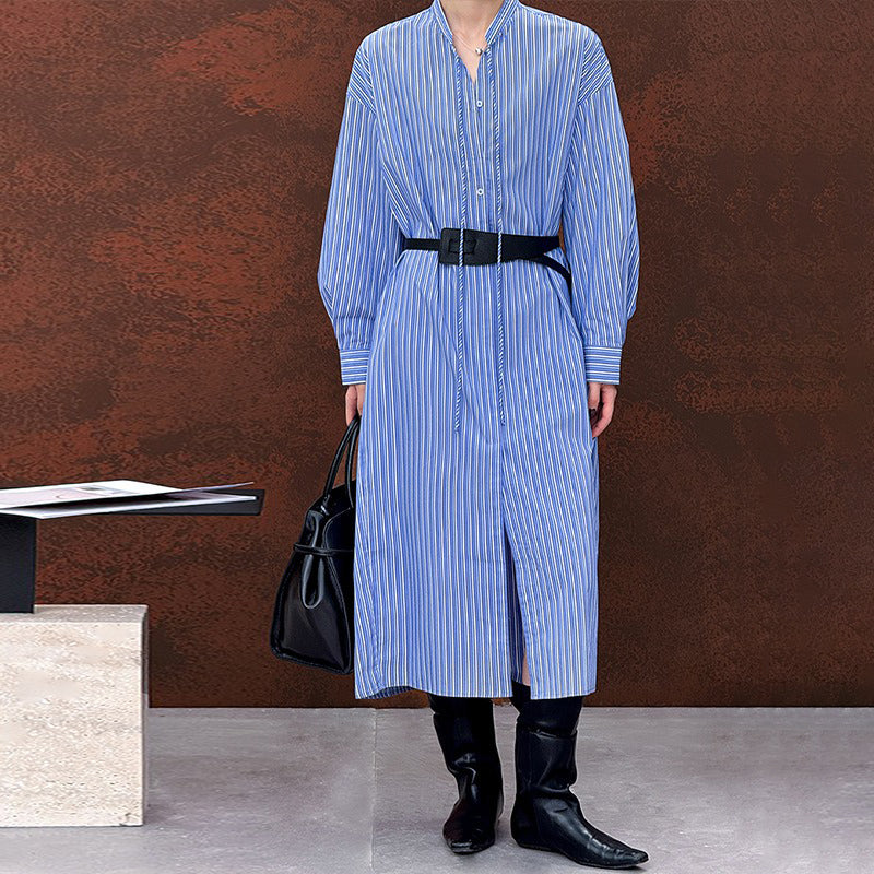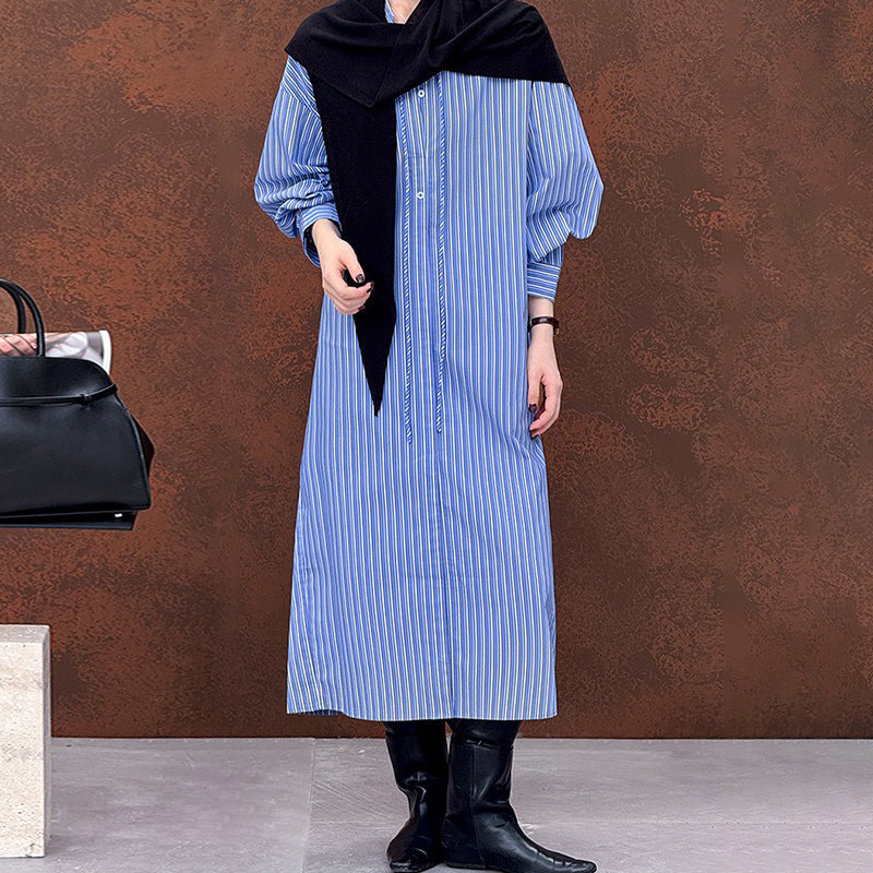 【ワンピース】秋先取り ロング丈 ストライプ 開襟長袖 シャツワンピース ゆるっとおしゃれ 着痩せデザイン【JZシリーズ】