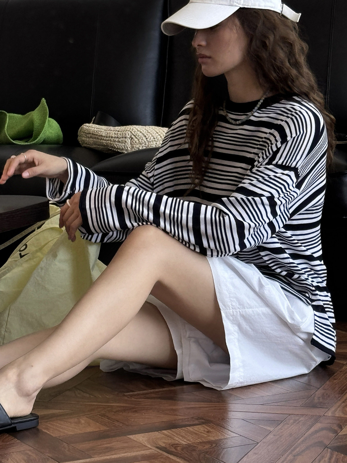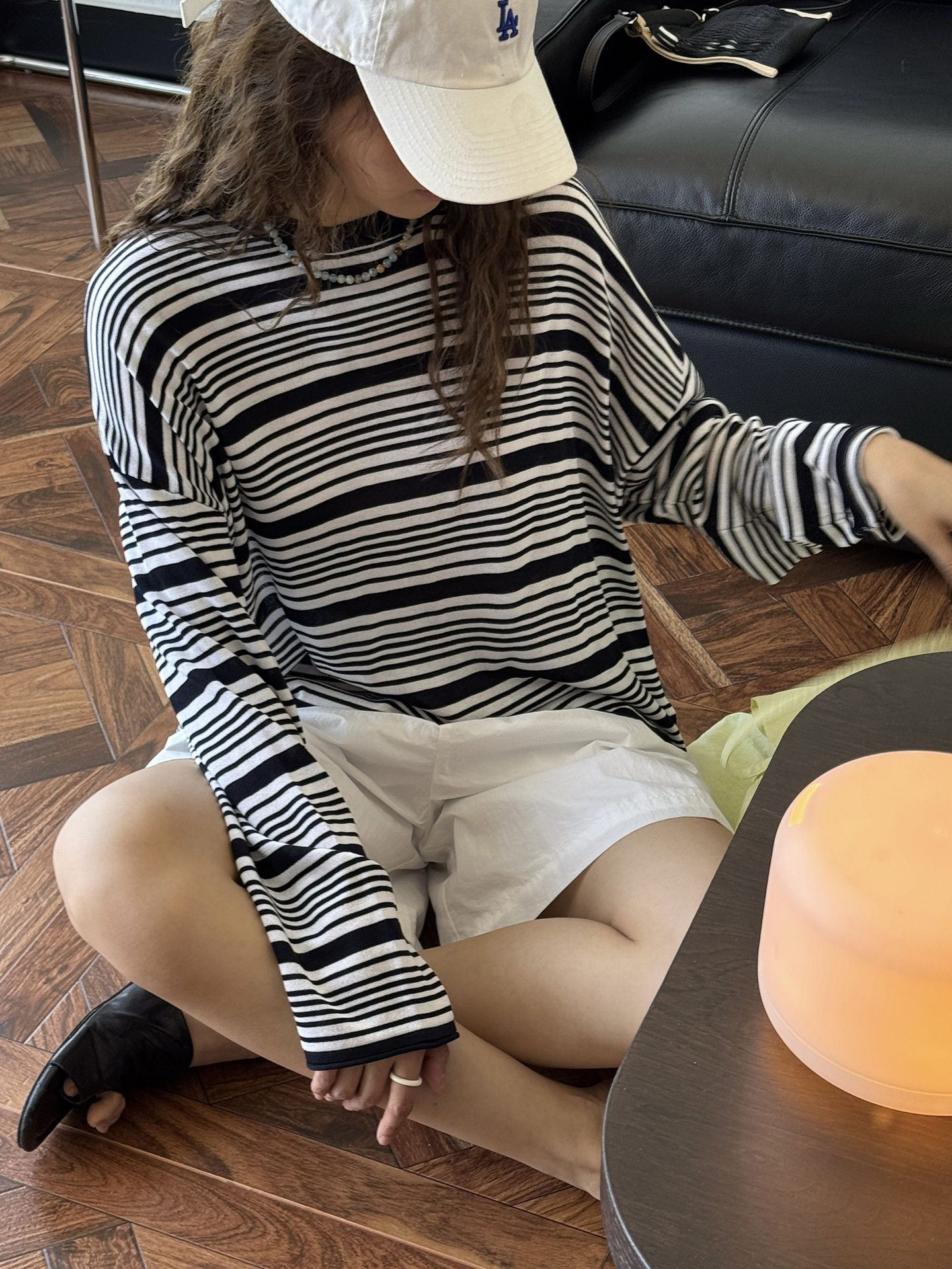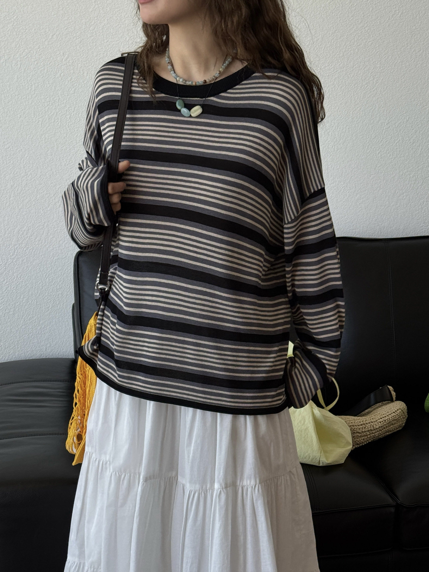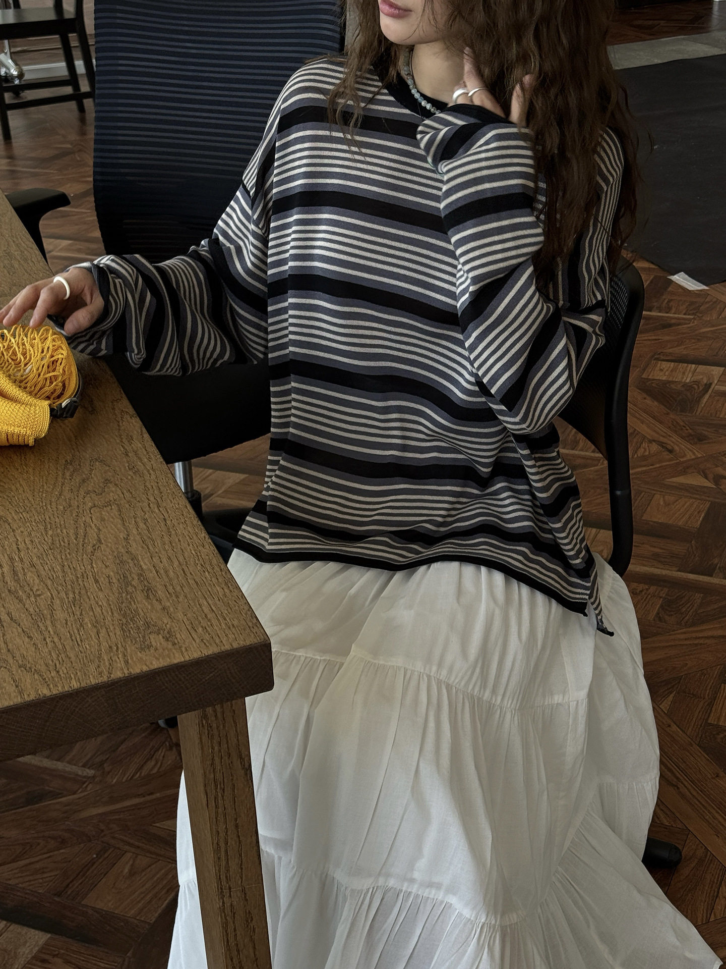 【トップス】初秋新作 韓国風ゆる感シルエット×ランダムボーダー柄 Tシャツ【JZシリーズ】