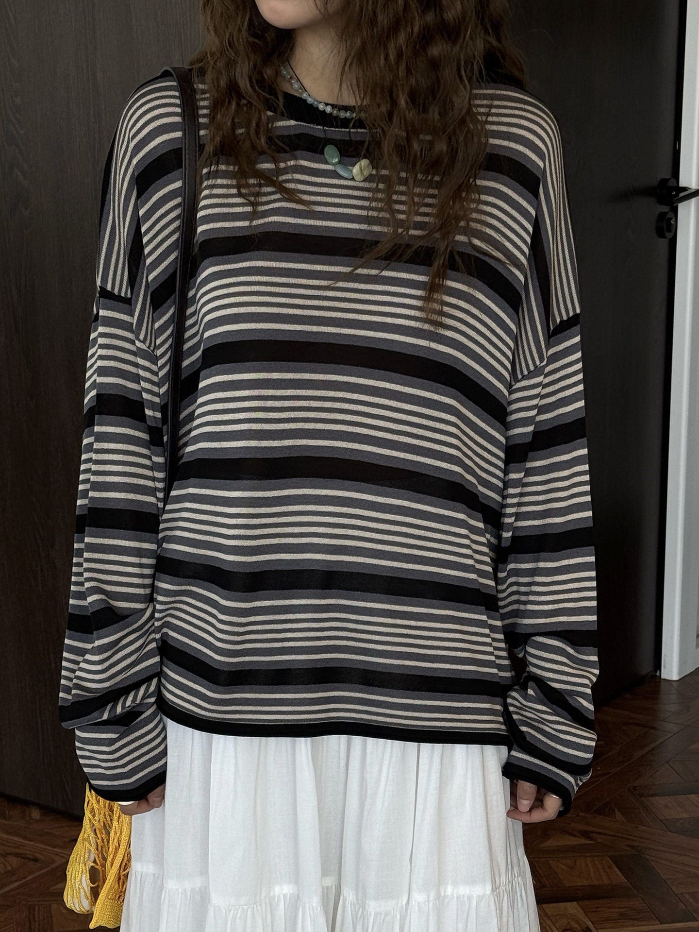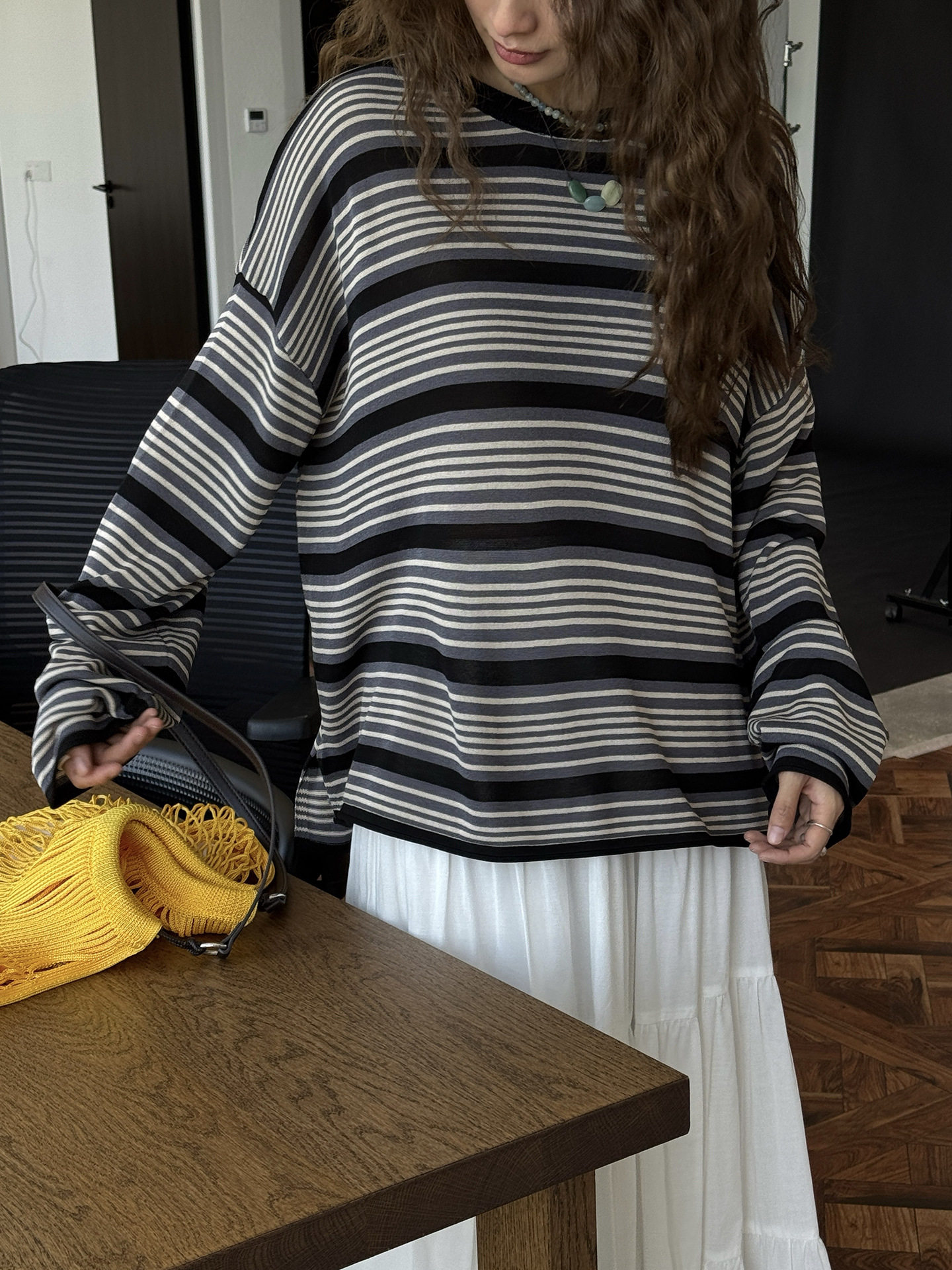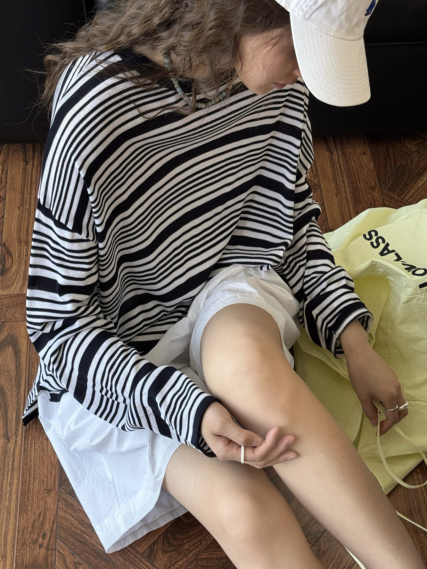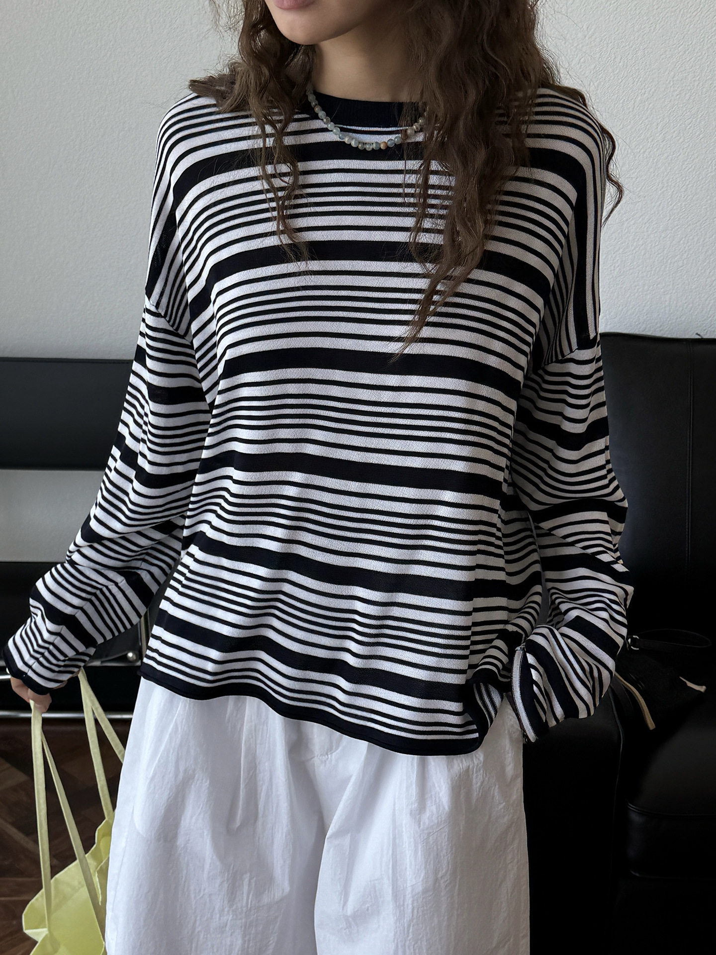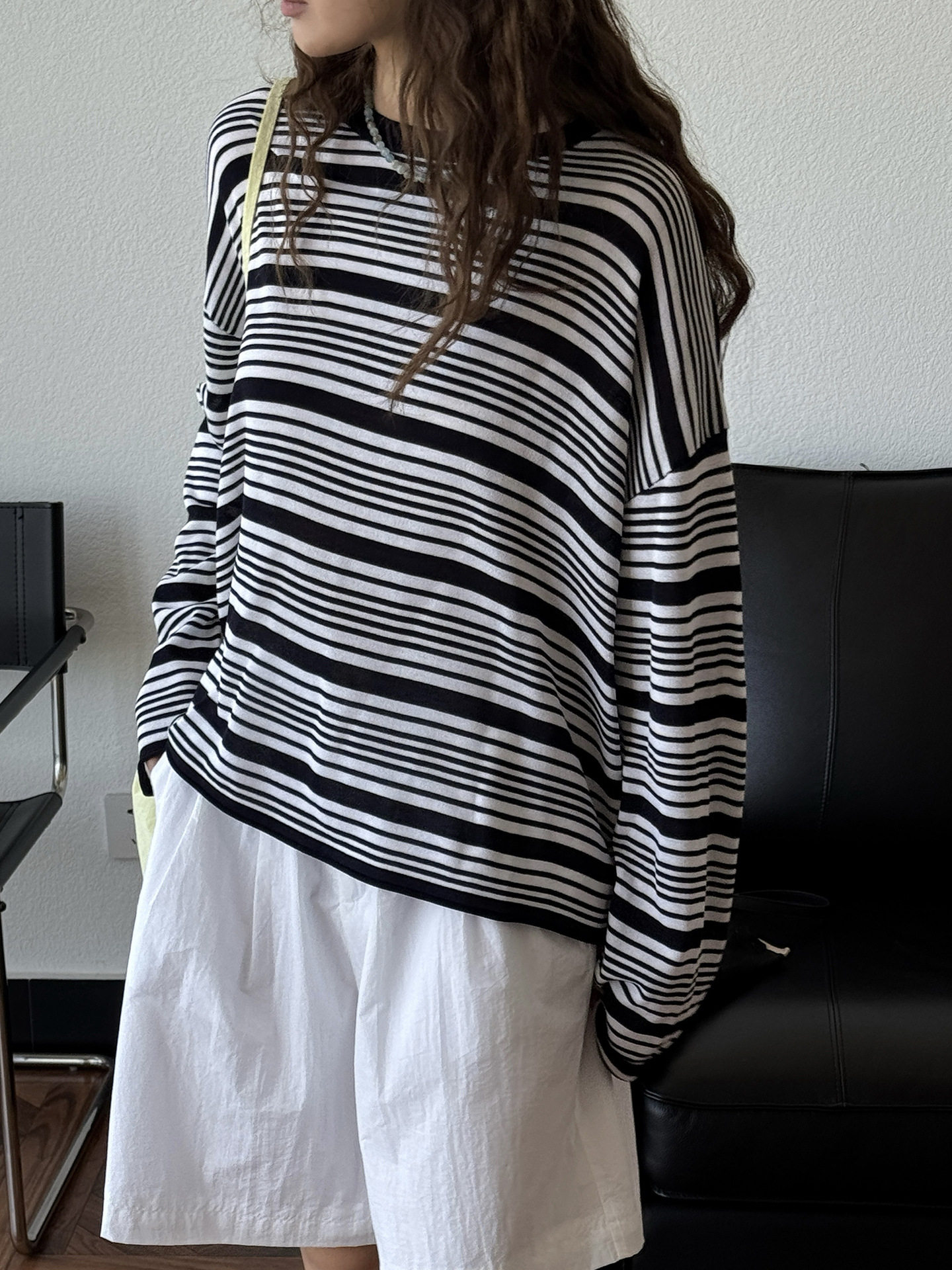 【トップス】初秋新作 韓国風ゆる感シルエット×ランダムボーダー柄 Tシャツ【JZシリーズ】