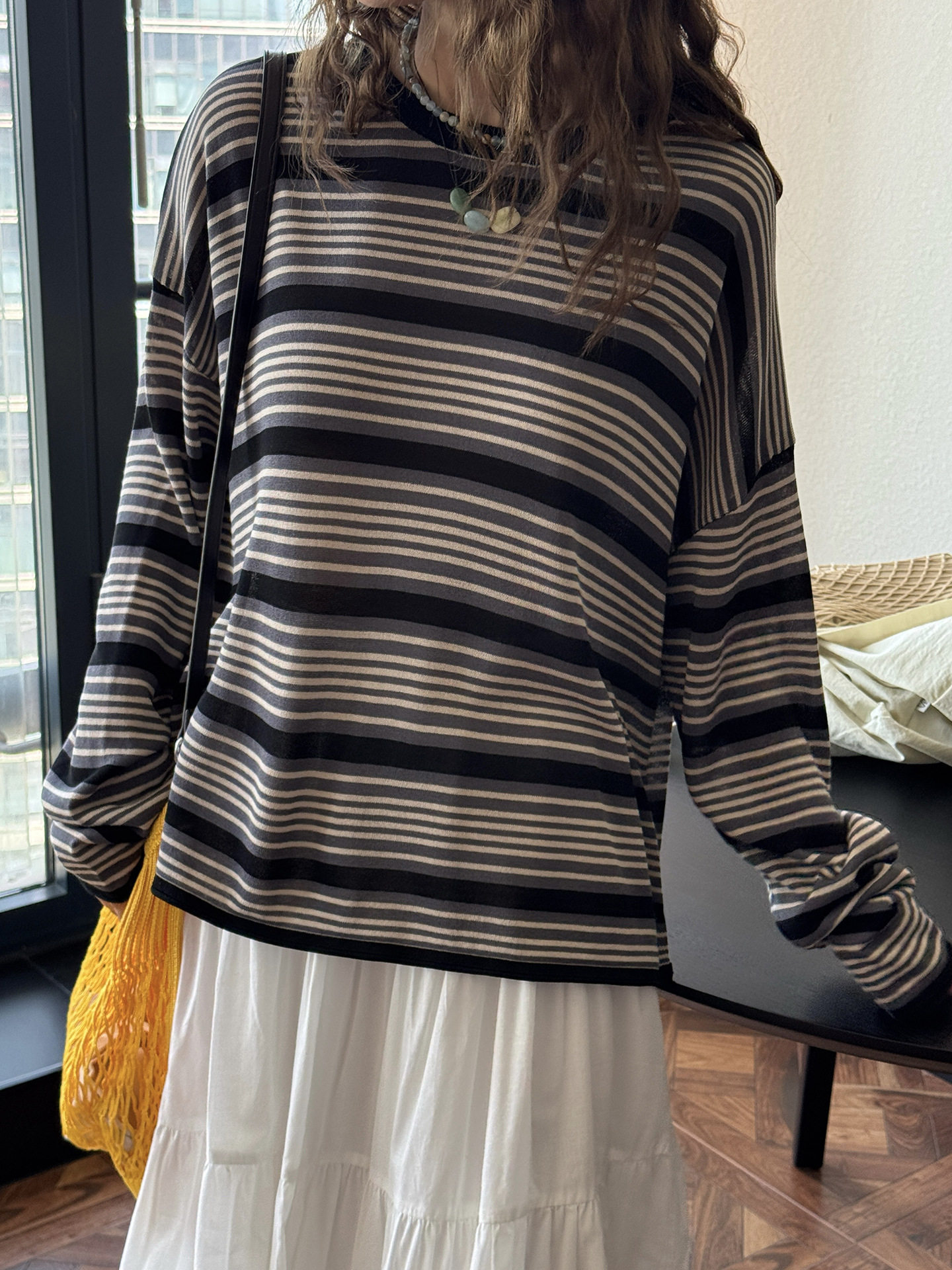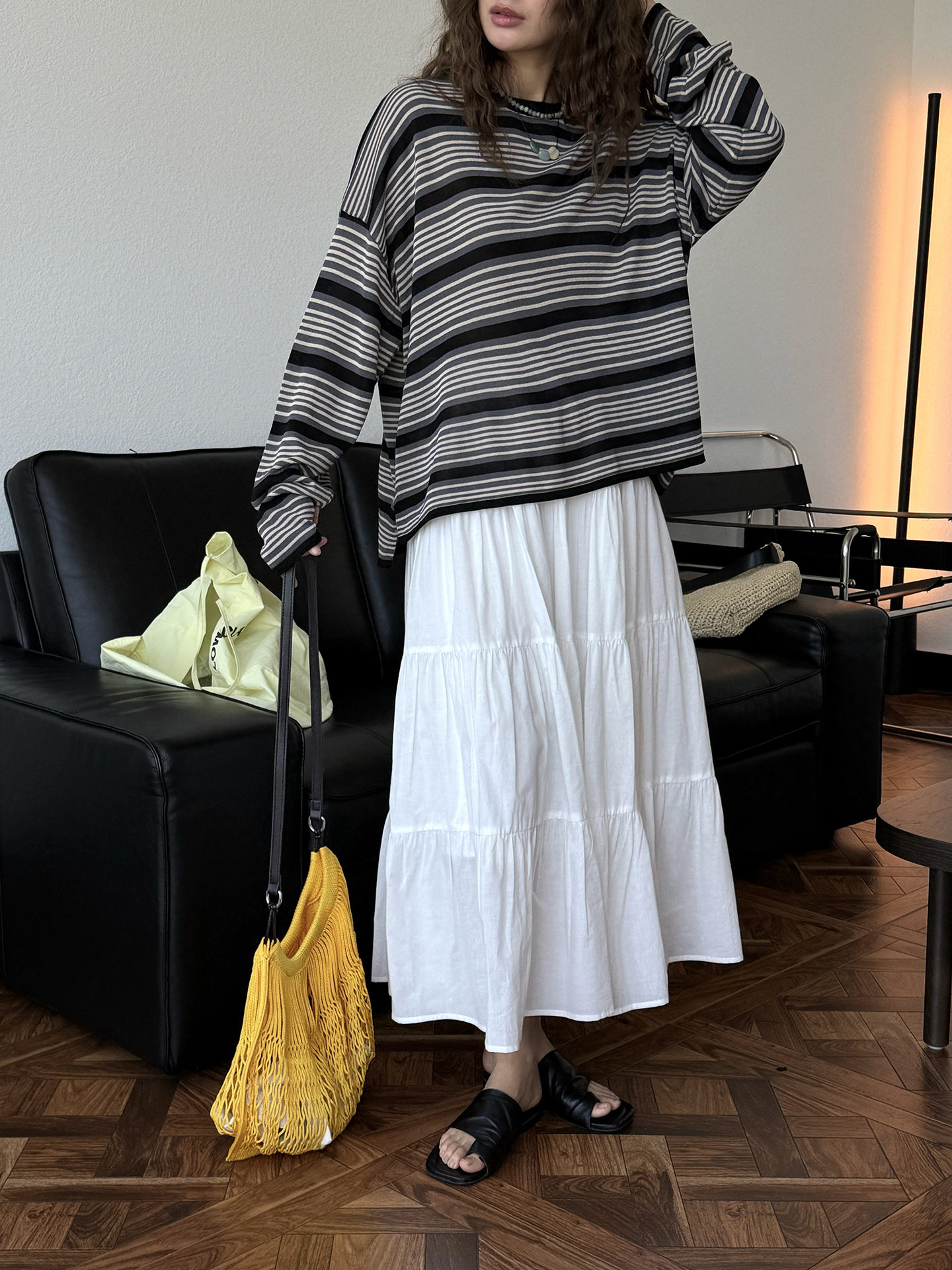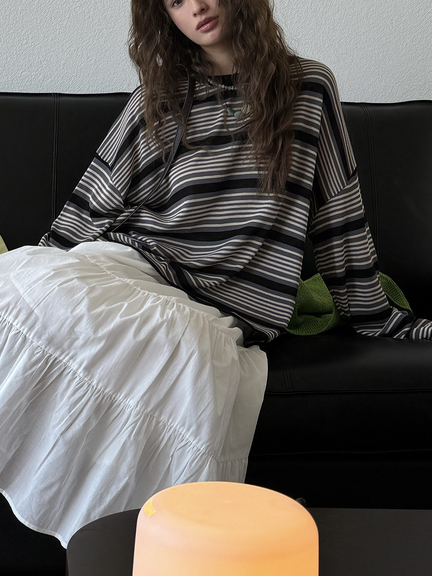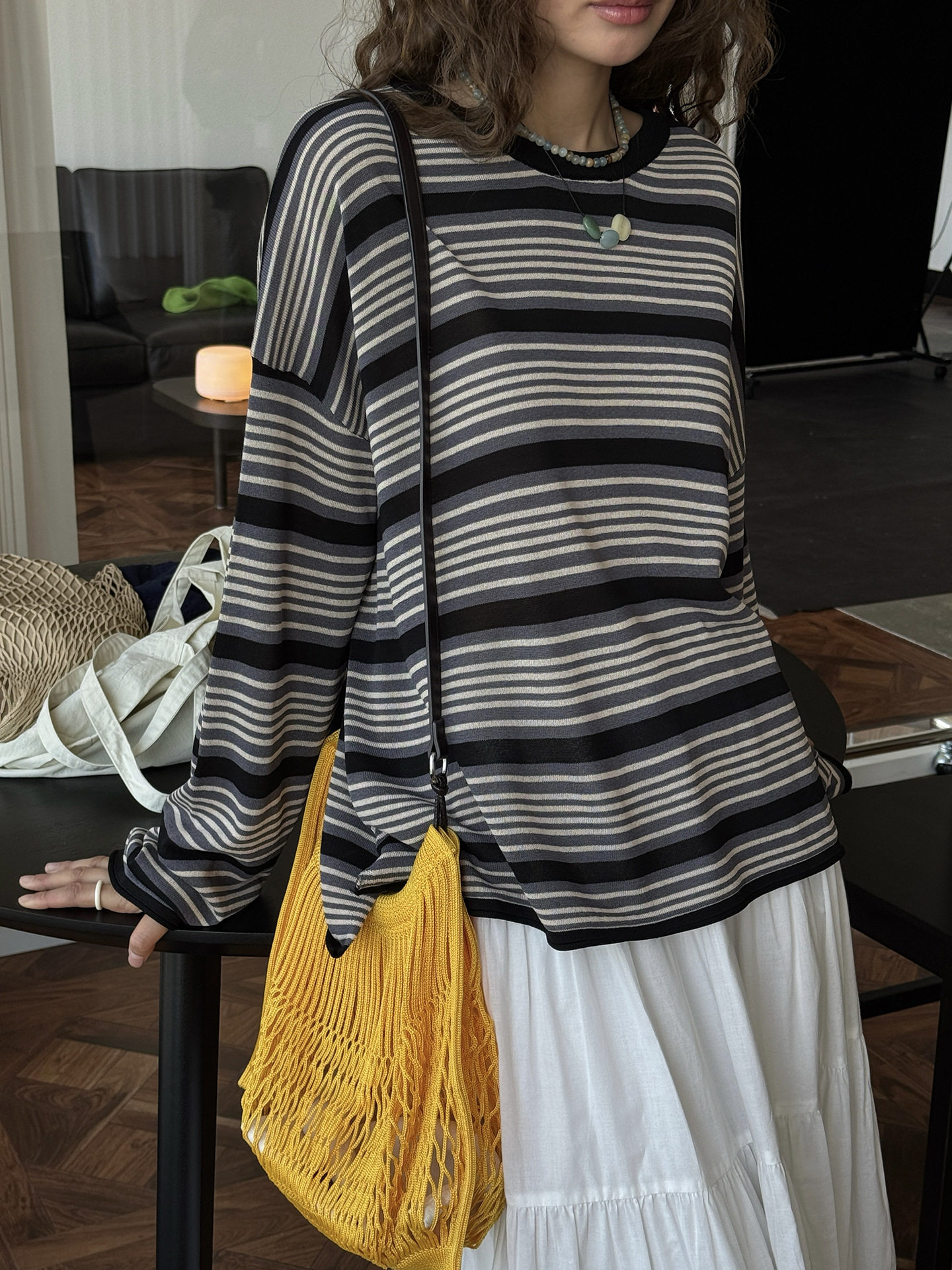 【トップス】初秋新作 韓国風ゆる感シルエット×ランダムボーダー柄 Tシャツ【JZシリーズ】