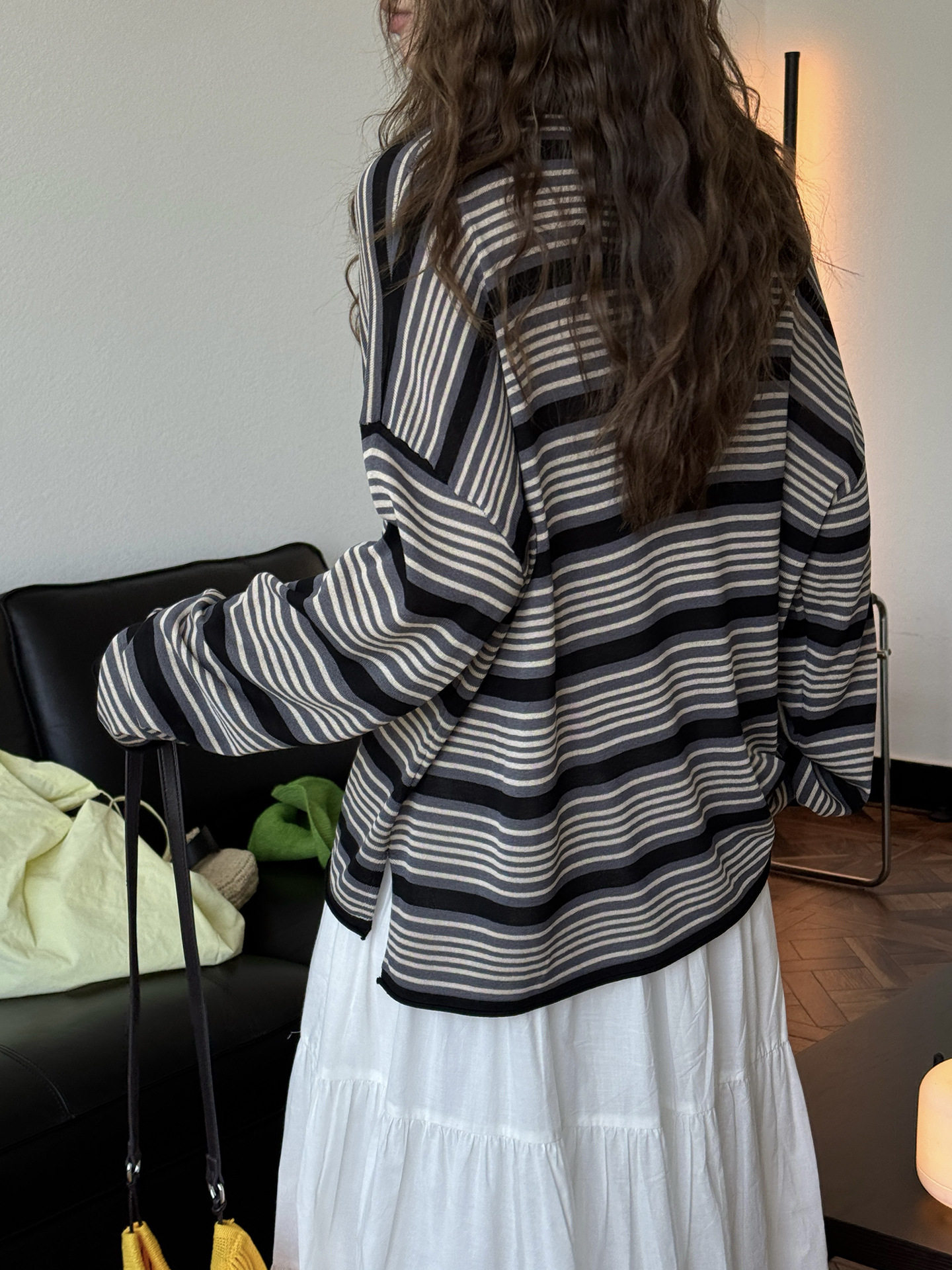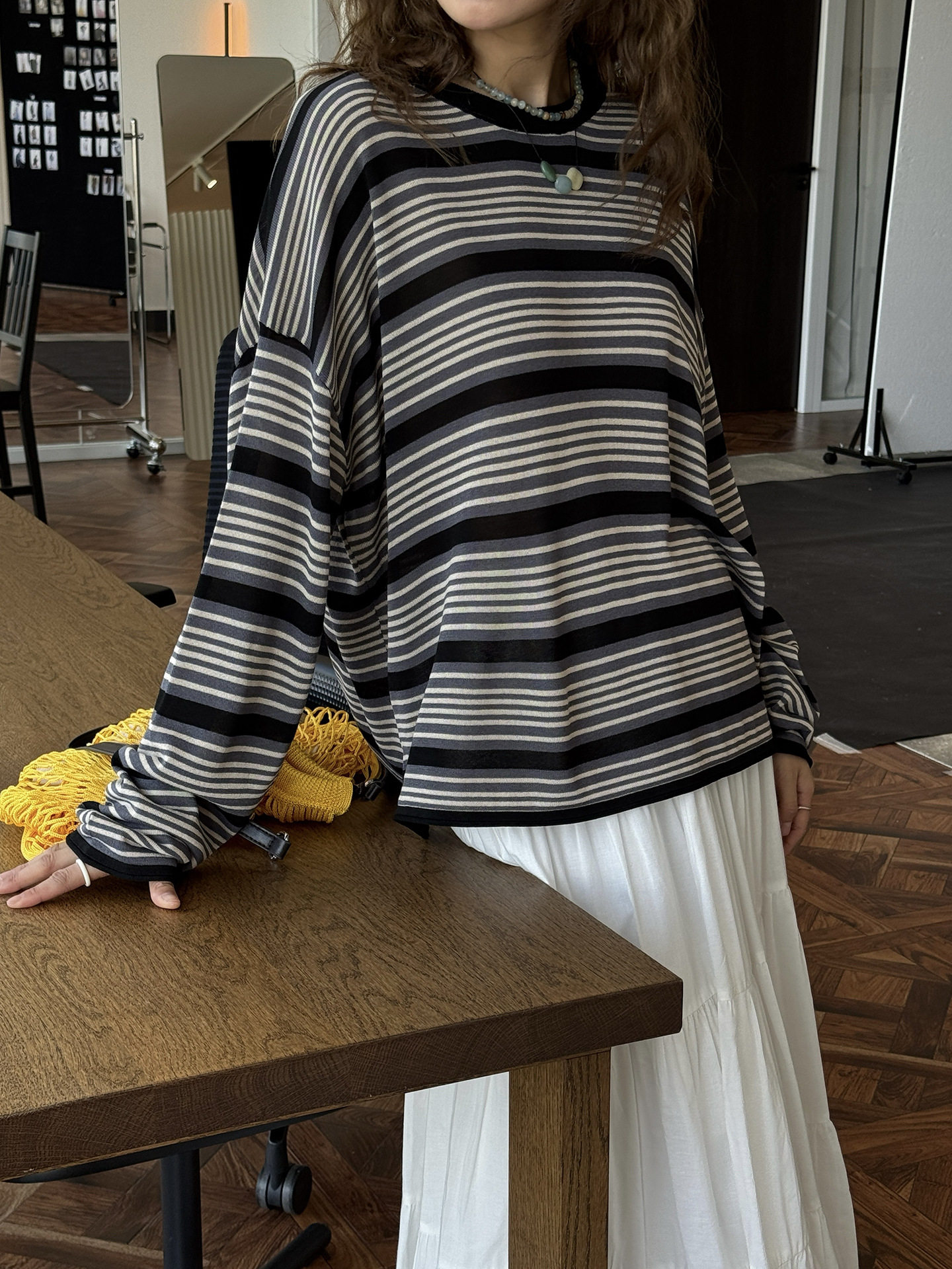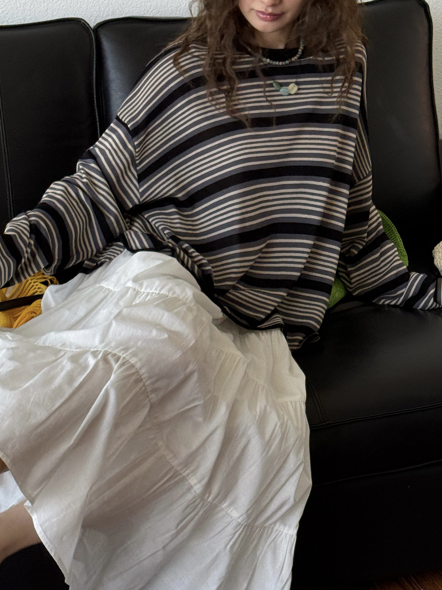【商品名】【トップス】初秋新作 韓国風ゆる感シルエット×ランダムボーダー柄 Tシャツ【JZシリーズ】