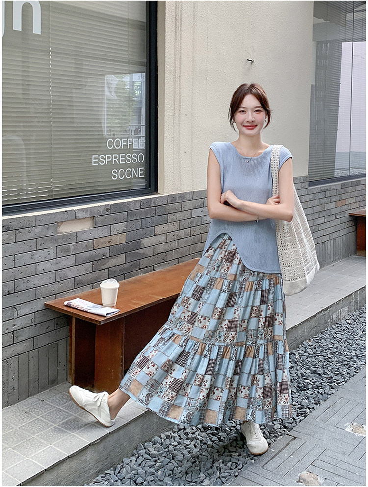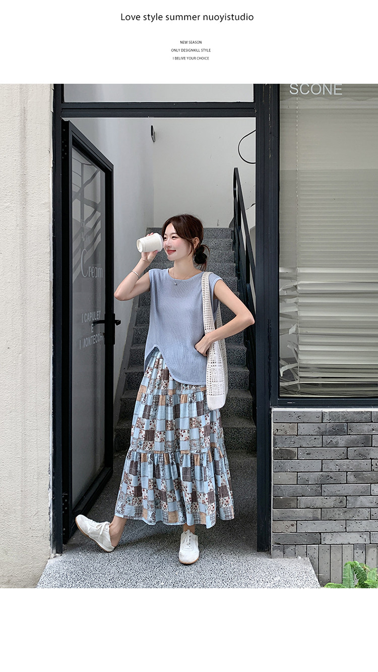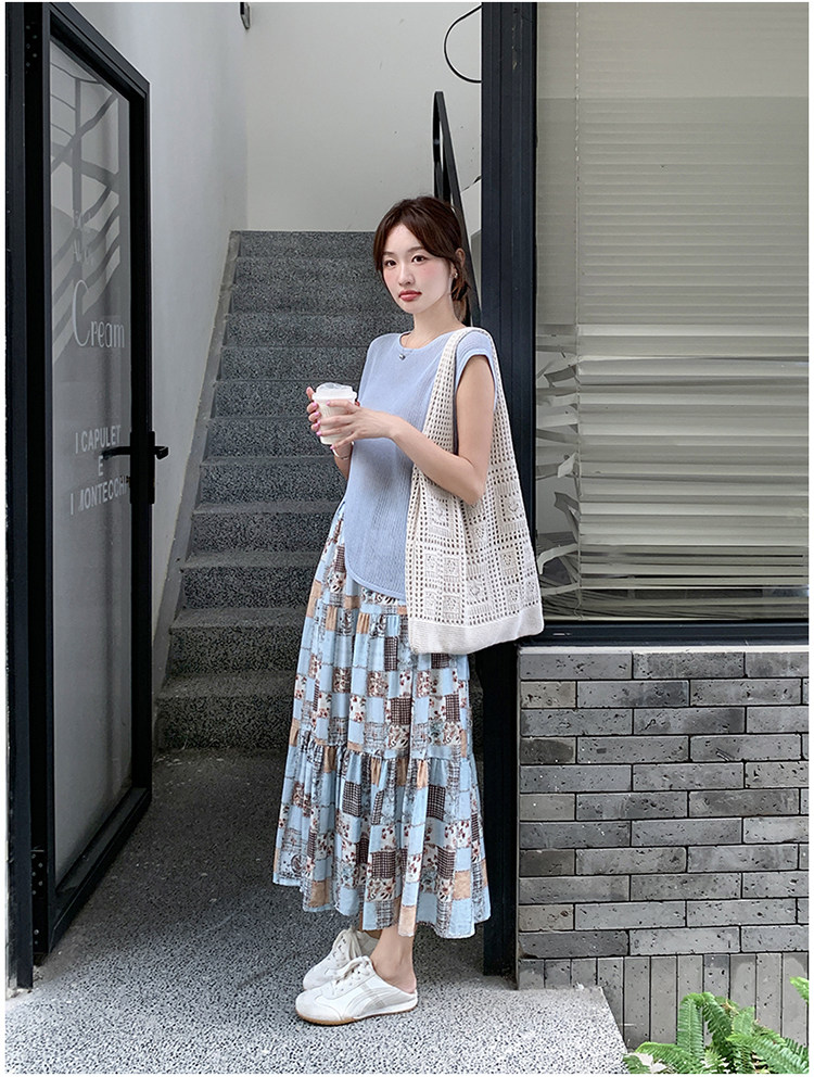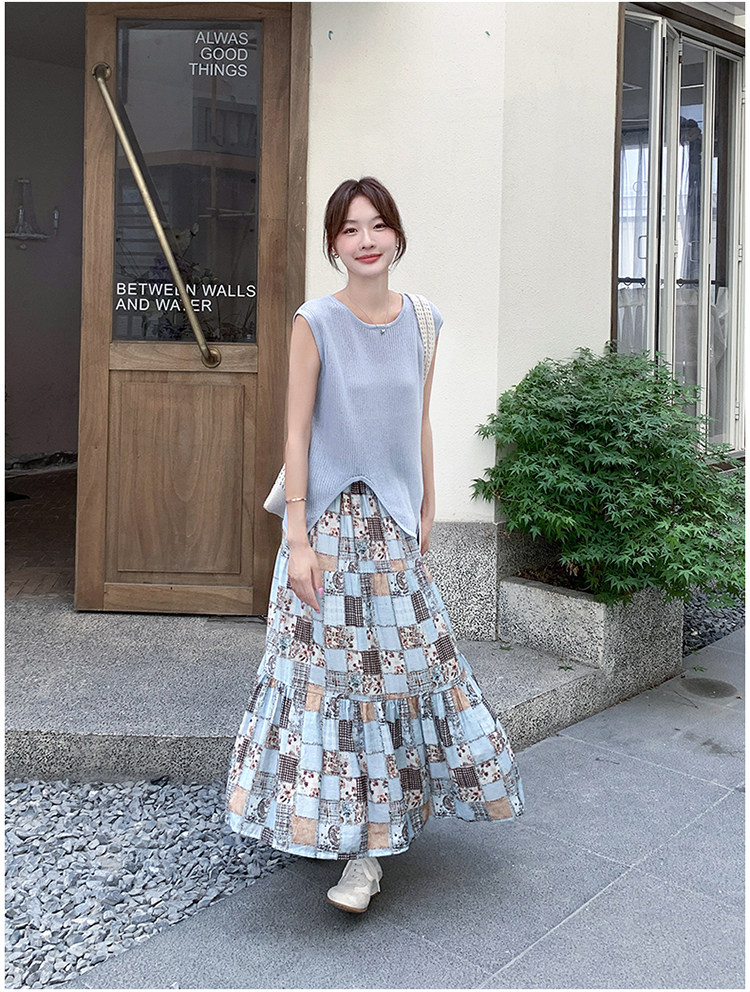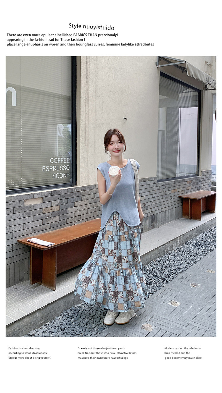 2点セット!【セットアップ】個性派ノースリーブニットトップス+花柄切り替えミモレ丈スカート 上下セット【SHシリーズ】