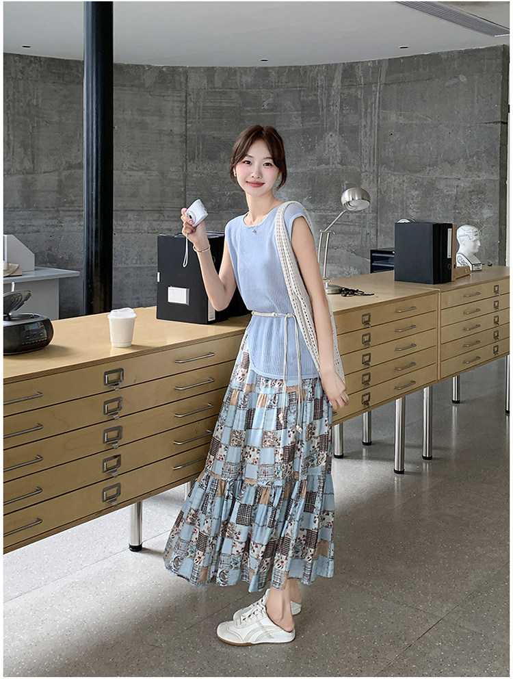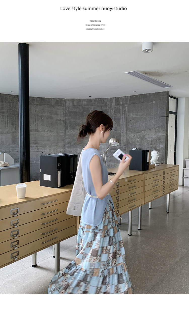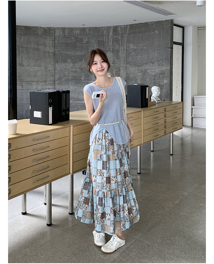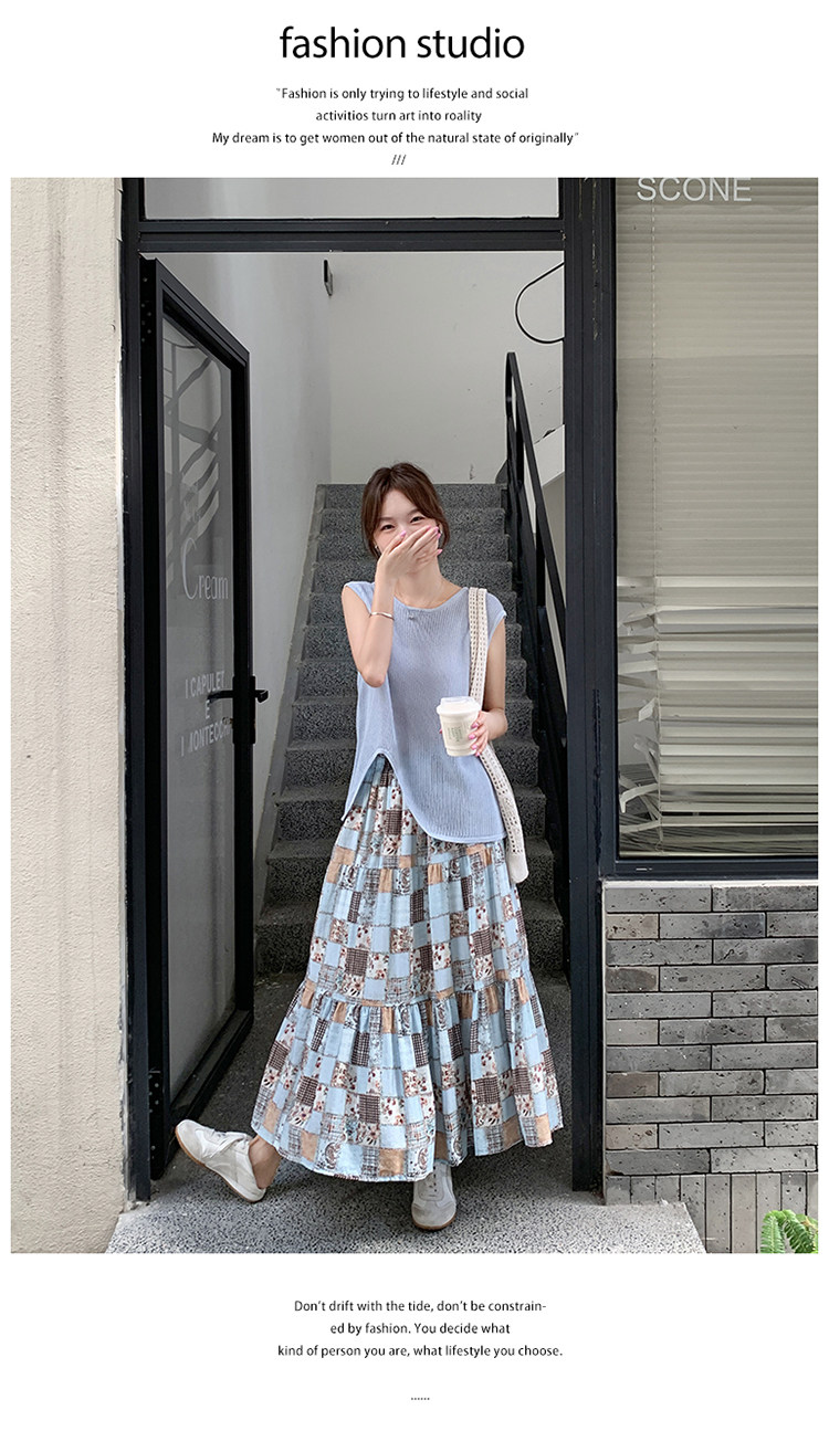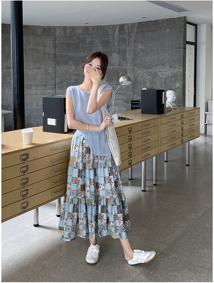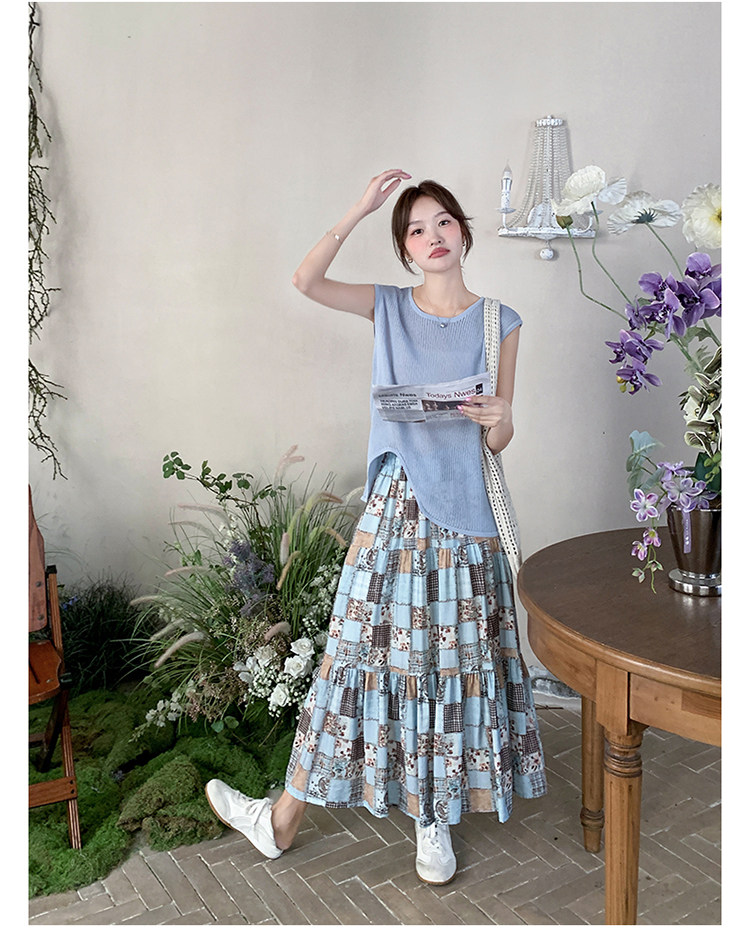 2点セット!【セットアップ】個性派ノースリーブニットトップス+花柄切り替えミモレ丈スカート 上下セット【SHシリーズ】