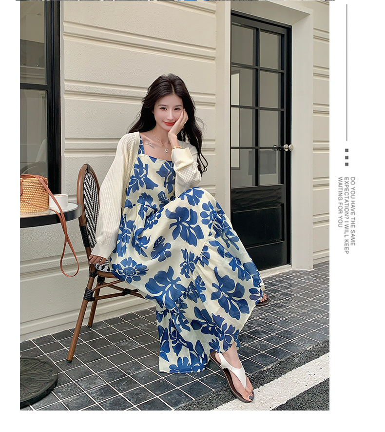 【ワンピース】韓国風 春秋新作 ゆったり大きめサイズ 体型カバー 花柄長袖ミディアムワンピース【SHシリーズ】
