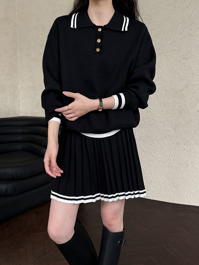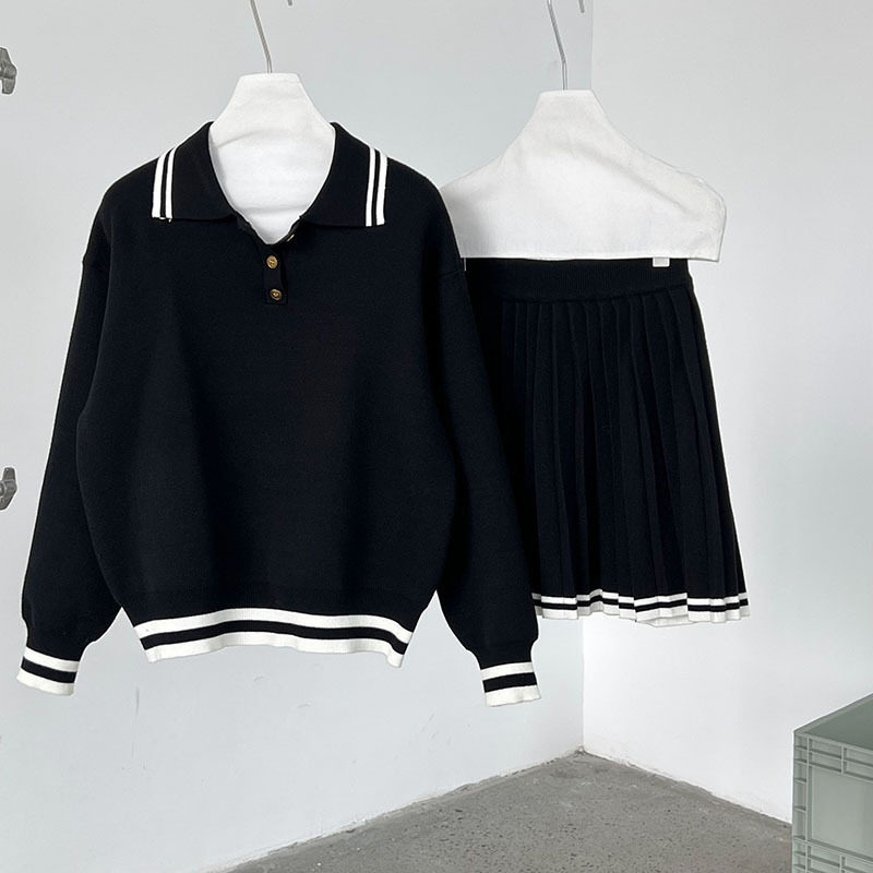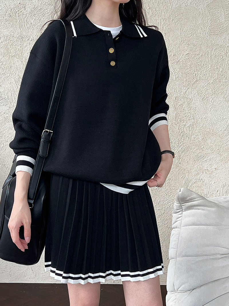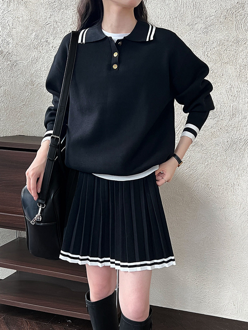 2点セット!【セットアップ】秋新作 学院風 上下セット ポロ襟スウェット+ハイウエストプリーツミニスカート【JZシリーズ】