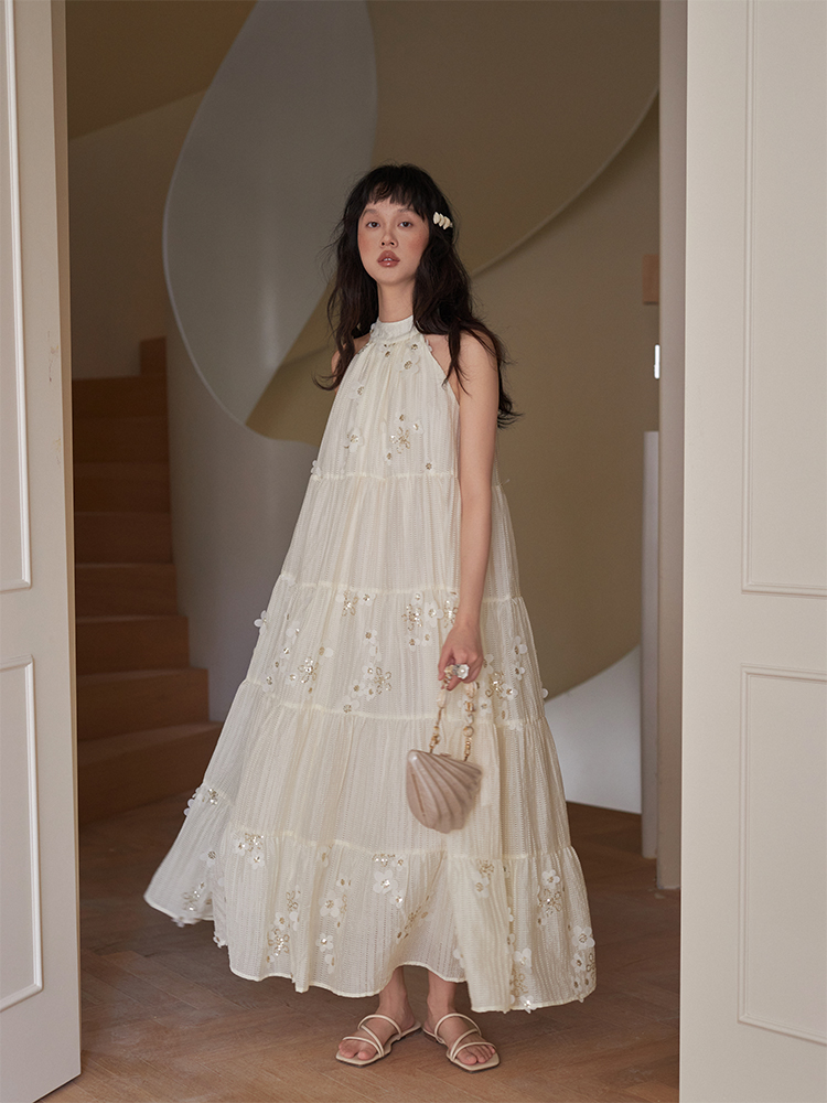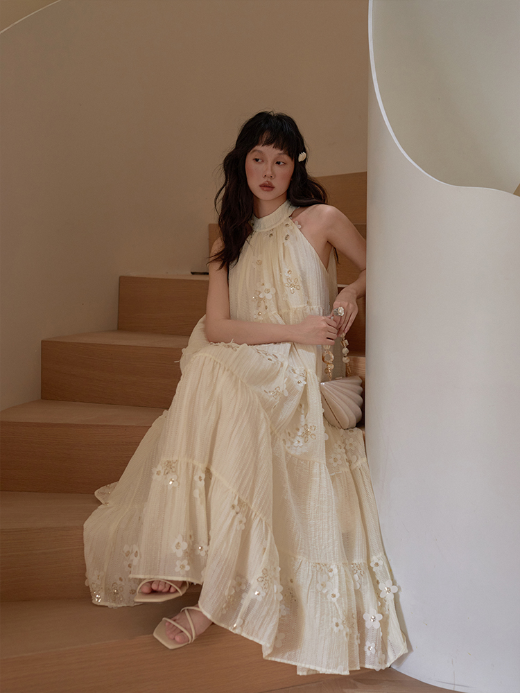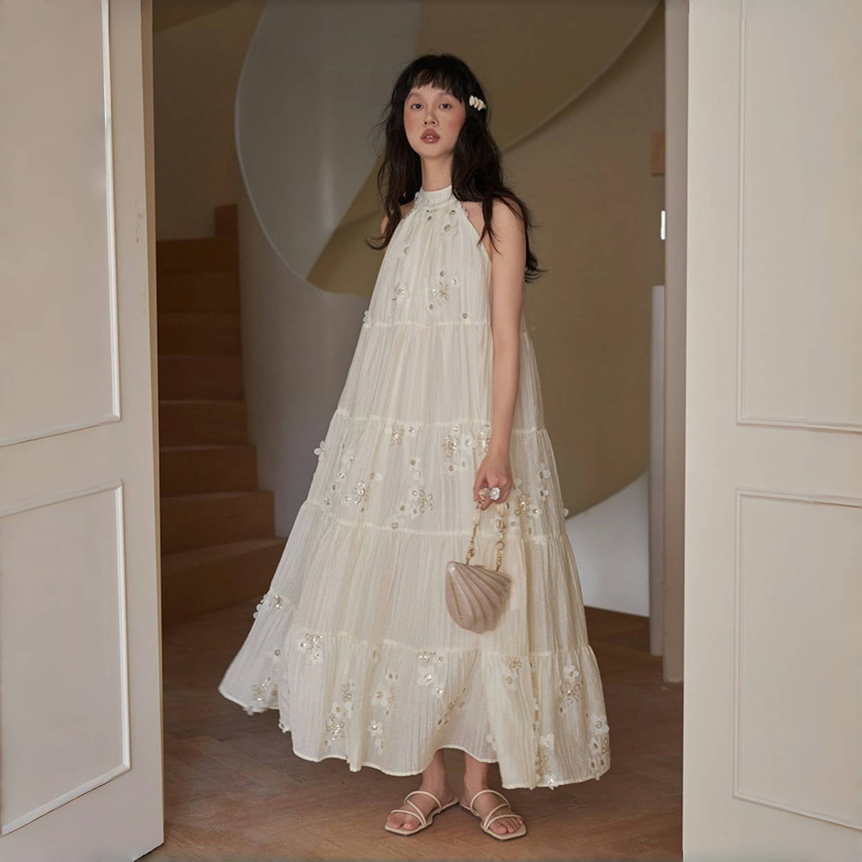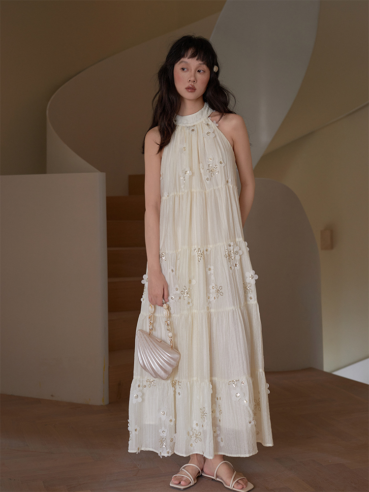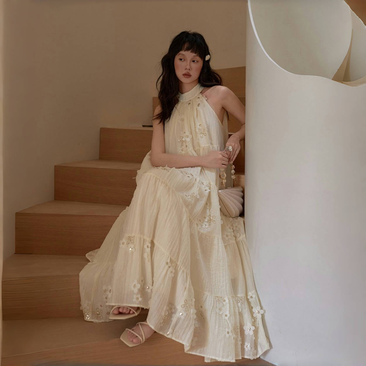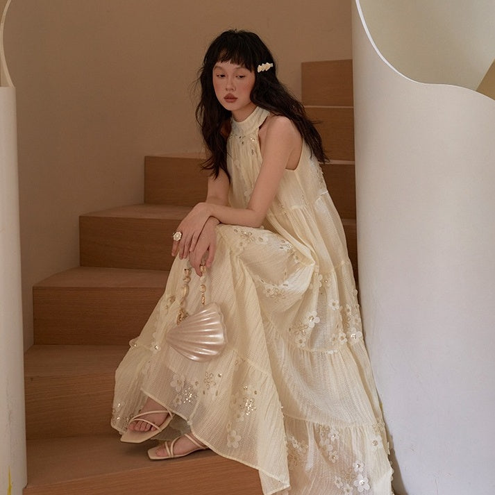 【商品名】【ワンピース】夏 刺繍 エレガント 花柄スパンコール ホルターネック ノースリーブ ワンピース 【SHシリーズ】