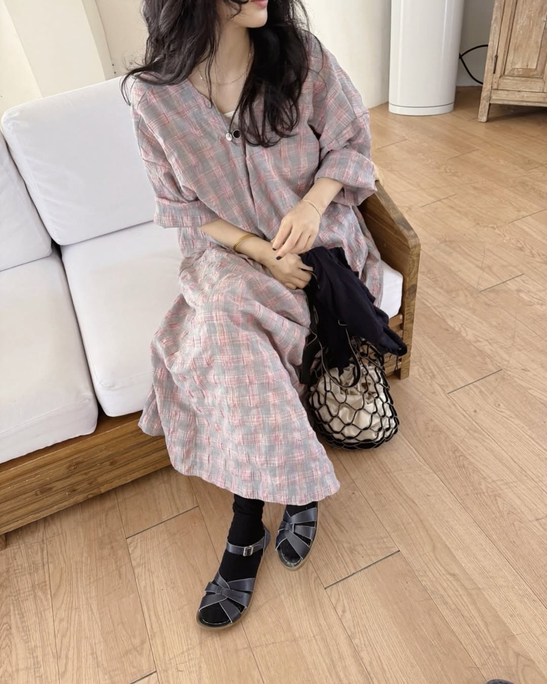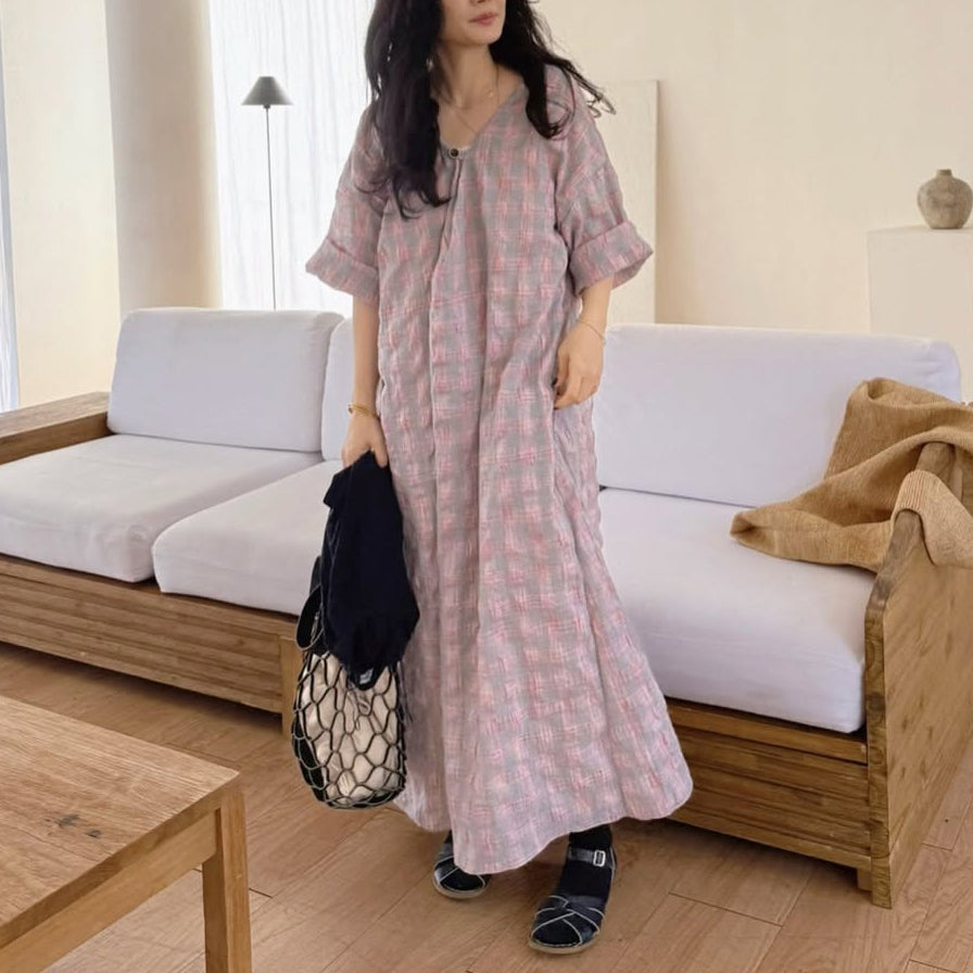 【商品名】【ワンピース】配色チェック柄 半袖ワンピース|肌触りの良い ゆったり 体型カバーも叶うロング丈【SHシリーズ】