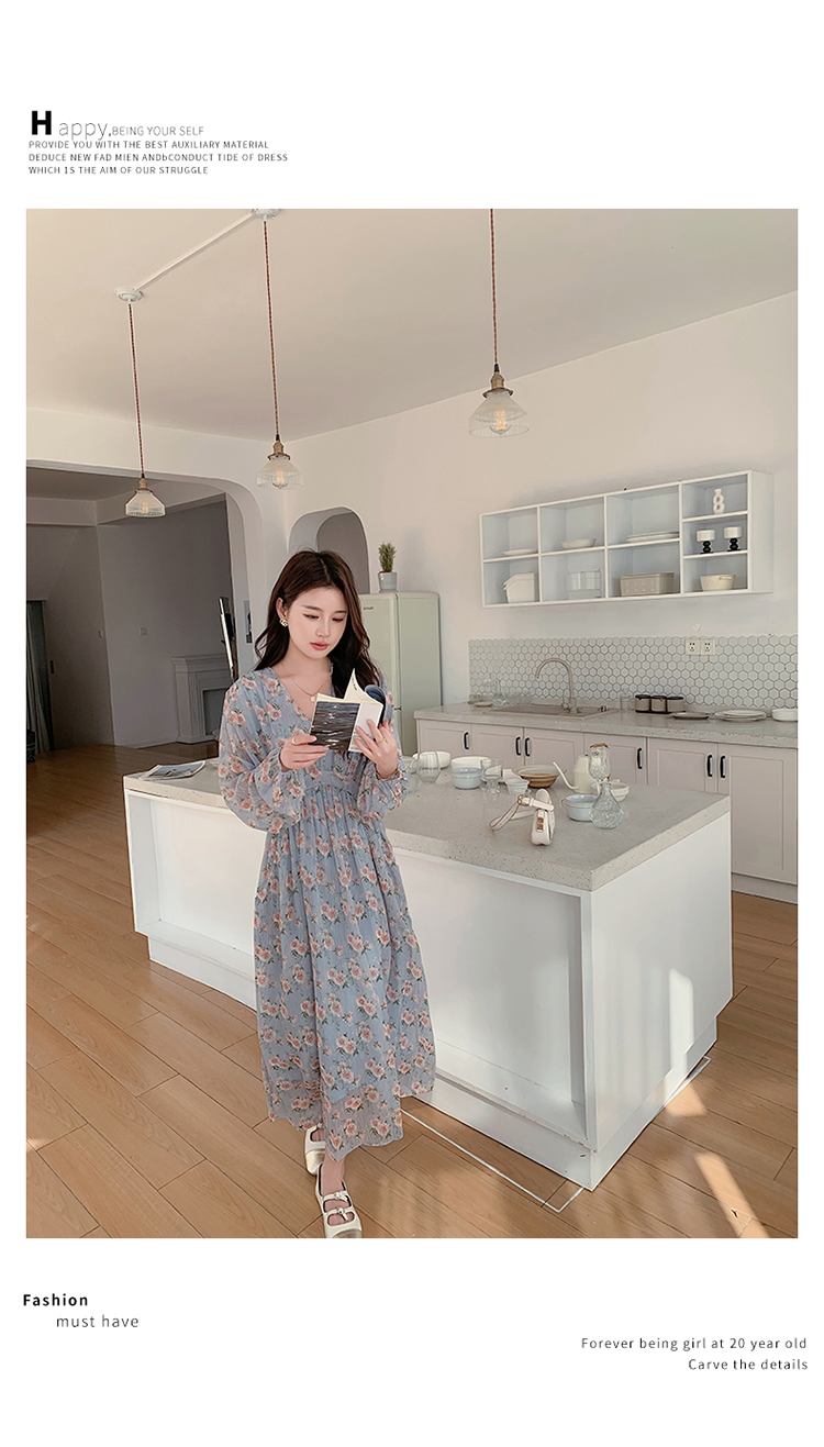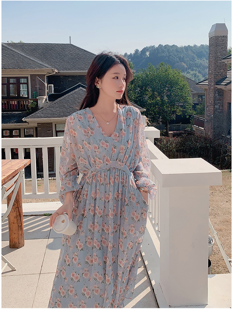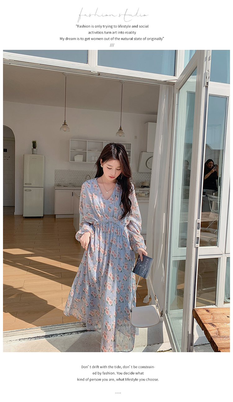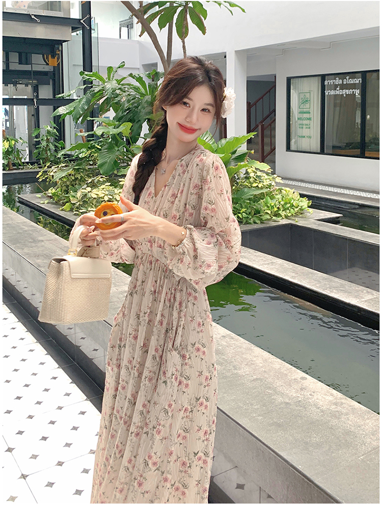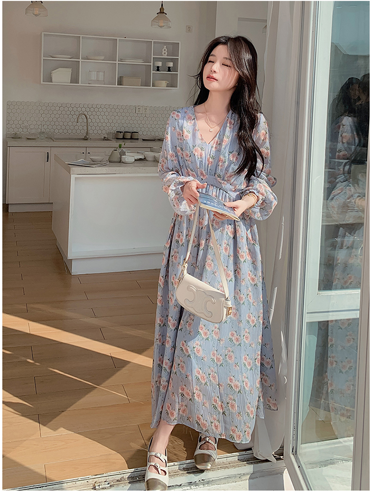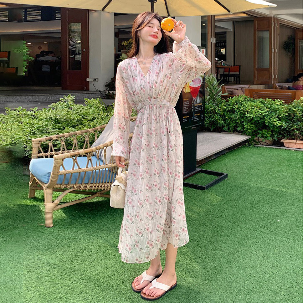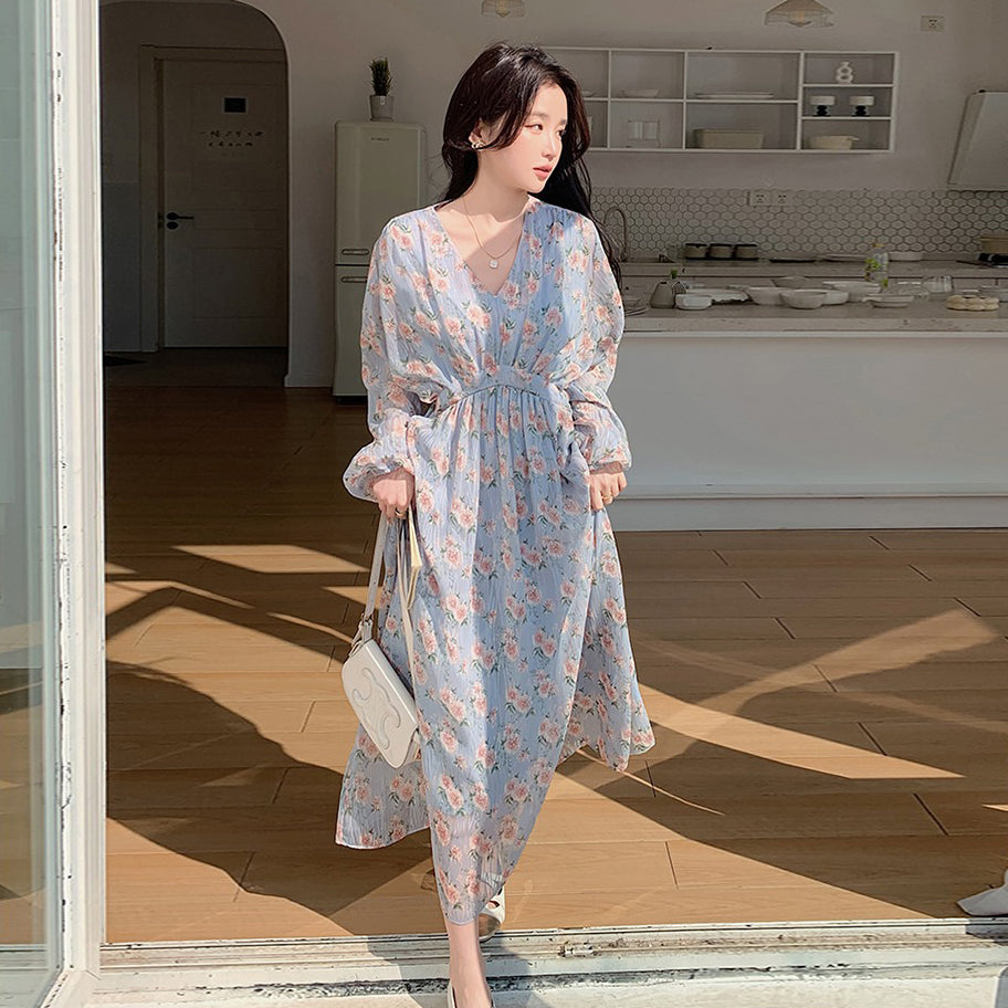 【ワンピース】フレンチ 花柄 長袖ワンピース|韓国風マキシ丈ワンピース・足首まで届く絶美シルエット【SHシリーズ】