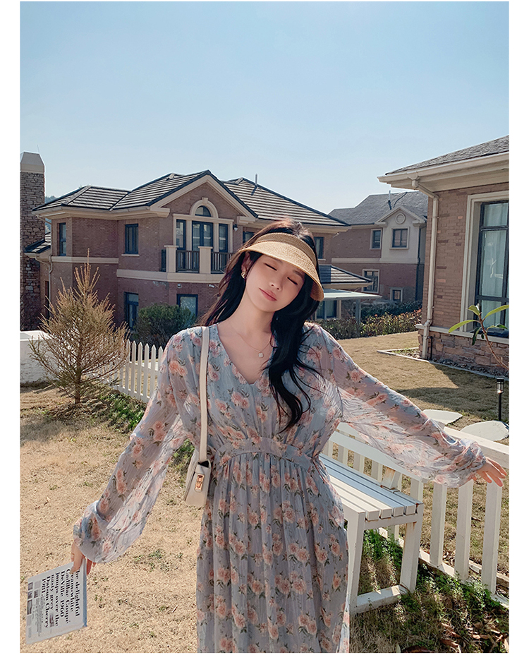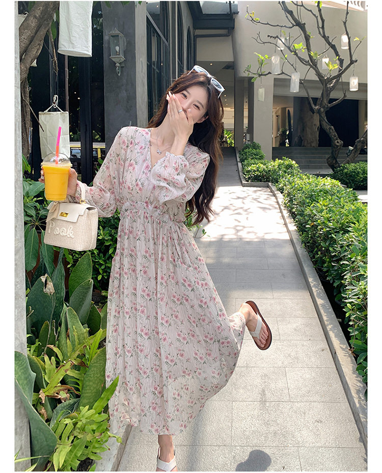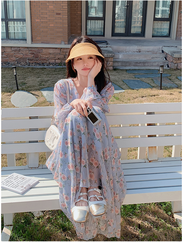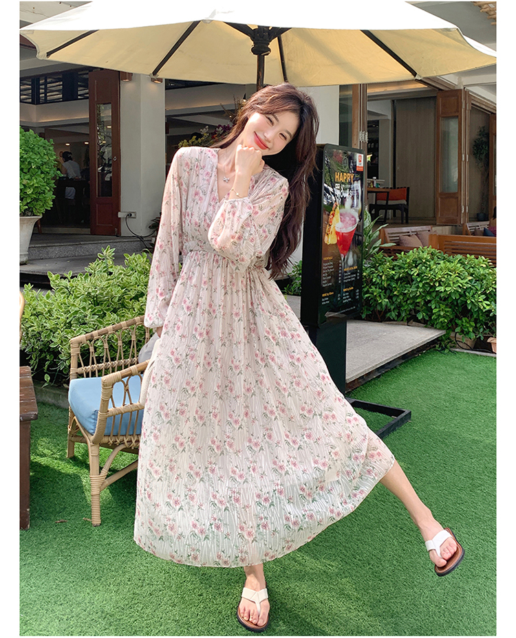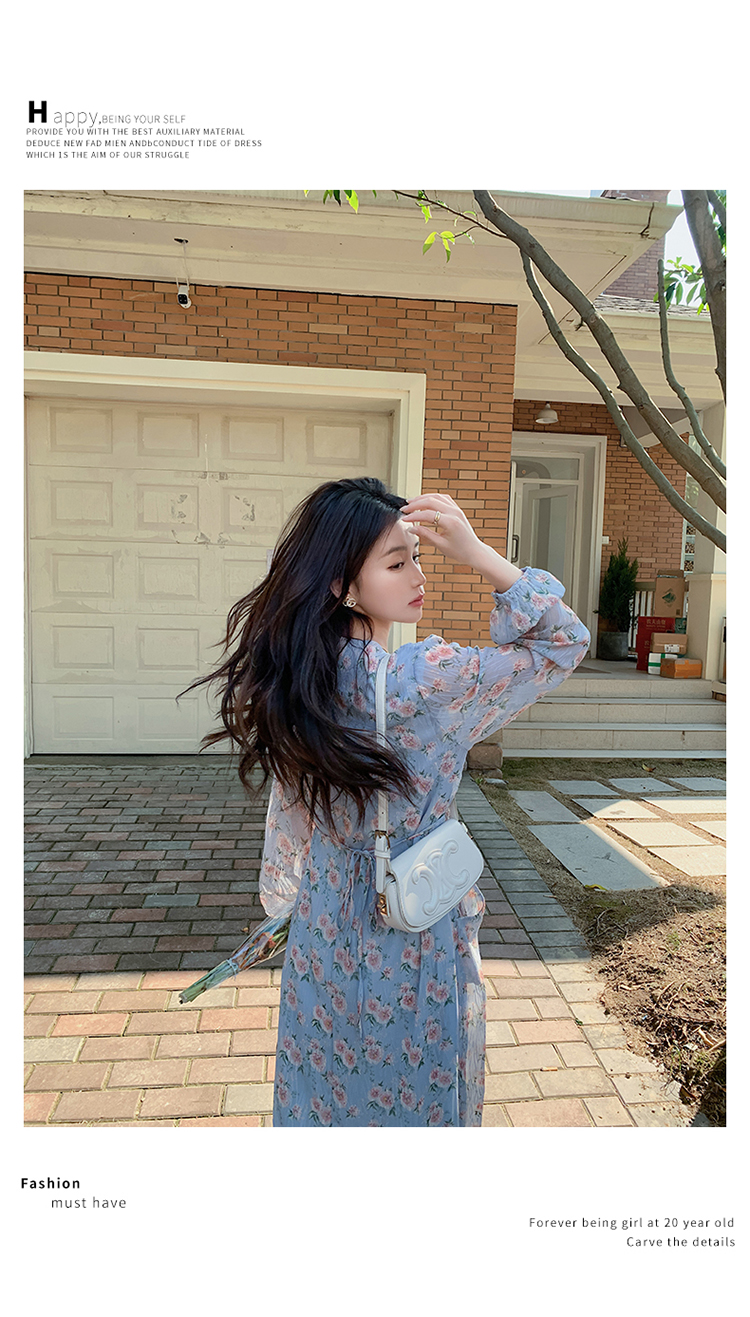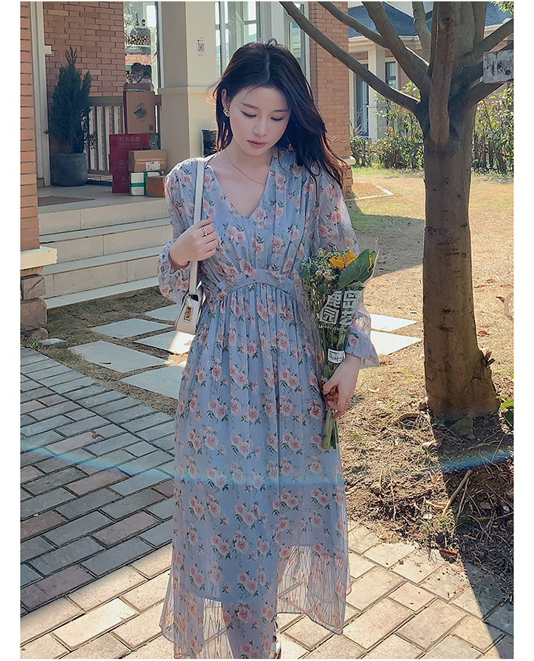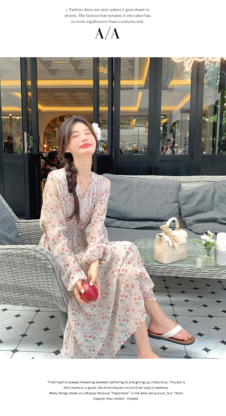 【ワンピース】フレンチ 花柄 長袖ワンピース|韓国風マキシ丈ワンピース・足首まで届く絶美シルエット【SHシリーズ】