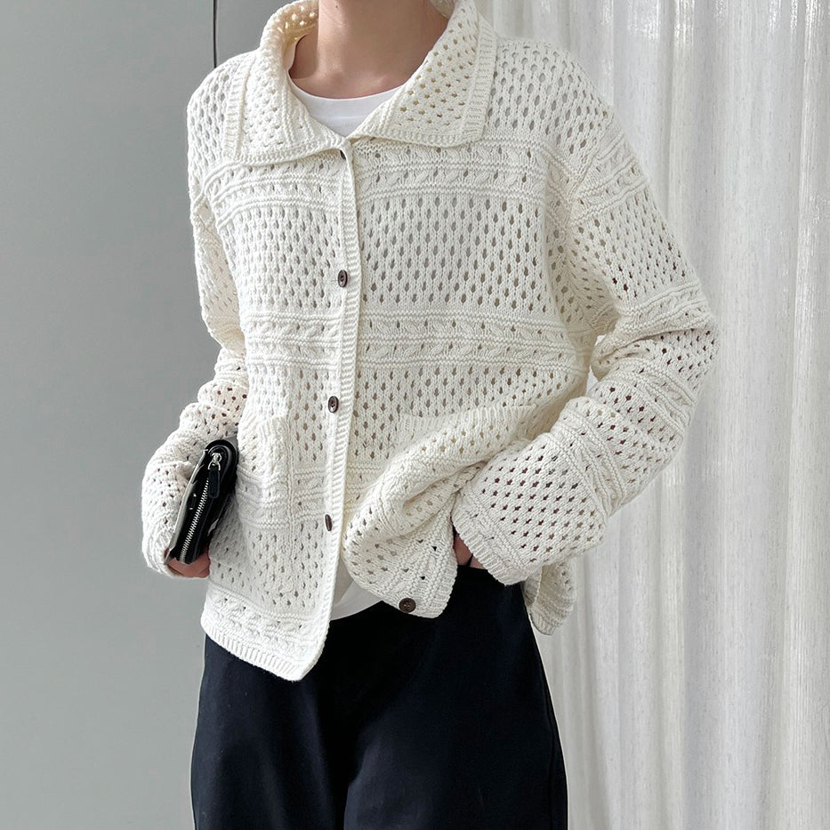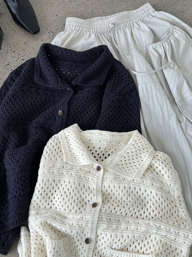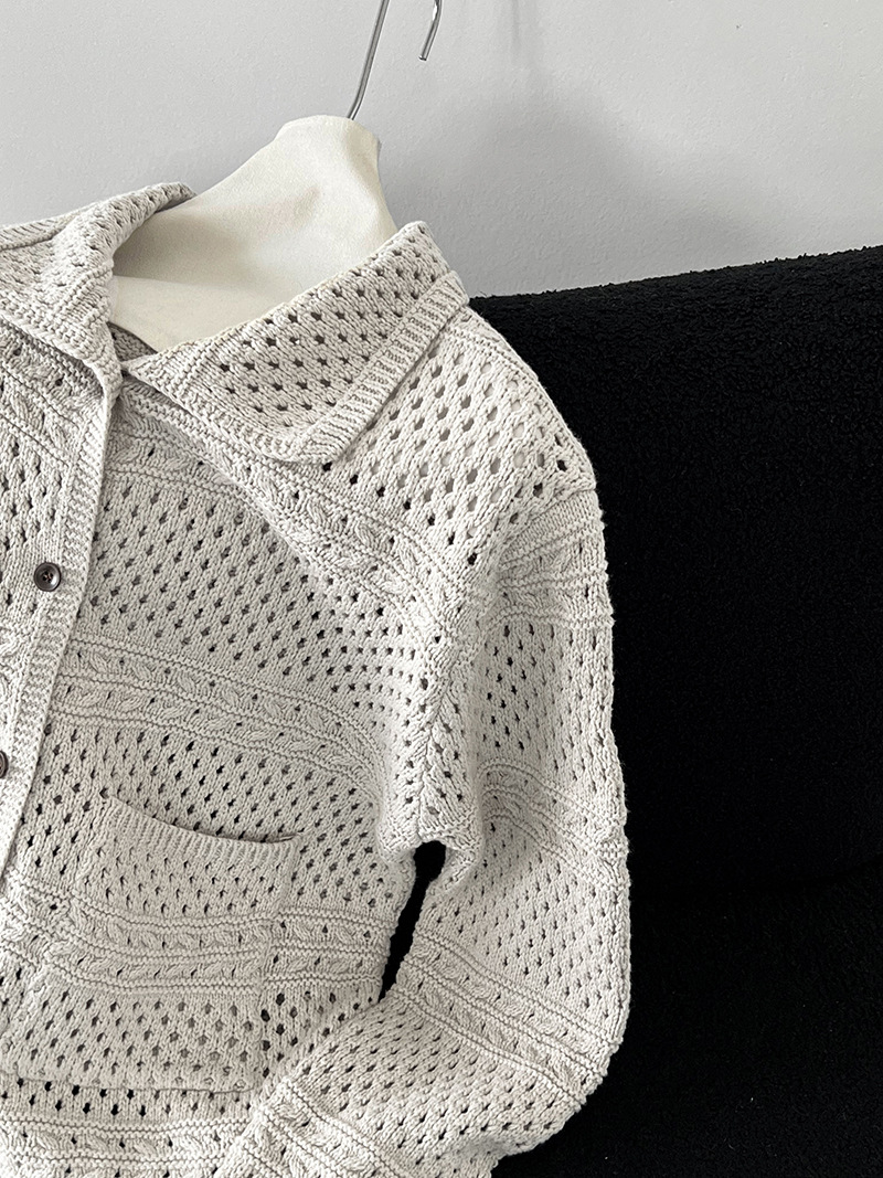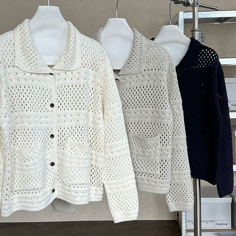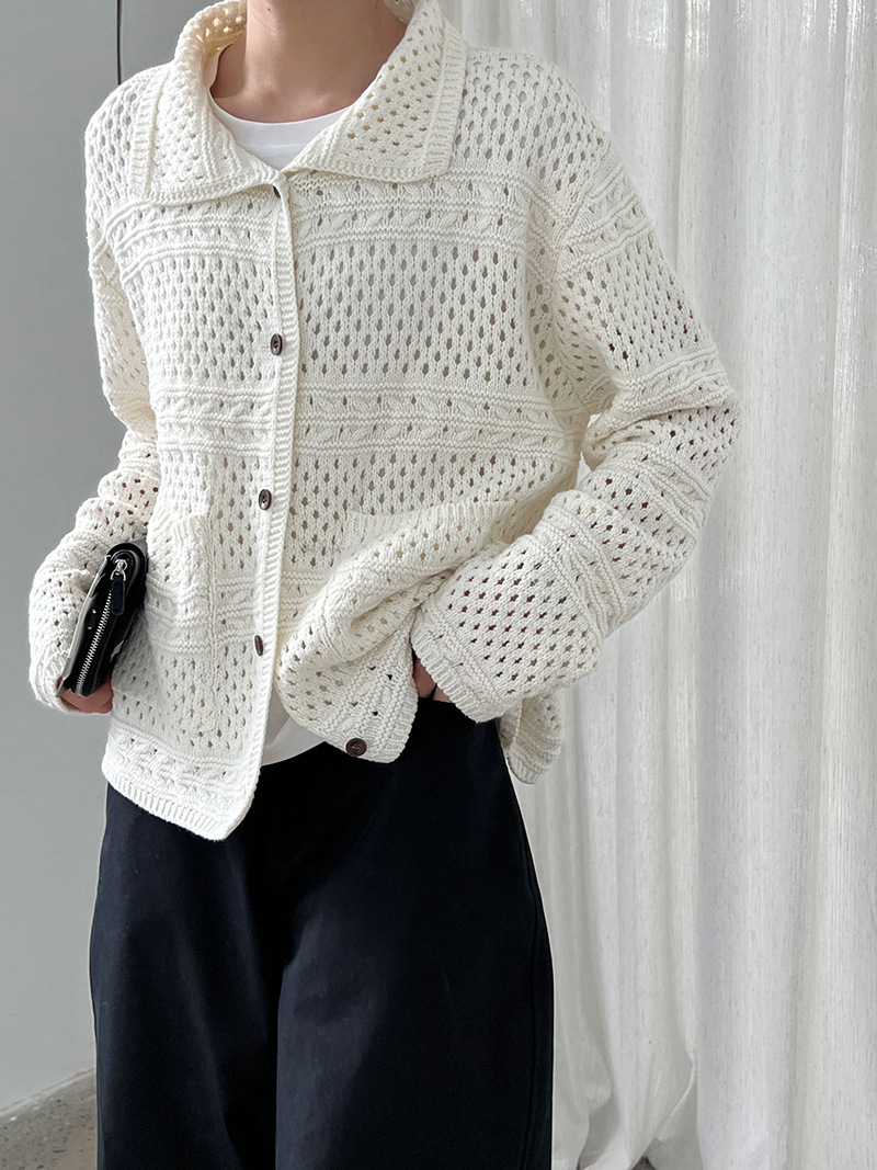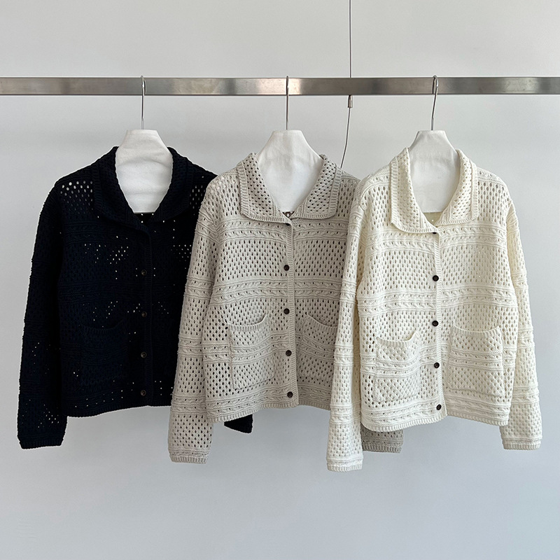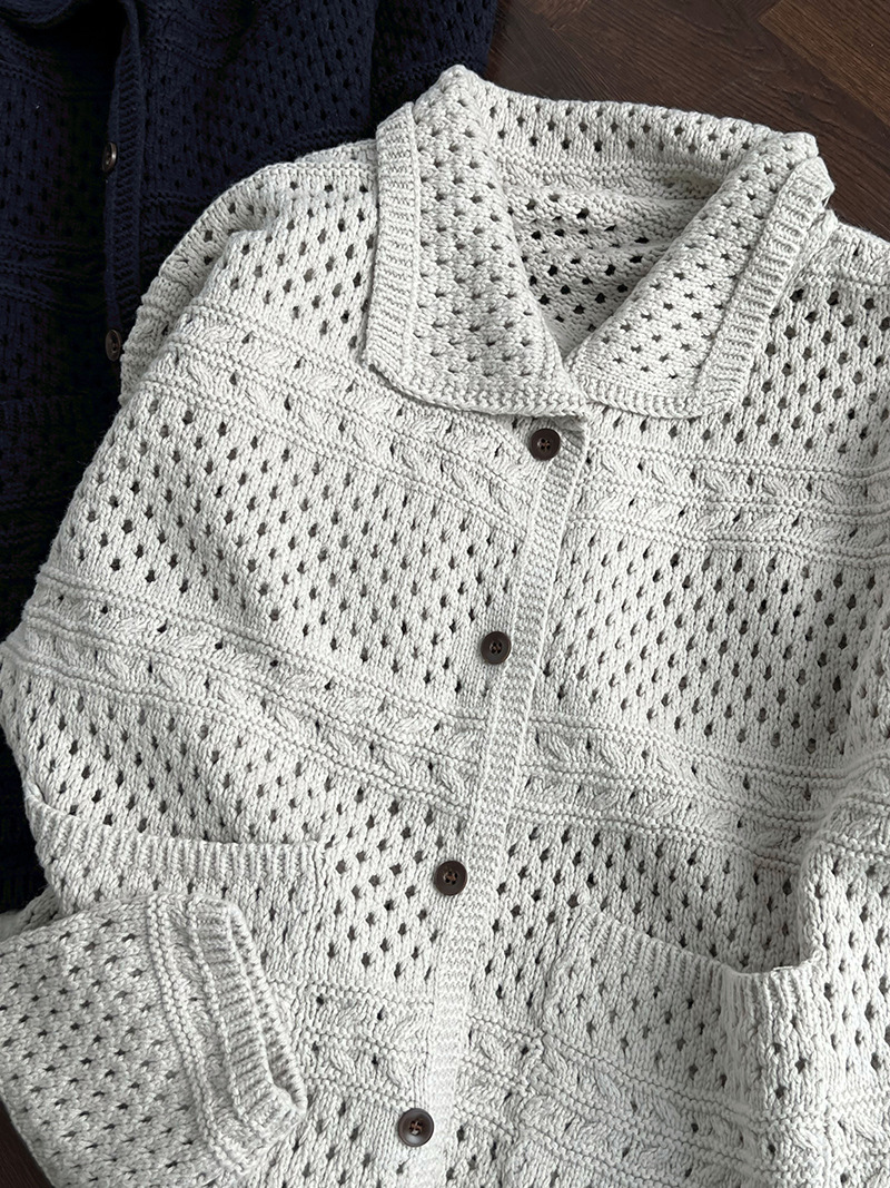 【アウター】レトロクロシェ風透かし編みニットカーディガン|折り襟×長袖の大人可愛い【JZシリーズ】