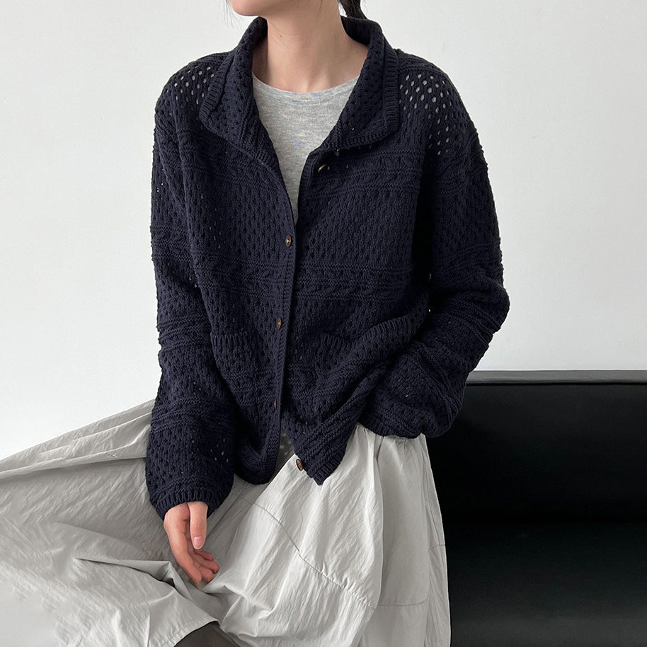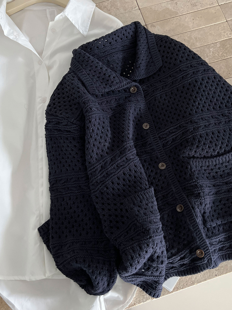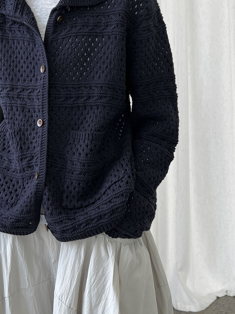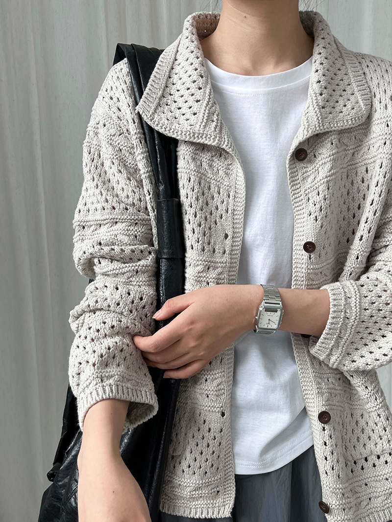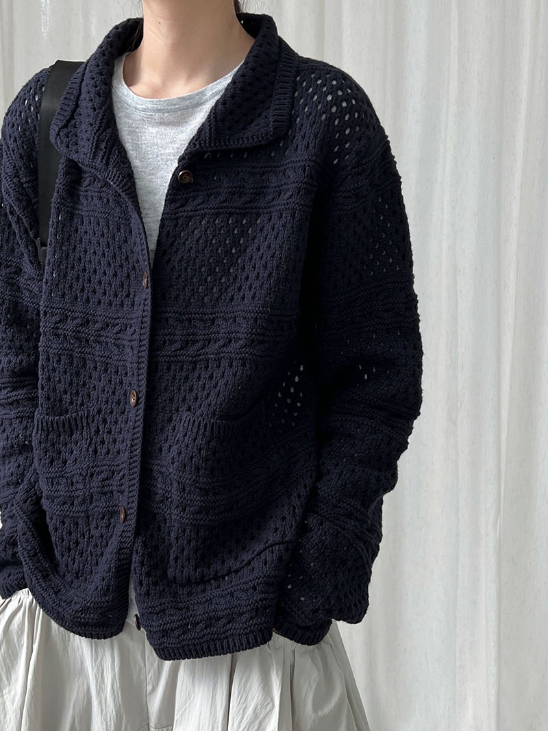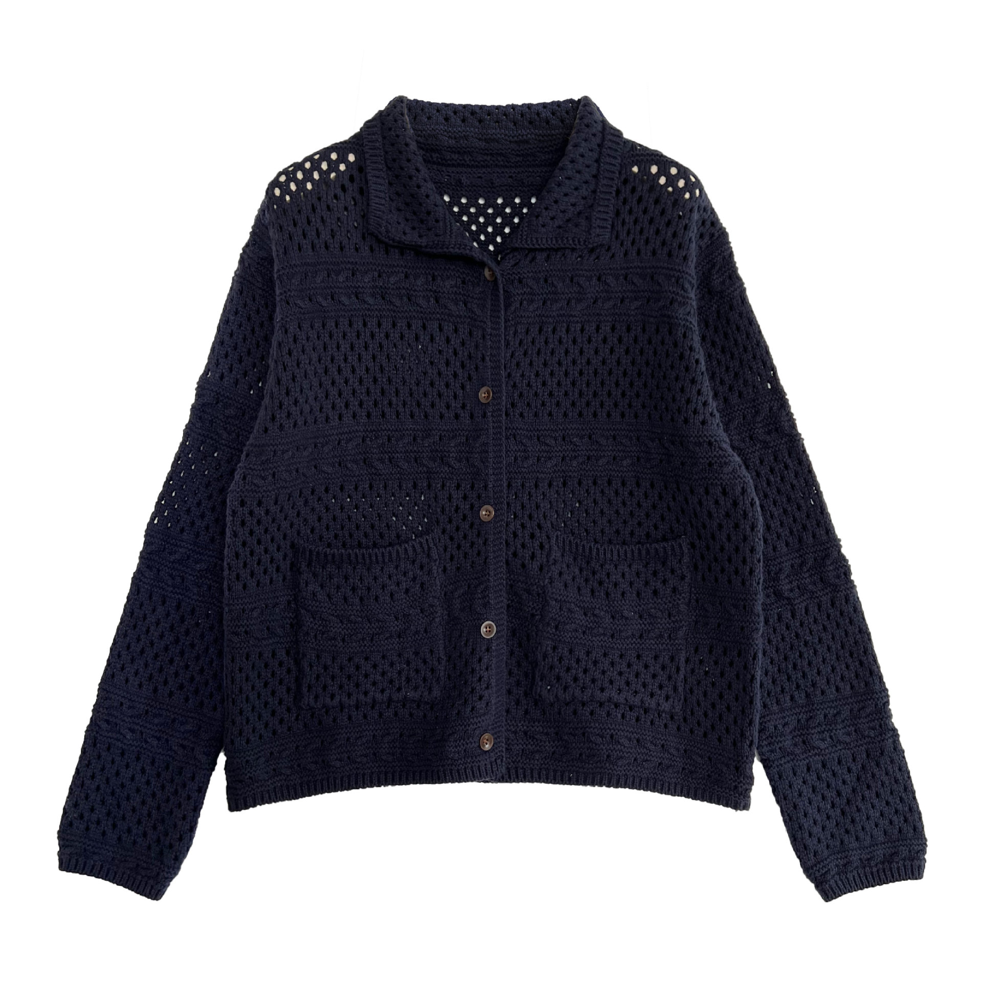 【アウター】レトロクロシェ風透かし編みニットカーディガン|折り襟×長袖の大人可愛い【JZシリーズ】