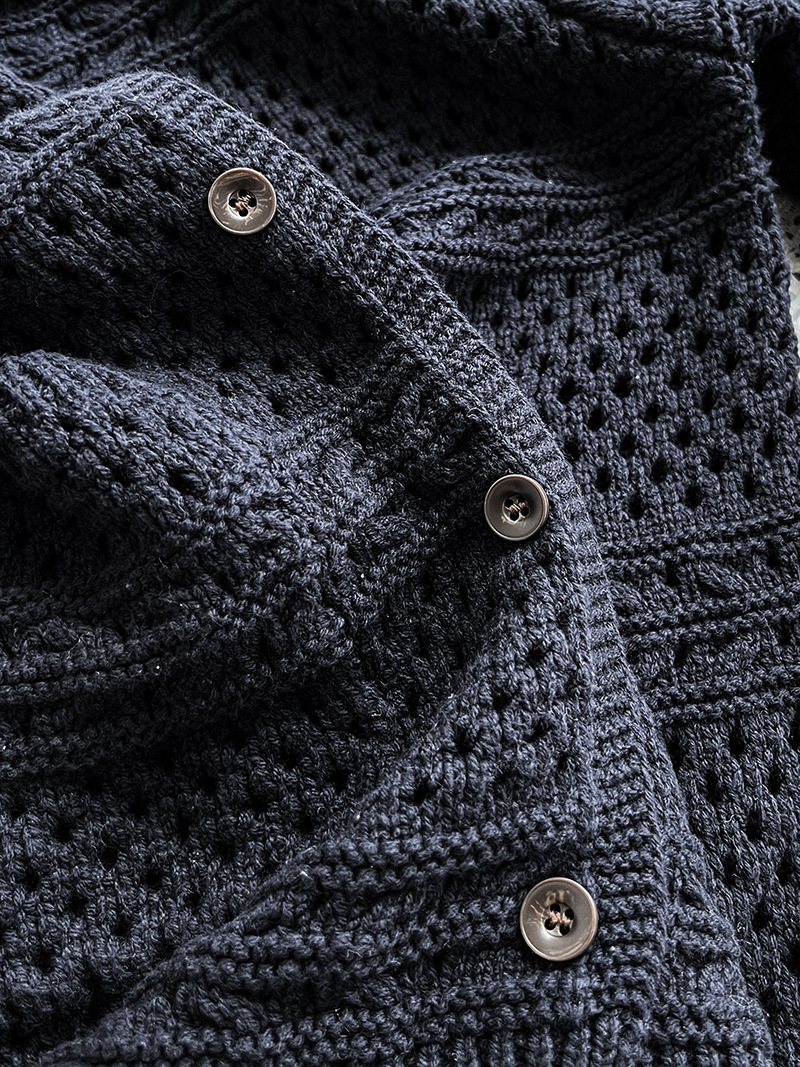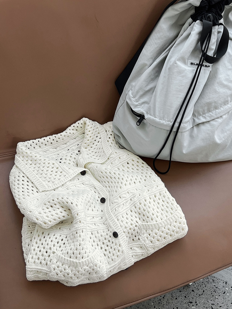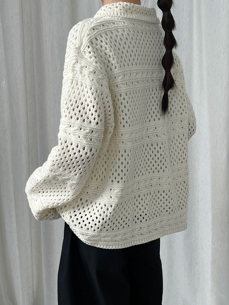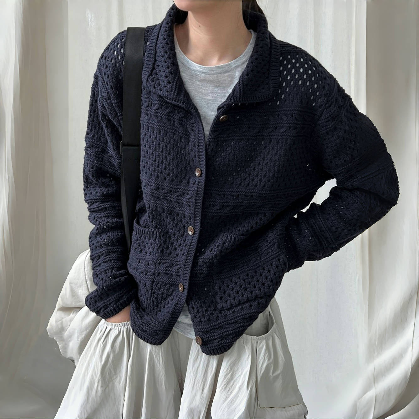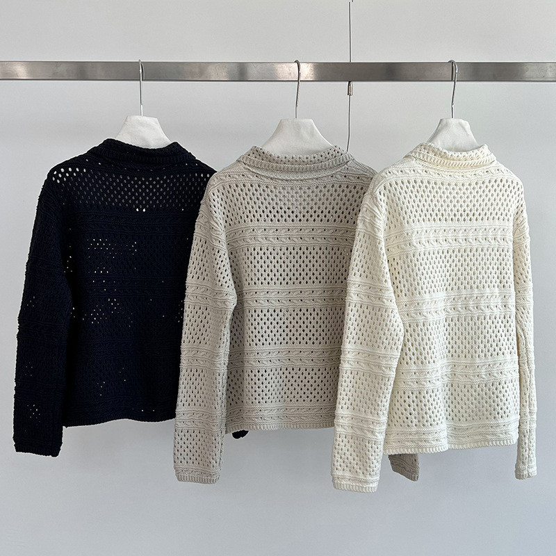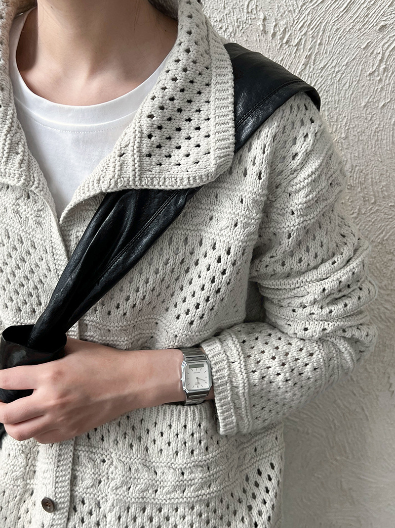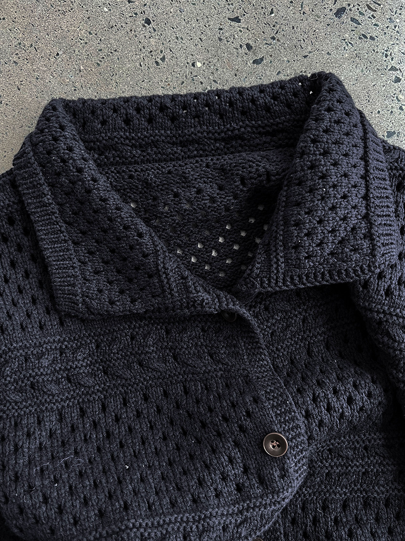【アウター】レトロクロシェ風透かし編みニットカーディガン|折り襟×長袖の大人可愛い【JZシリーズ】