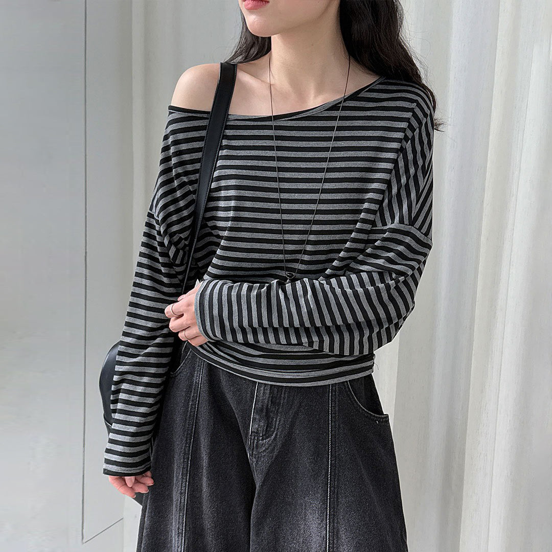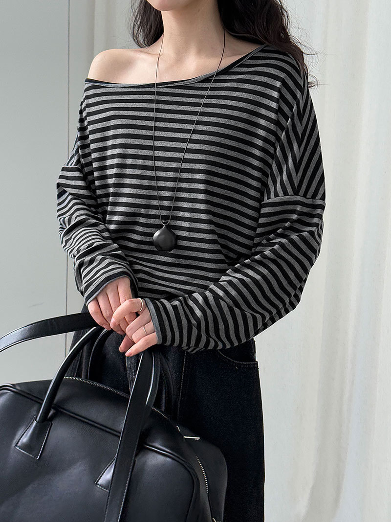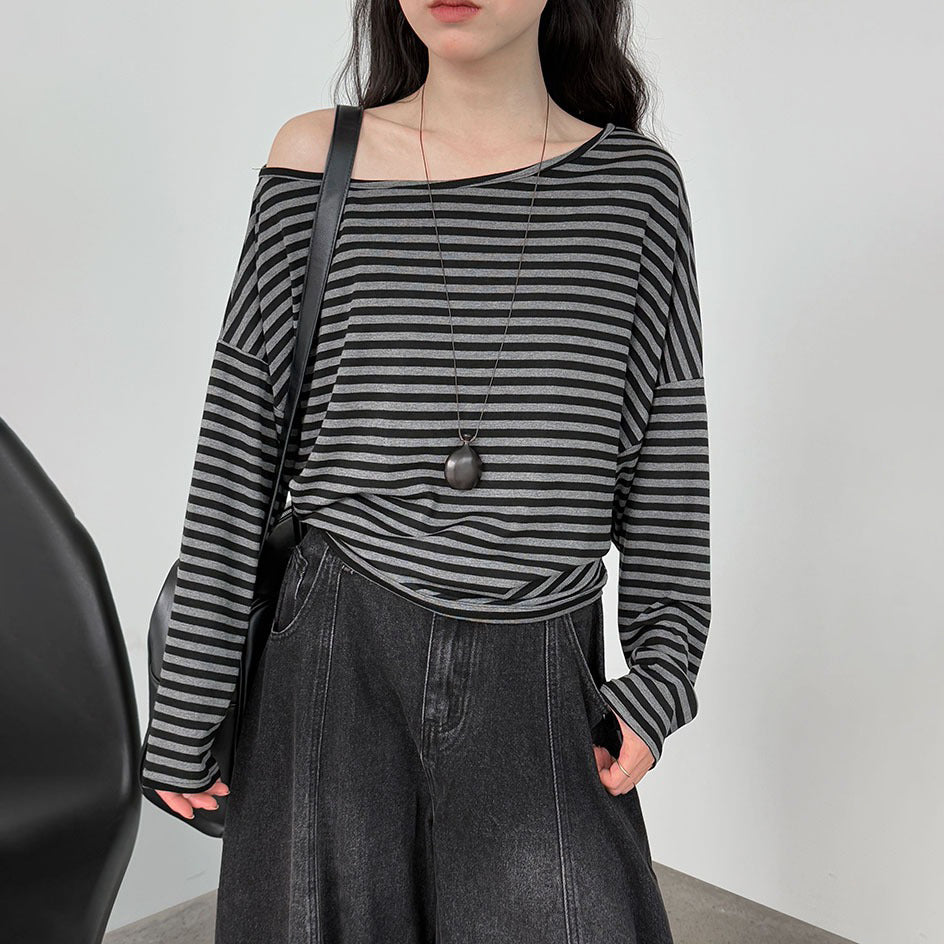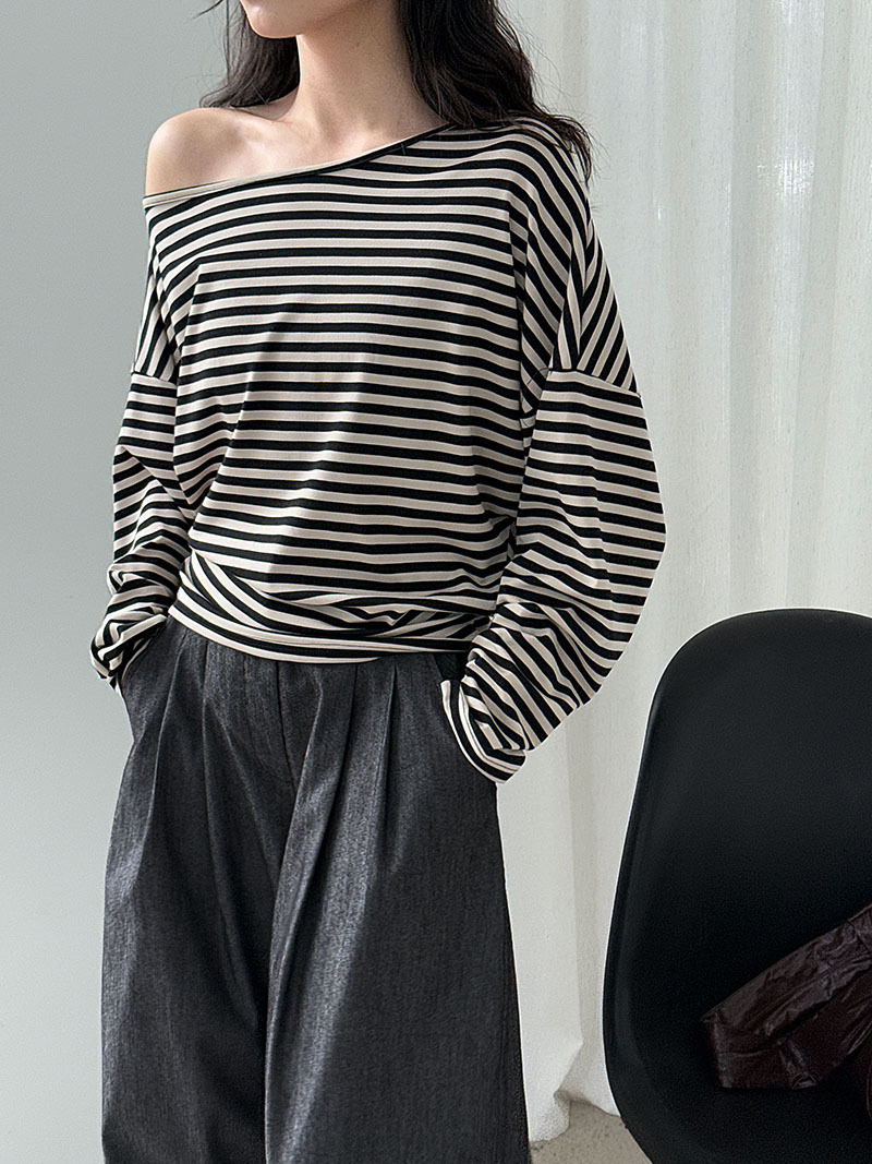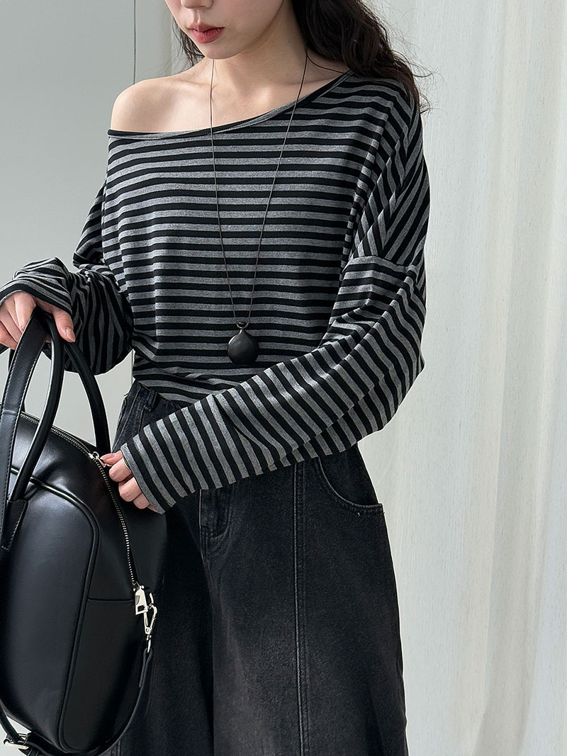 【トップス】韓国風ボーダー柄ワンショルダートップス|斜めオフショル×ゆるシルエットで抜け感&細見え【JZシリーズ】