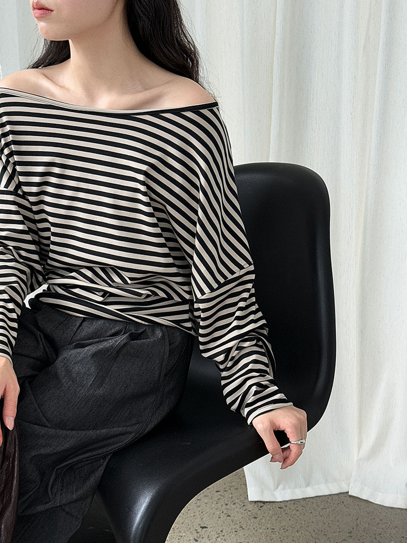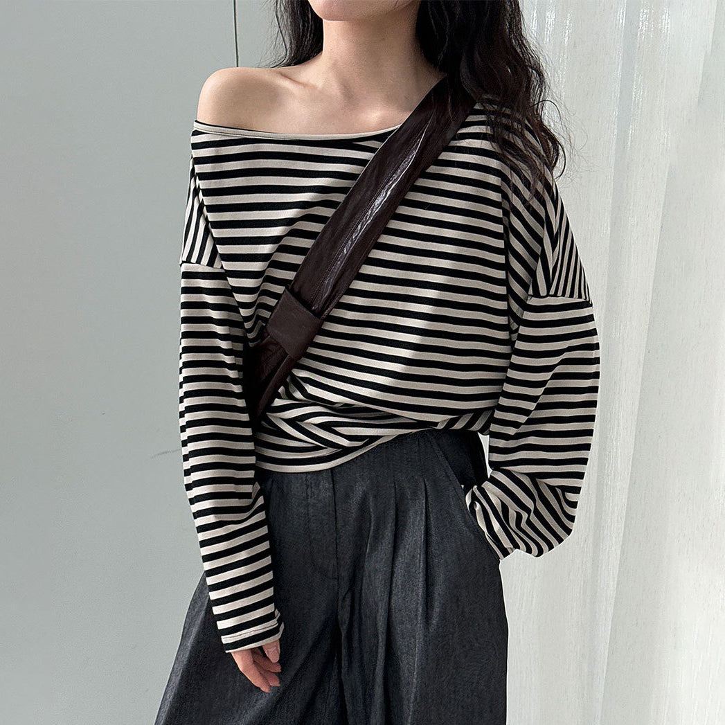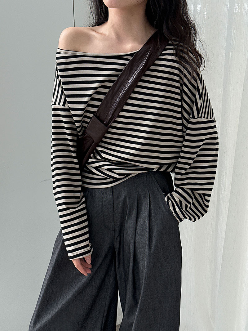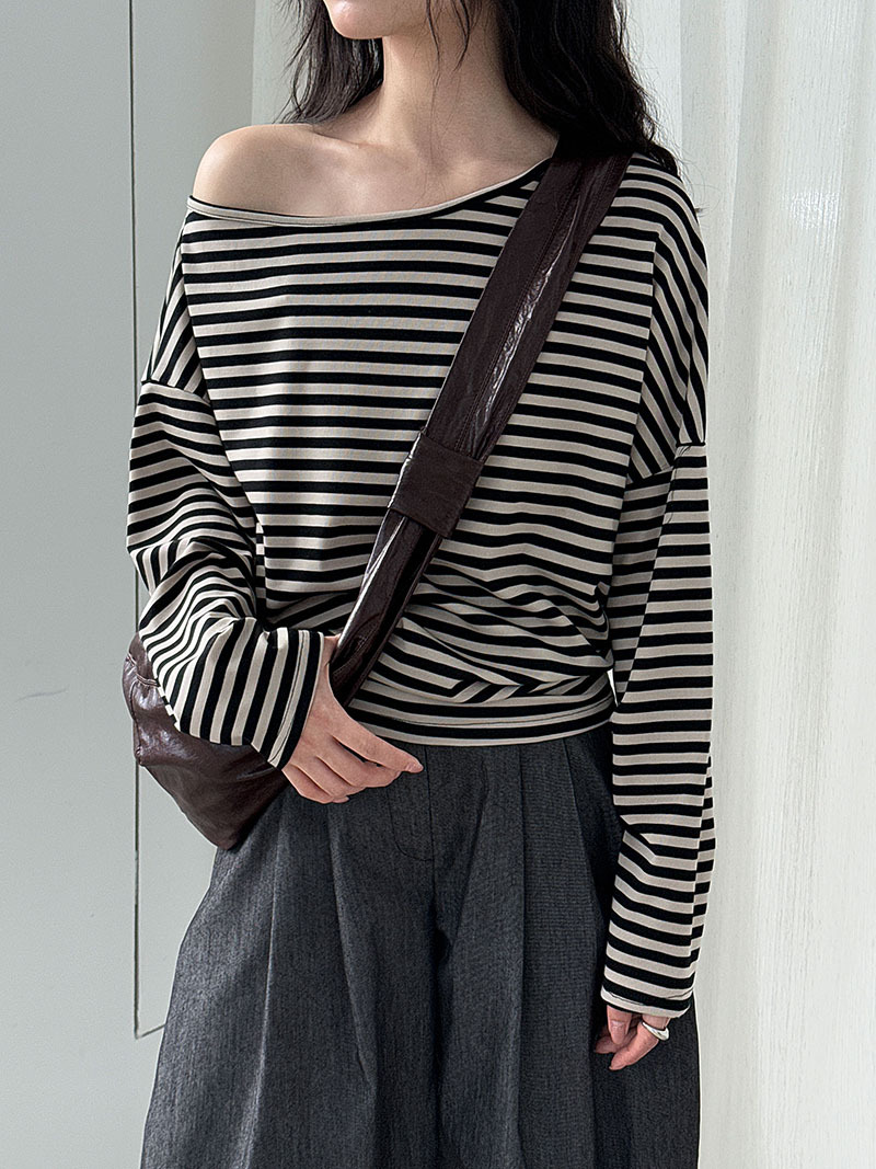 【トップス】韓国風ボーダー柄ワンショルダートップス|斜めオフショル×ゆるシルエットで抜け感&細見え【JZシリーズ】