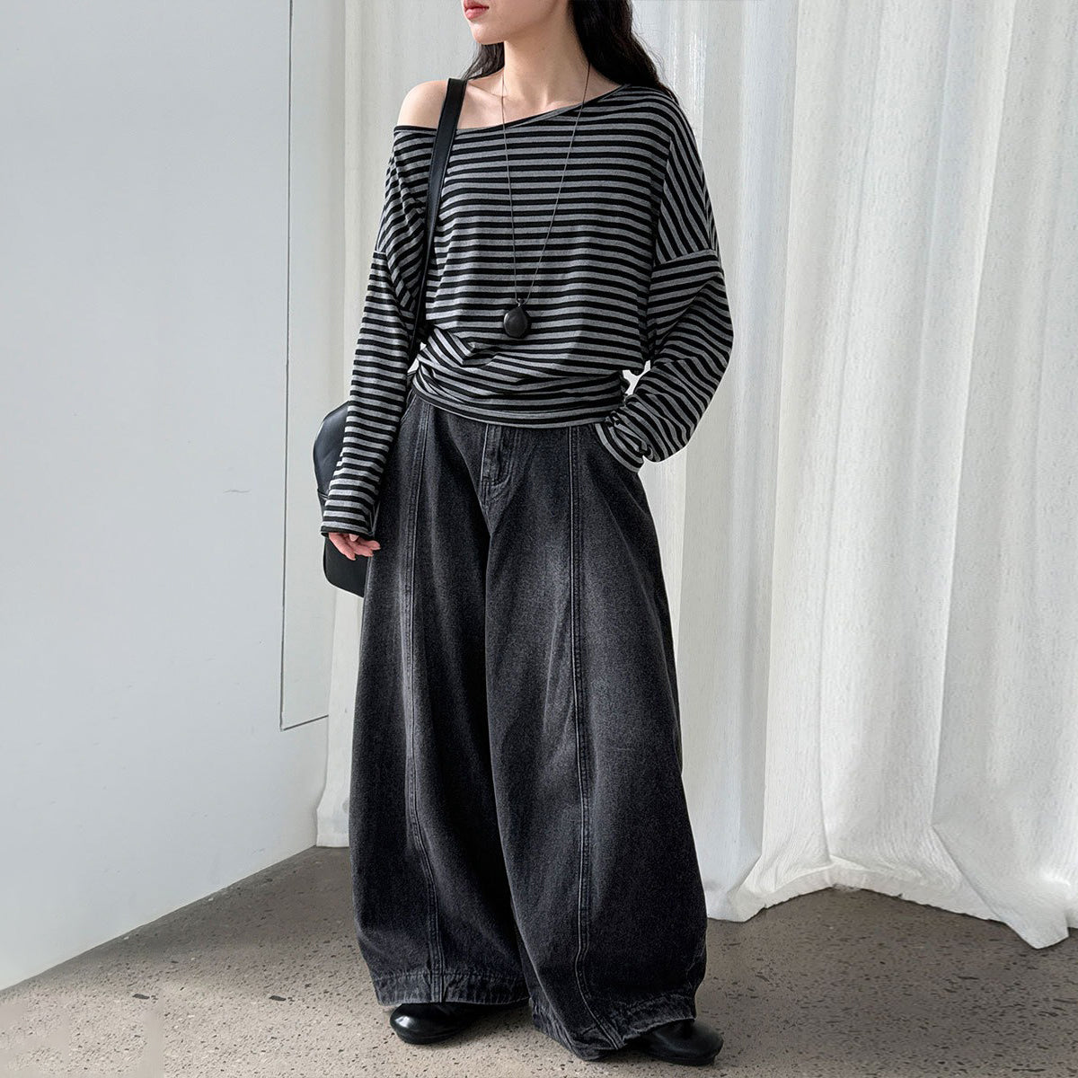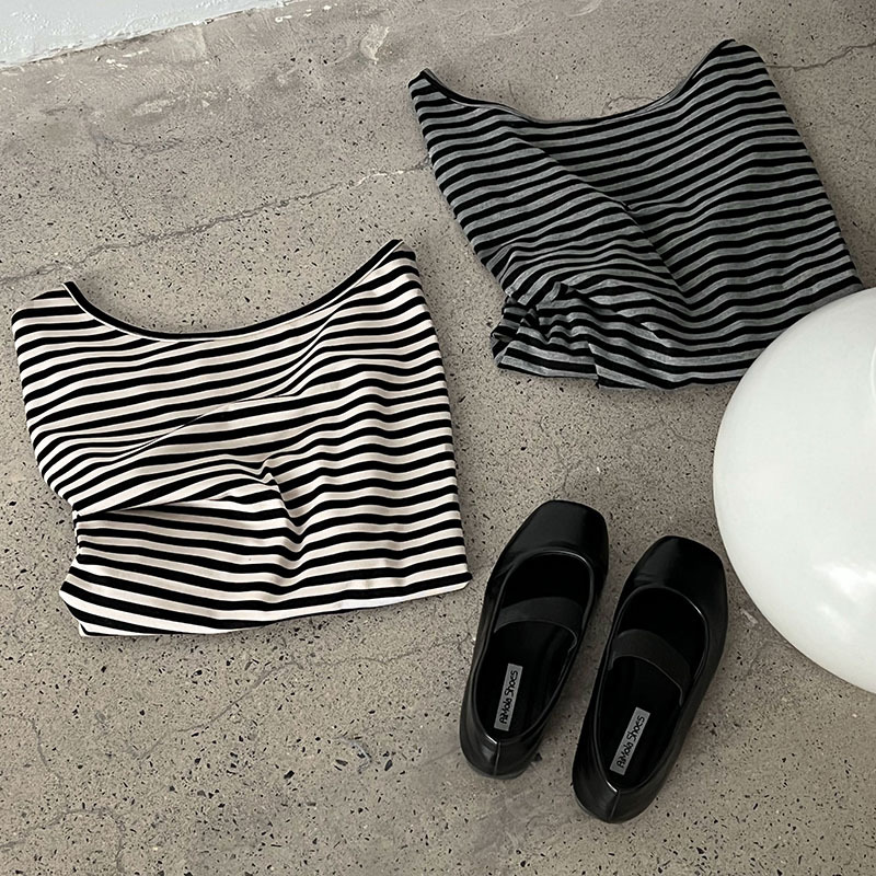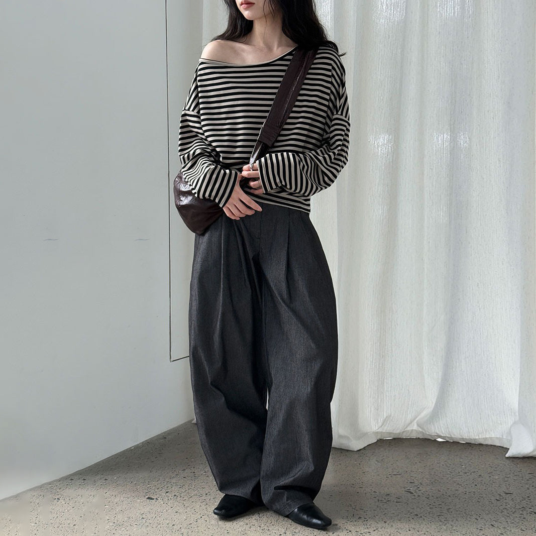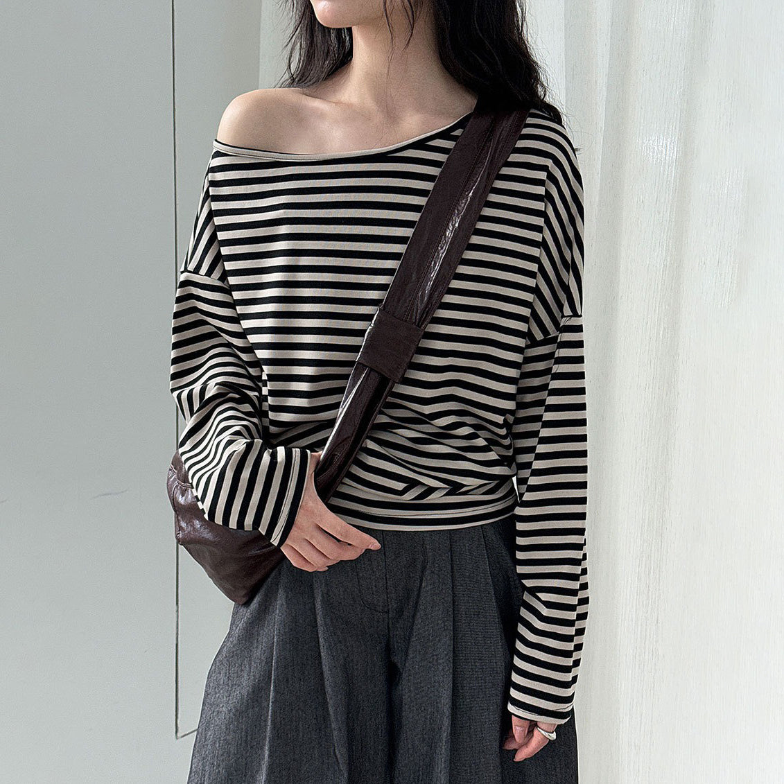 【トップス】韓国風ボーダー柄ワンショルダートップス|斜めオフショル×ゆるシルエットで抜け感&細見え【JZシリーズ】