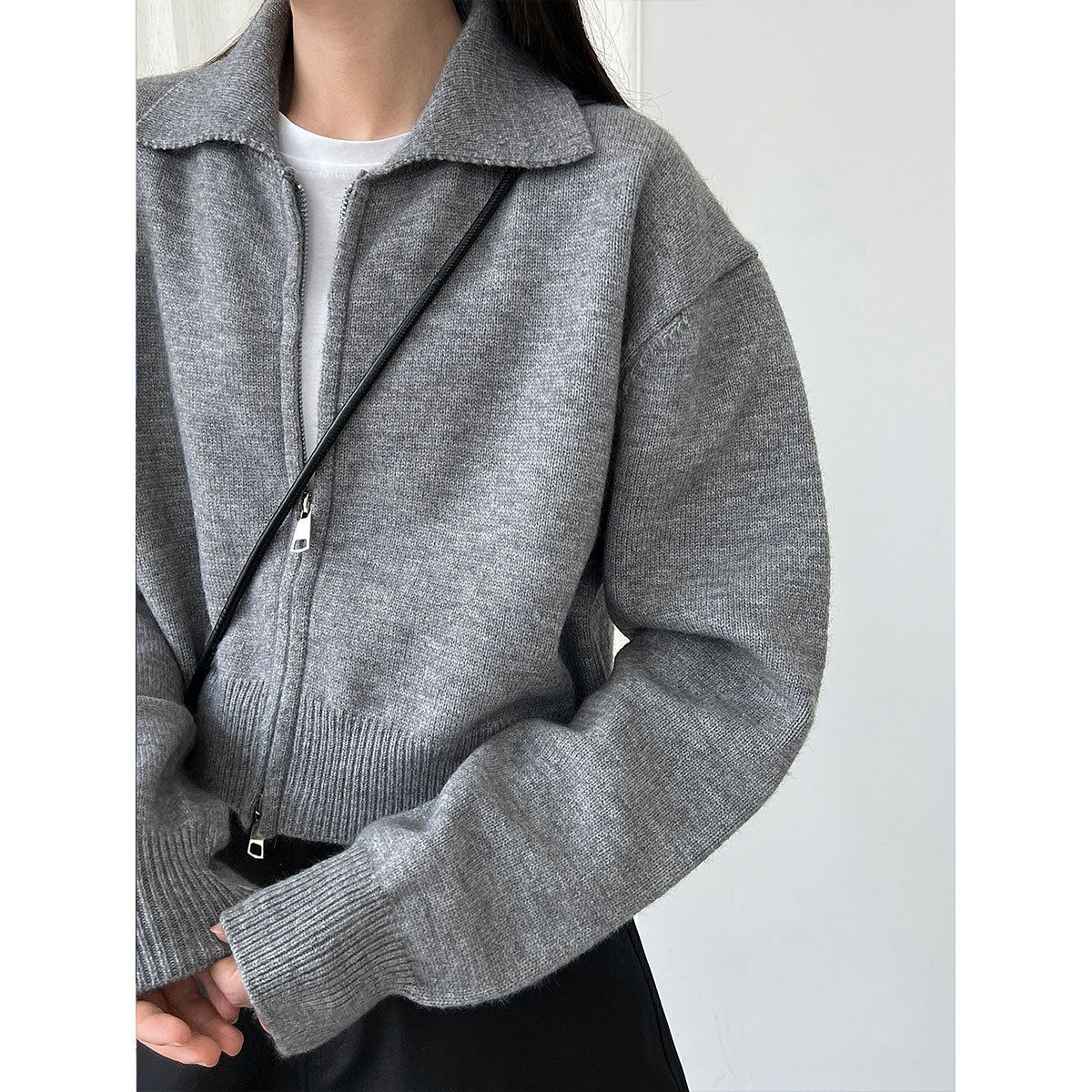 【商品名】【トップス】春 秋 冬 ショート丈 ダブルジップ ニットカーディガン ポロカラー セーター 【JZシリーズ】