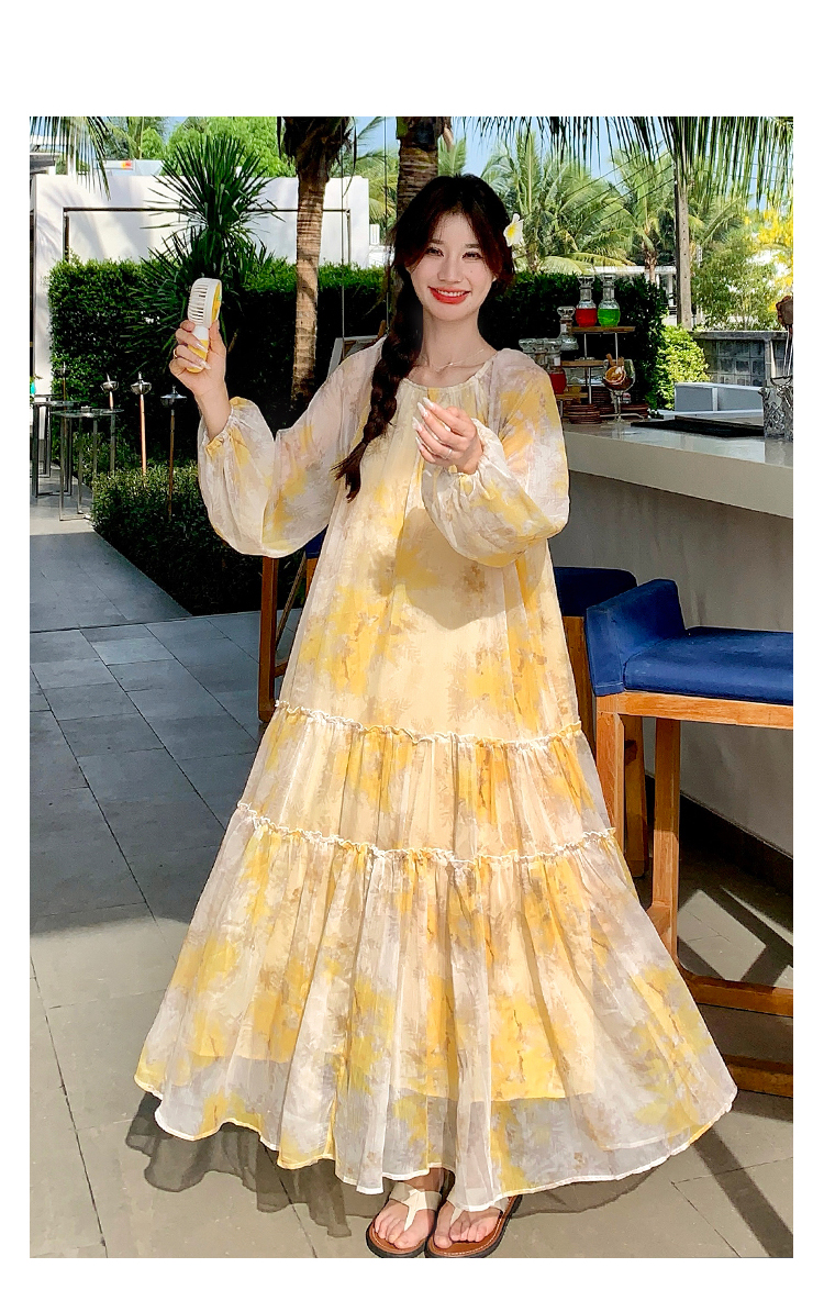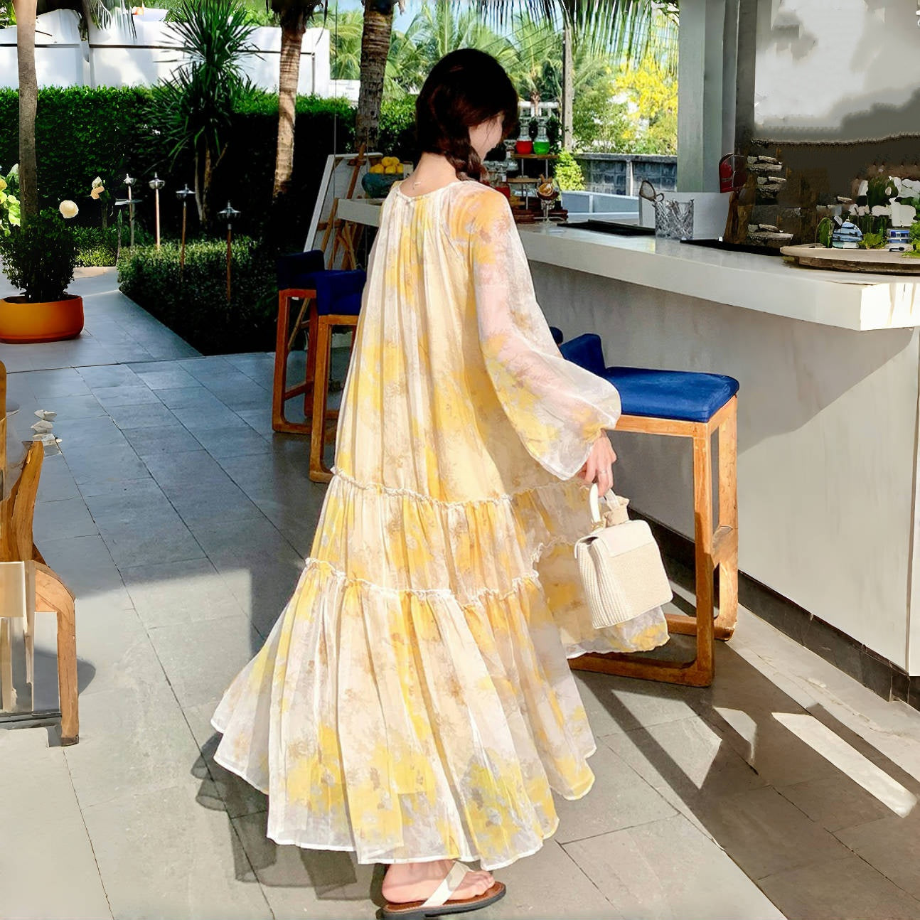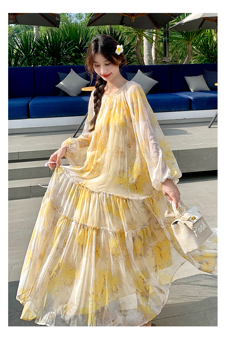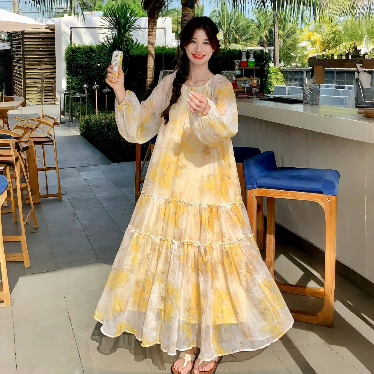 【ワンピース】花柄 長袖ワンピース レディース 高級感 細見え リゾート風 フェミニン ロングビーチドレス【SHシリーズ】