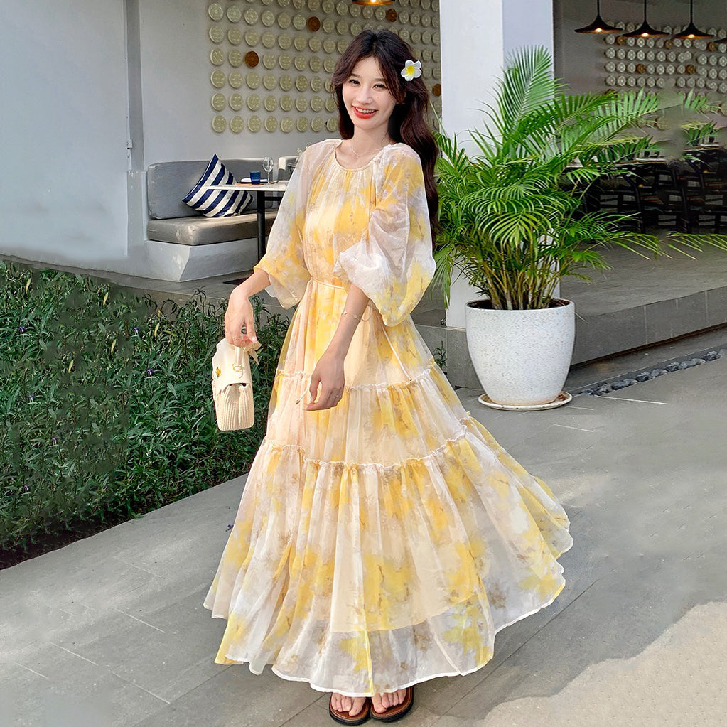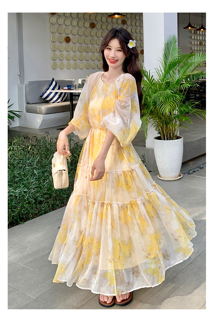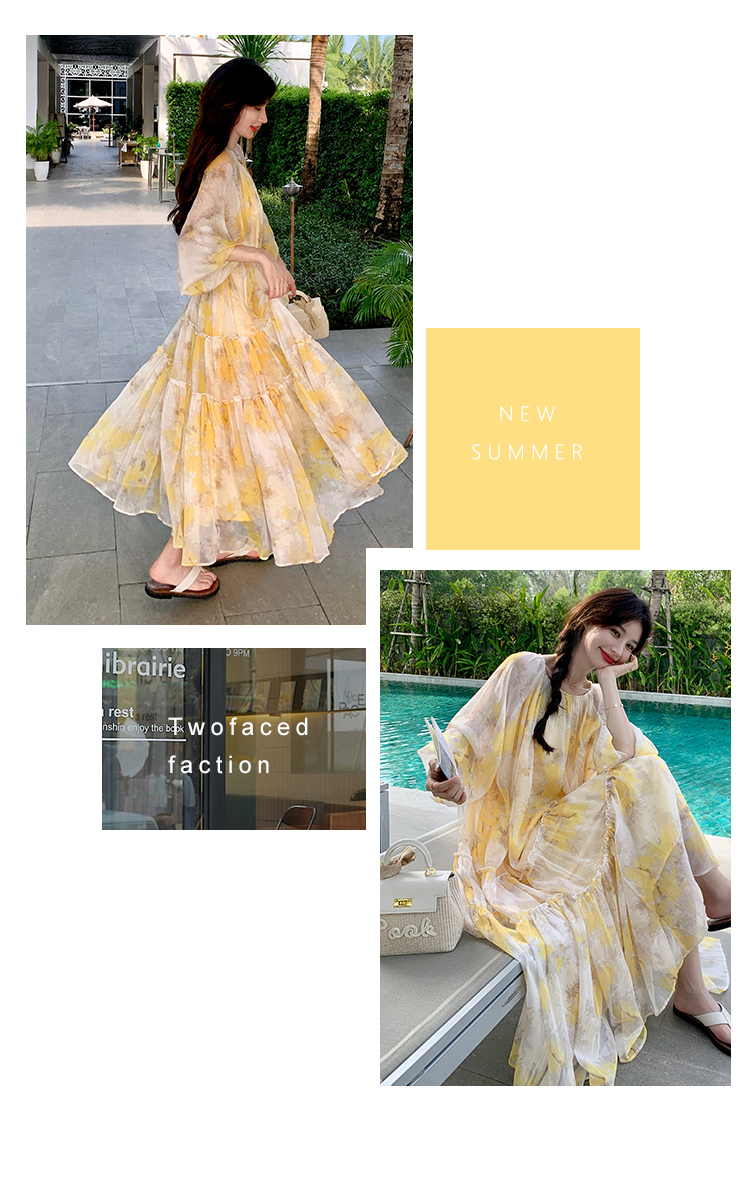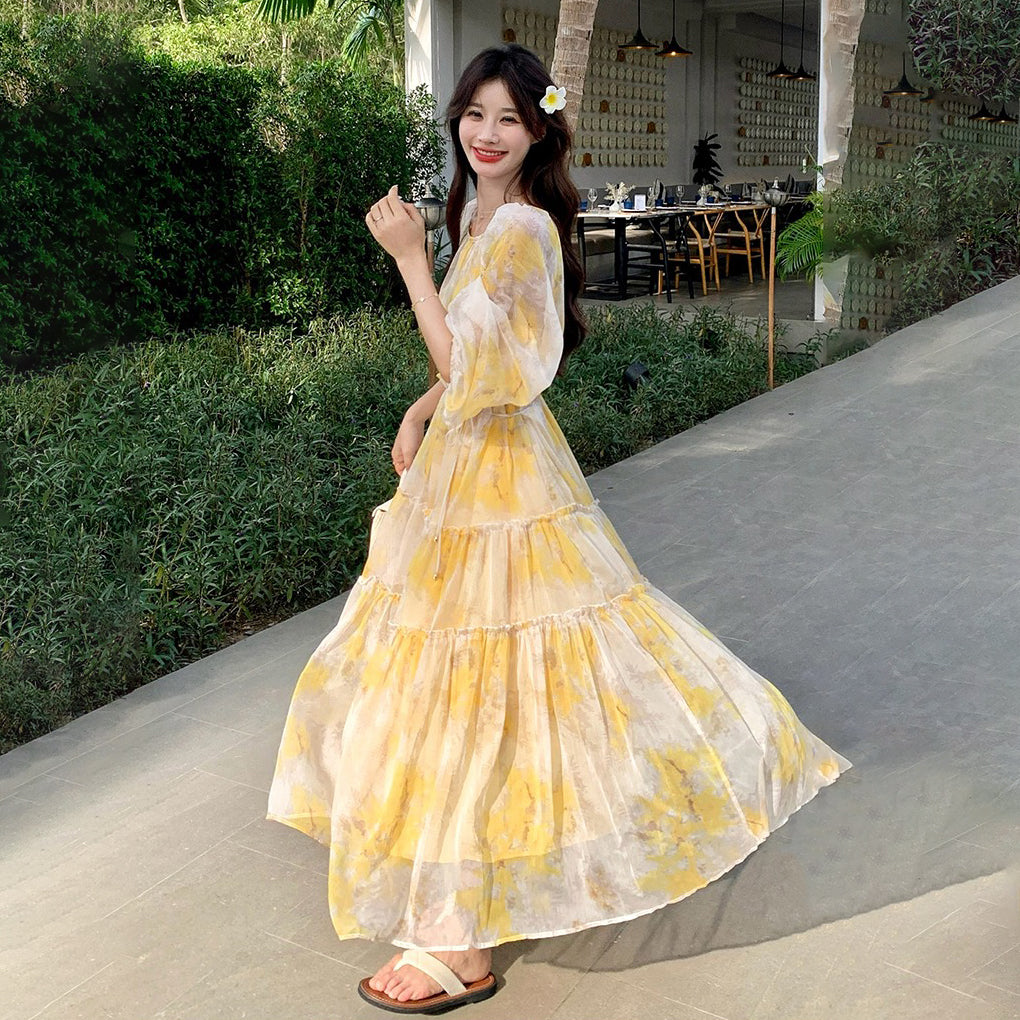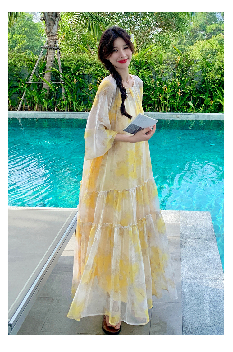 【ワンピース】花柄 長袖ワンピース レディース 高級感 細見え リゾート風 フェミニン ロングビーチドレス【SHシリーズ】
