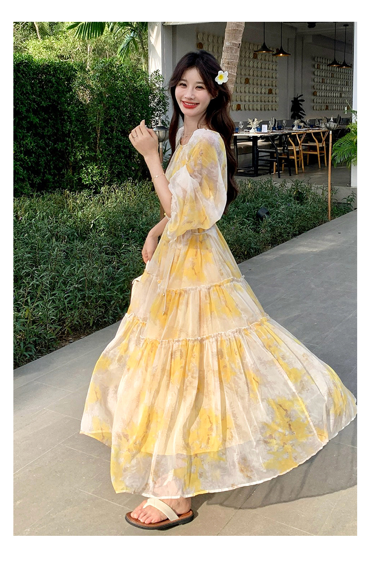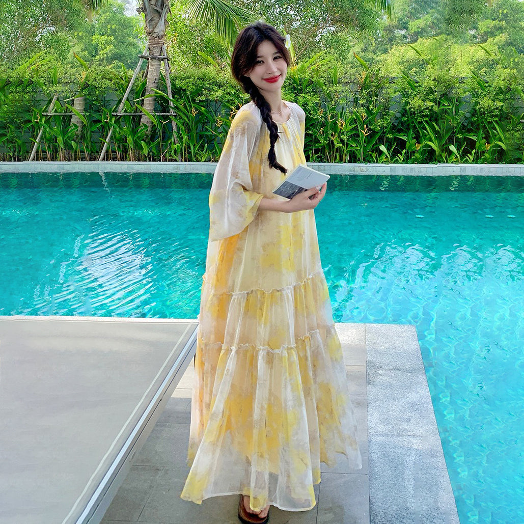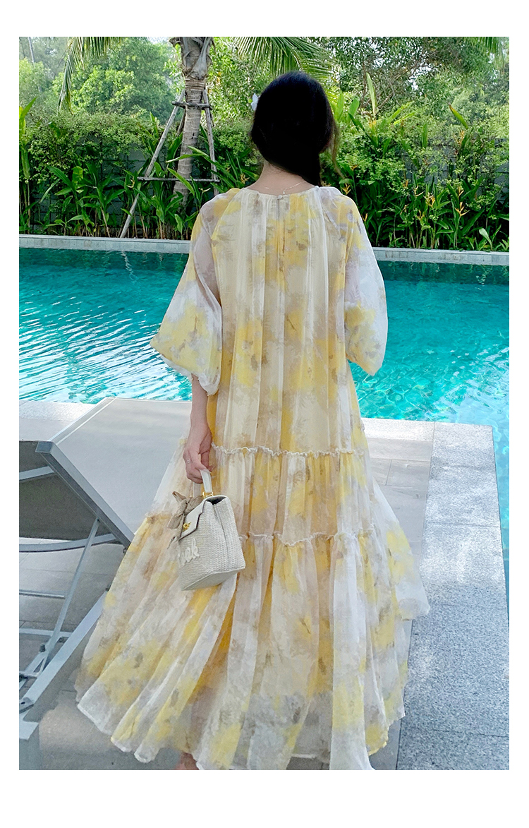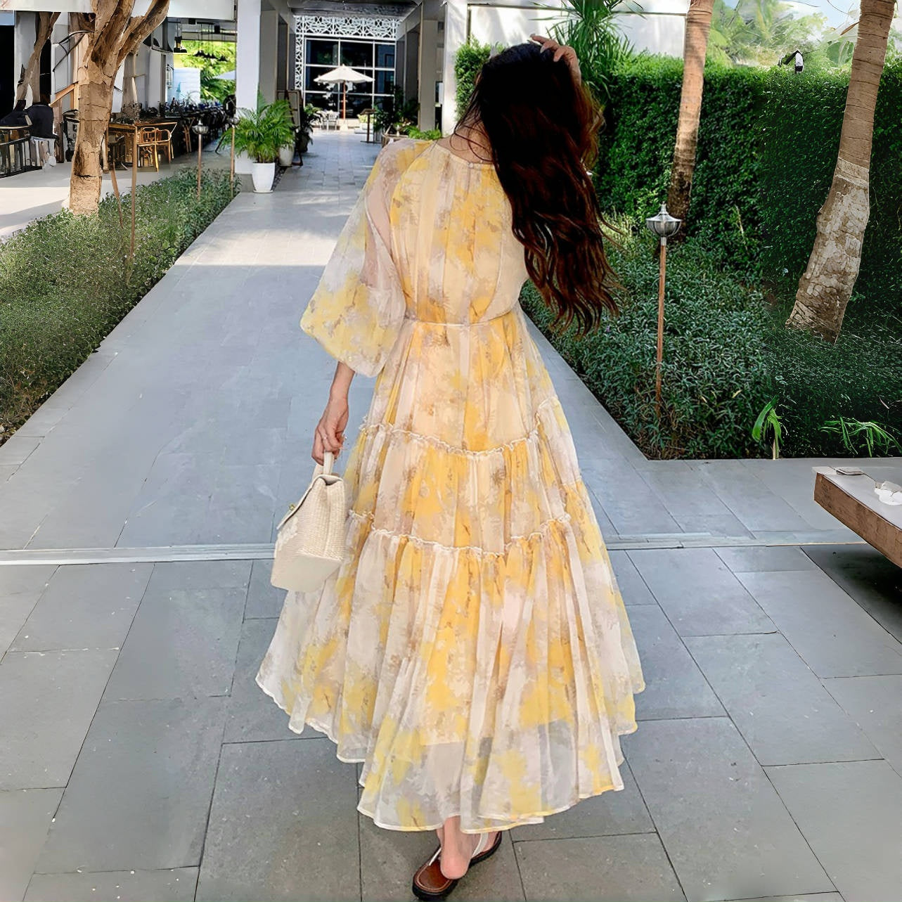 【ワンピース】花柄 長袖ワンピース レディース 高級感 細見え リゾート風 フェミニン ロングビーチドレス【SHシリーズ】