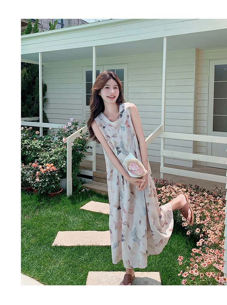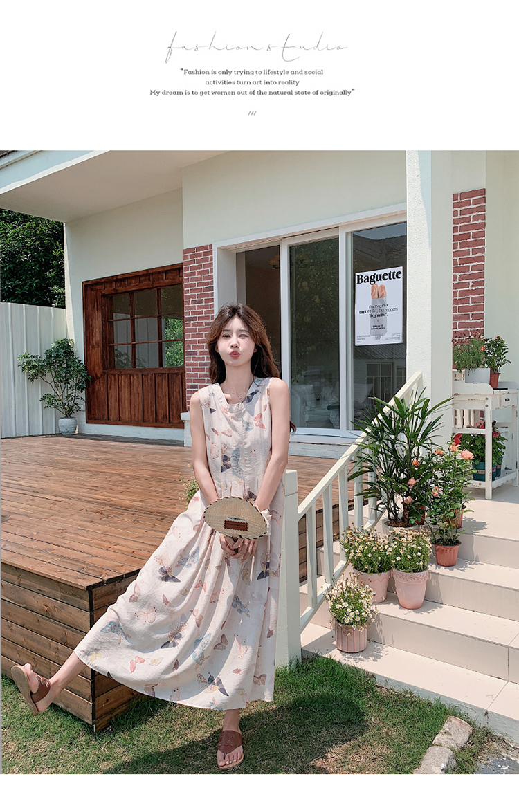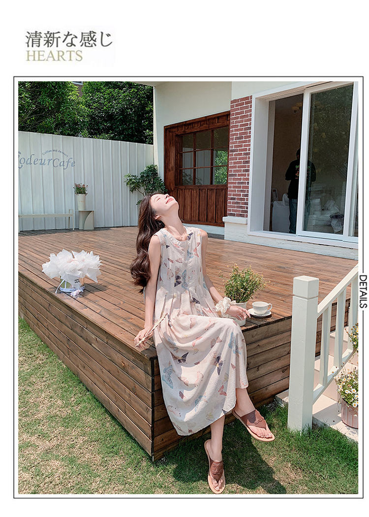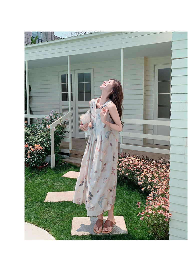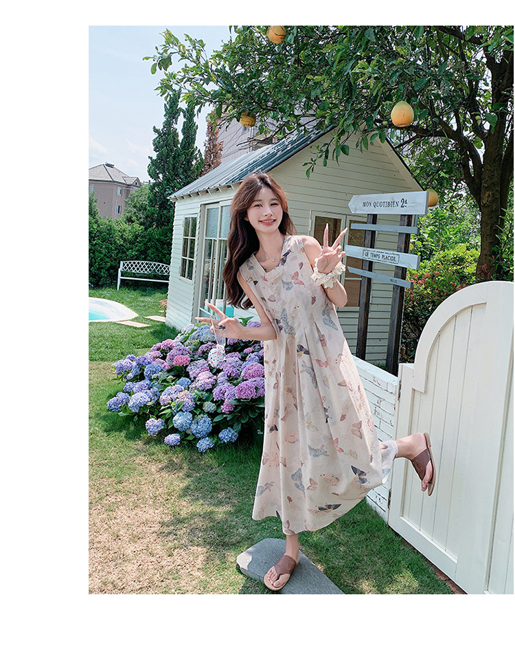 【ワンピース】蝶柄 花柄ノースリーブワンピース レディース 夏 ゆったり リゾート風 バックレス エレガントロングドレス【SHシリーズ】