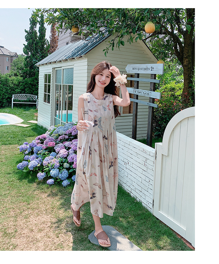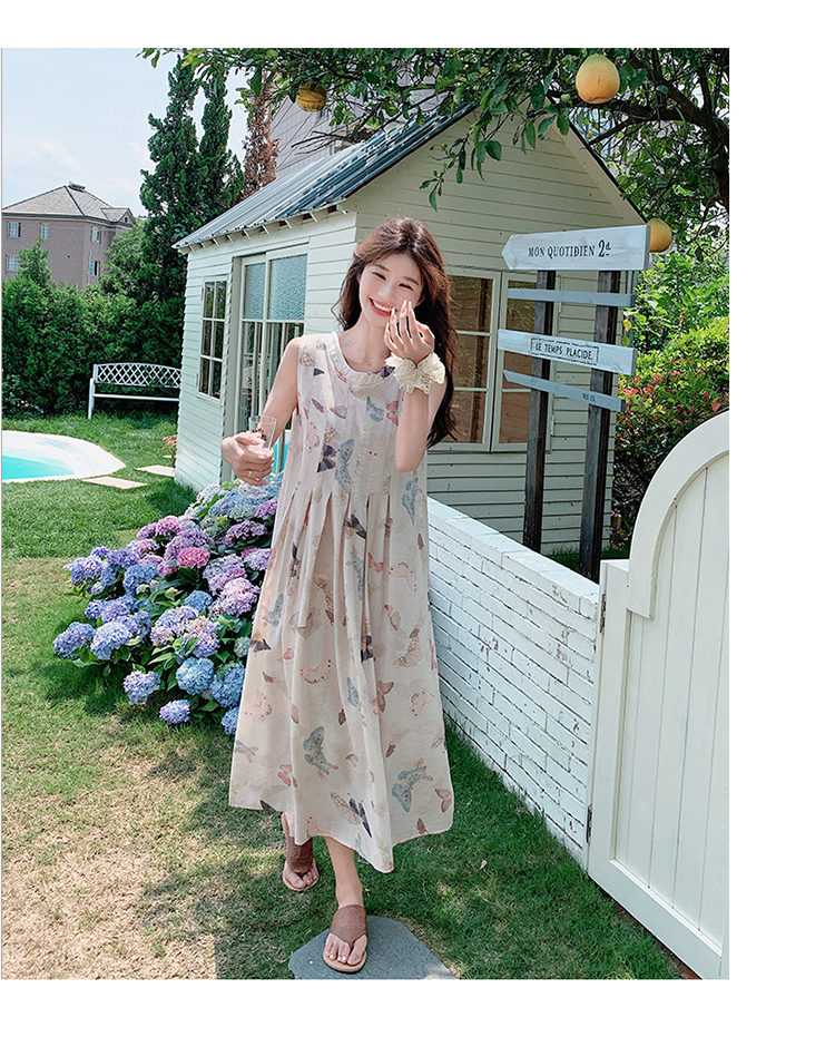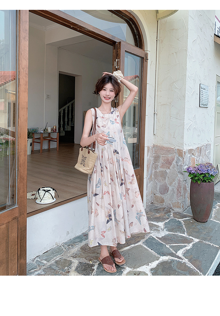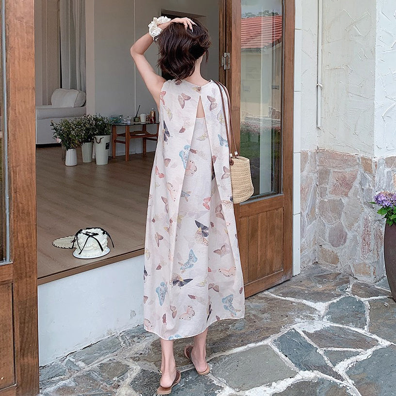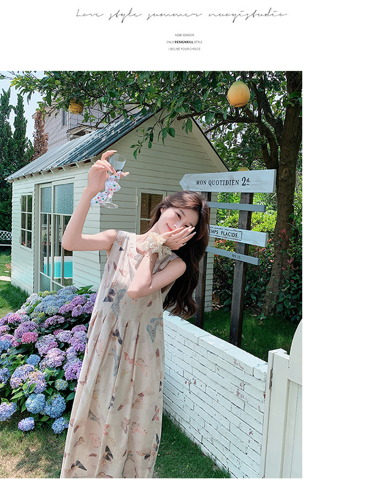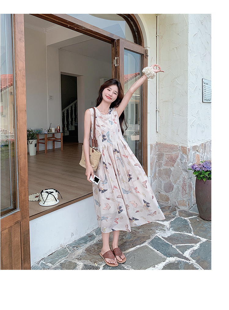 【ワンピース】蝶柄 花柄ノースリーブワンピース レディース 夏 ゆったり リゾート風 バックレス エレガントロングドレス【SHシリーズ】