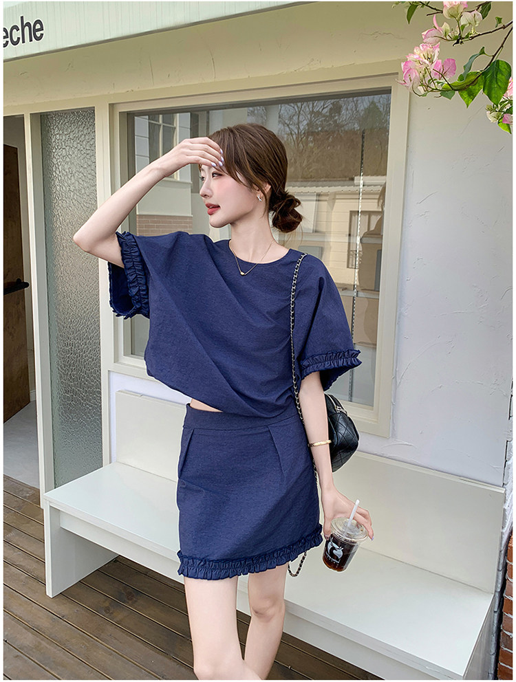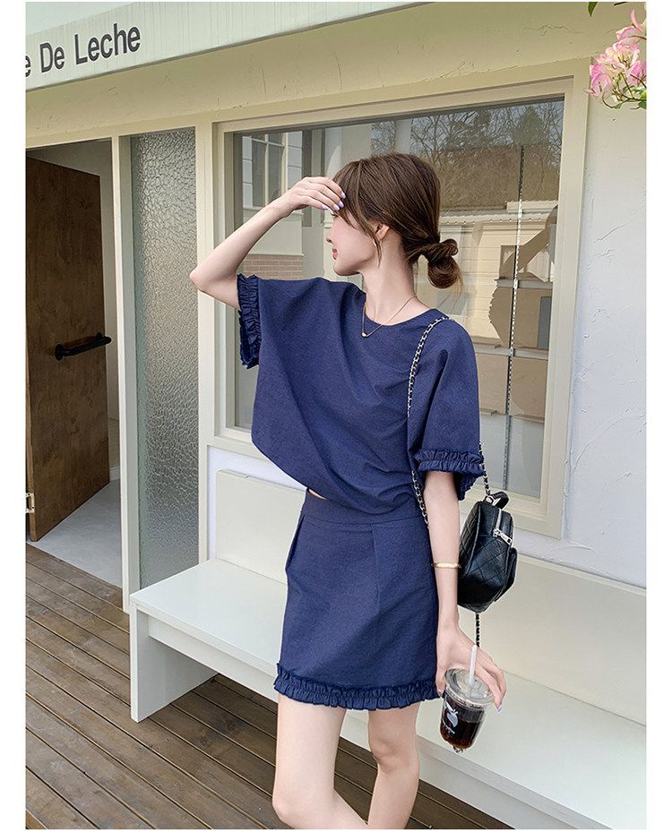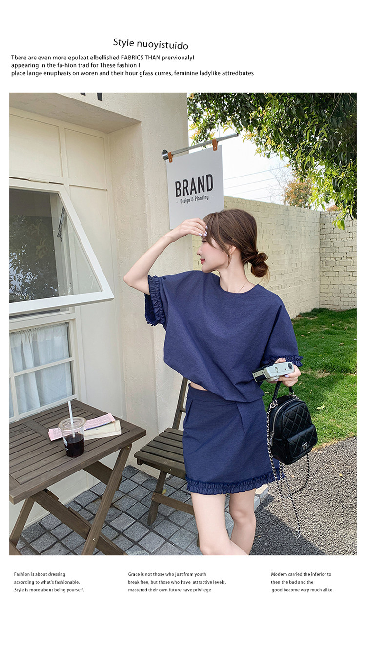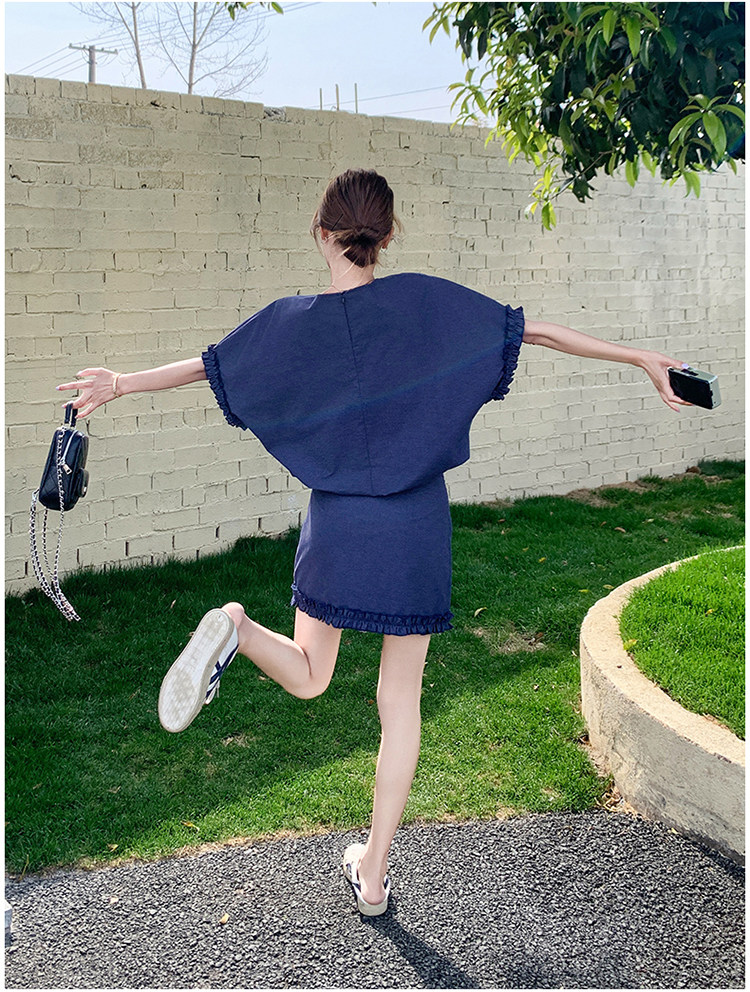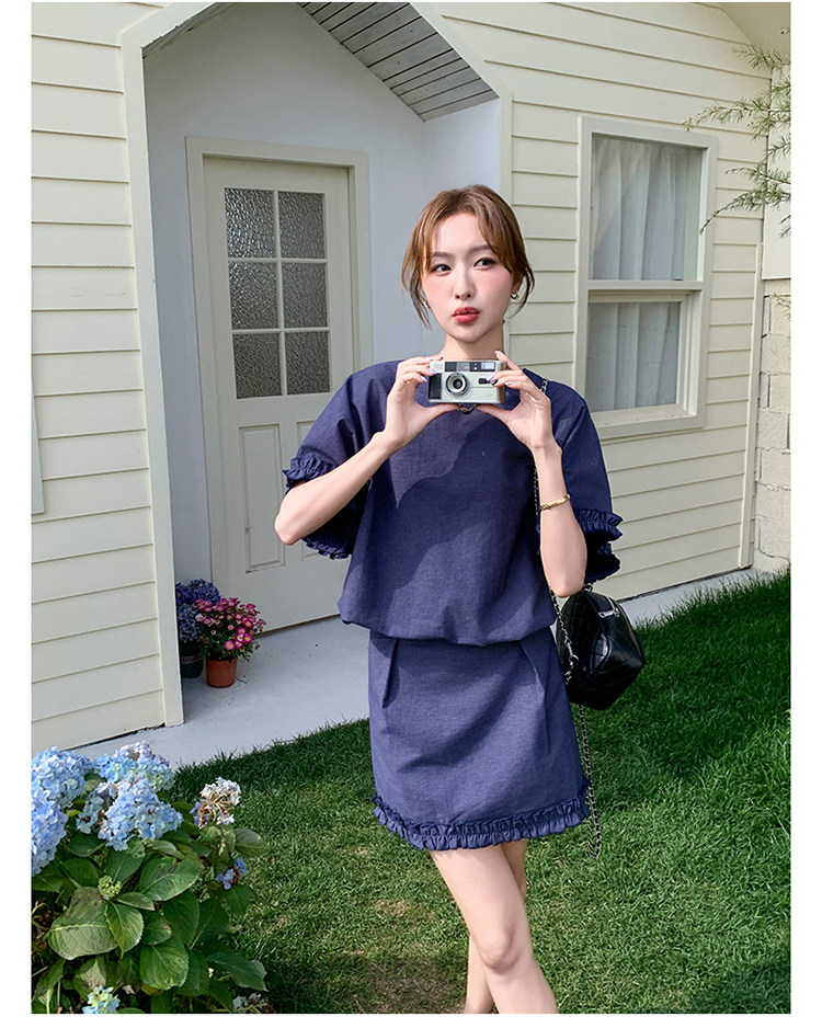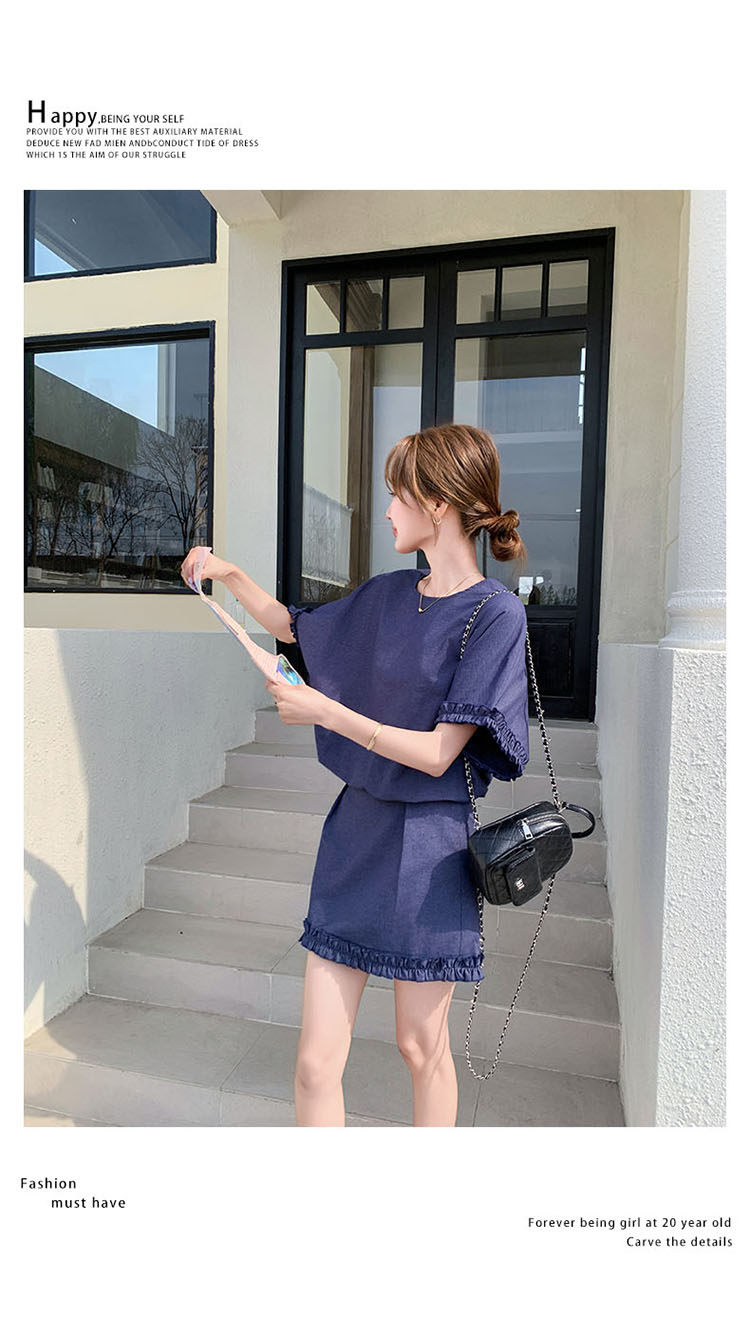 2点セット!【セットアップ】 OOTDコーデ ネイビー花柄袖トップス+ミニスカート 上下セット レディース カジュアル 若見え人気セットアップ【JZシリーズ】