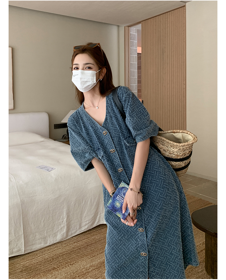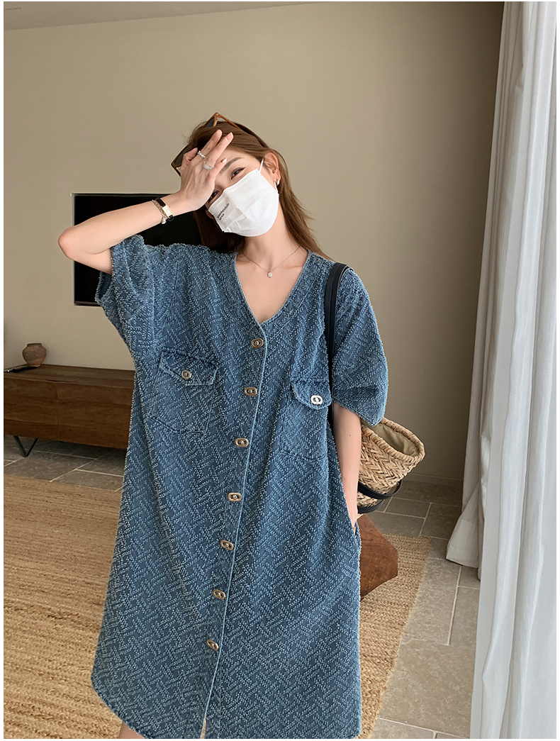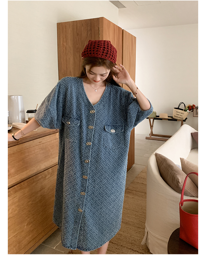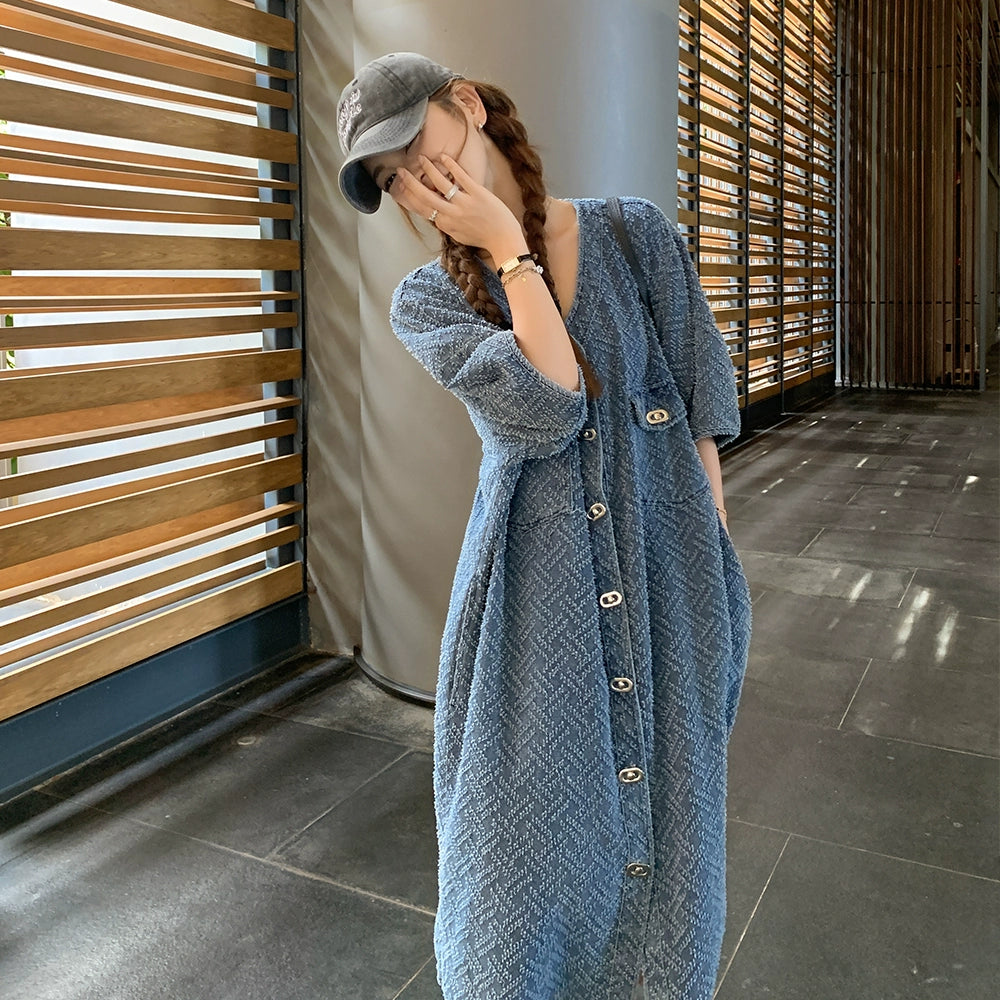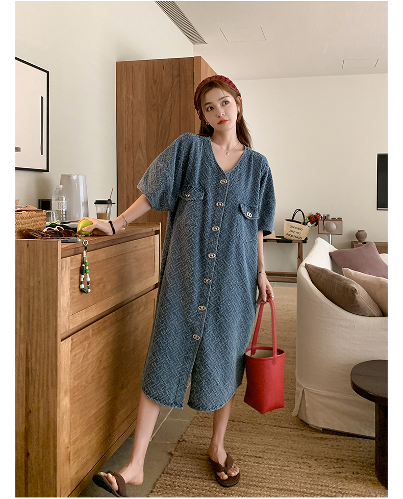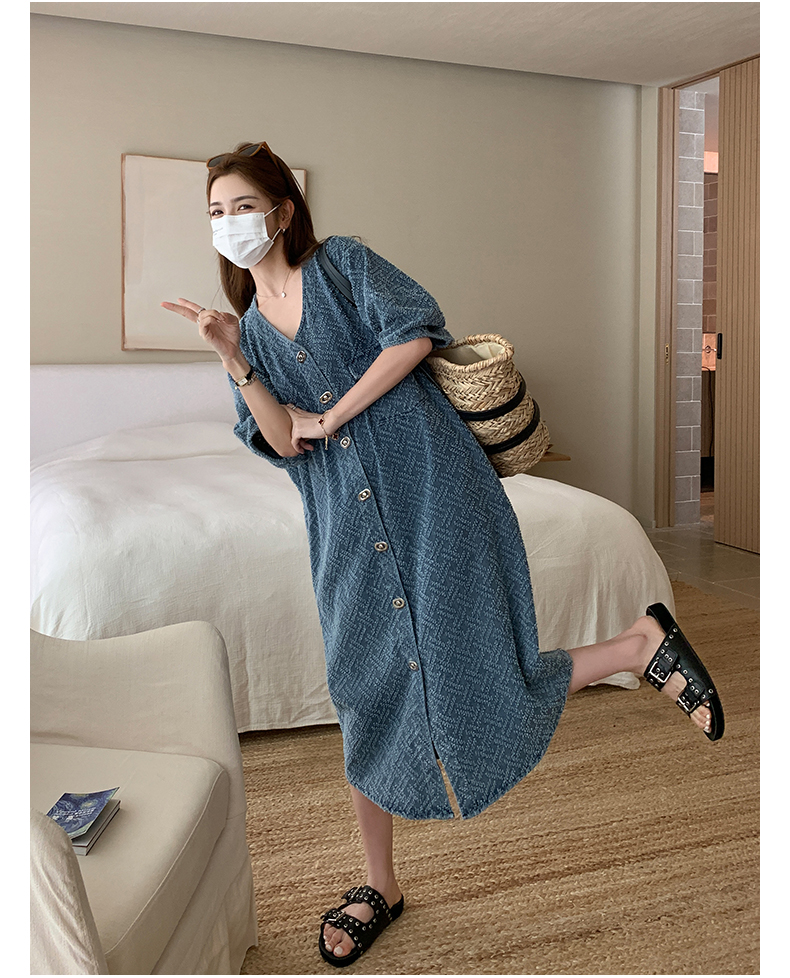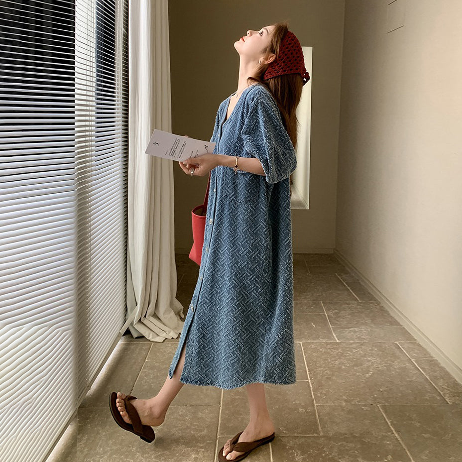 【ワンピース】夏 リラックス感 Vネック デニム半袖ワンピース 薄手 レディース ゆったりカジュアルロング丈【JZシリーズ】