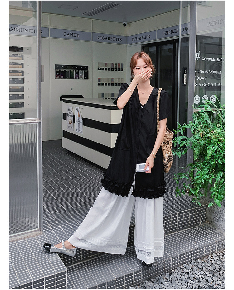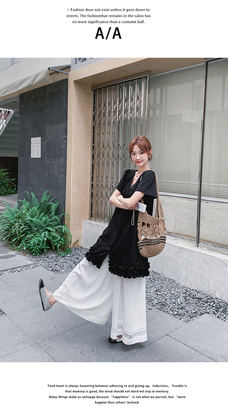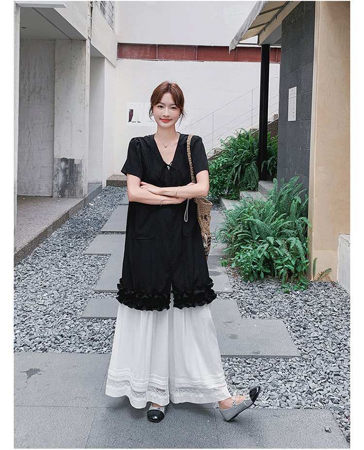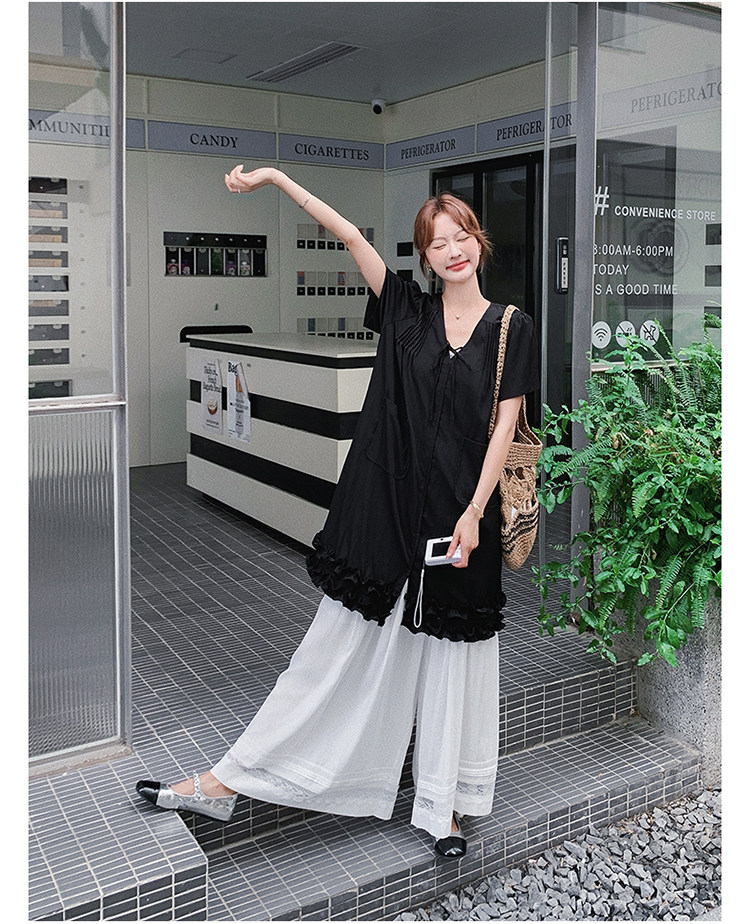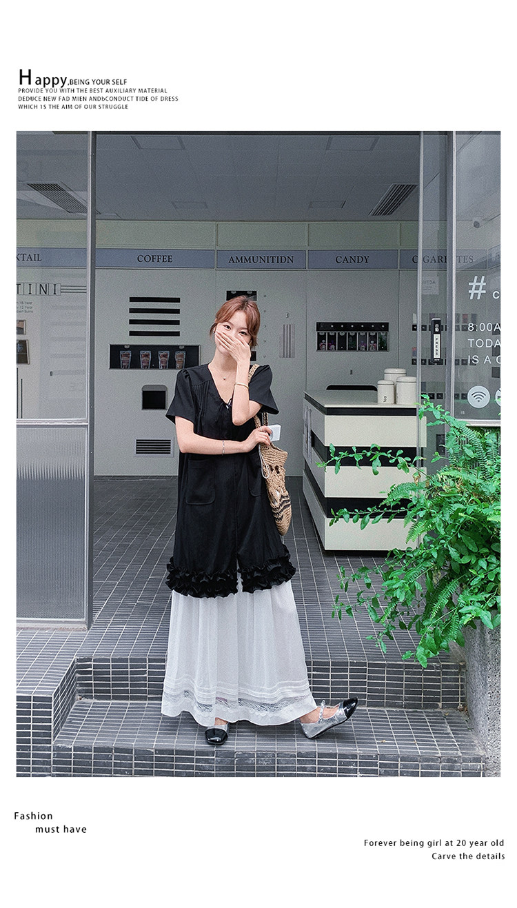 2点セット!【セットアップ】リラックス感 セットアップ フリル Vネックトップス+ワイドパンツ 上下セット 気質よく細見えカジュアルスタイル【JZシリーズ】