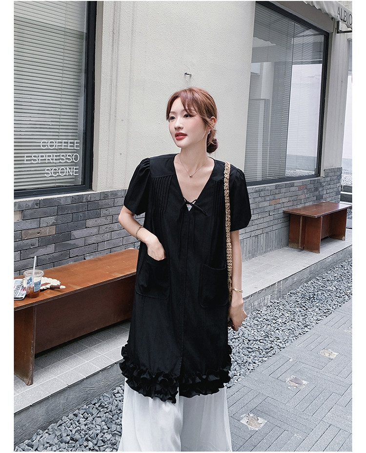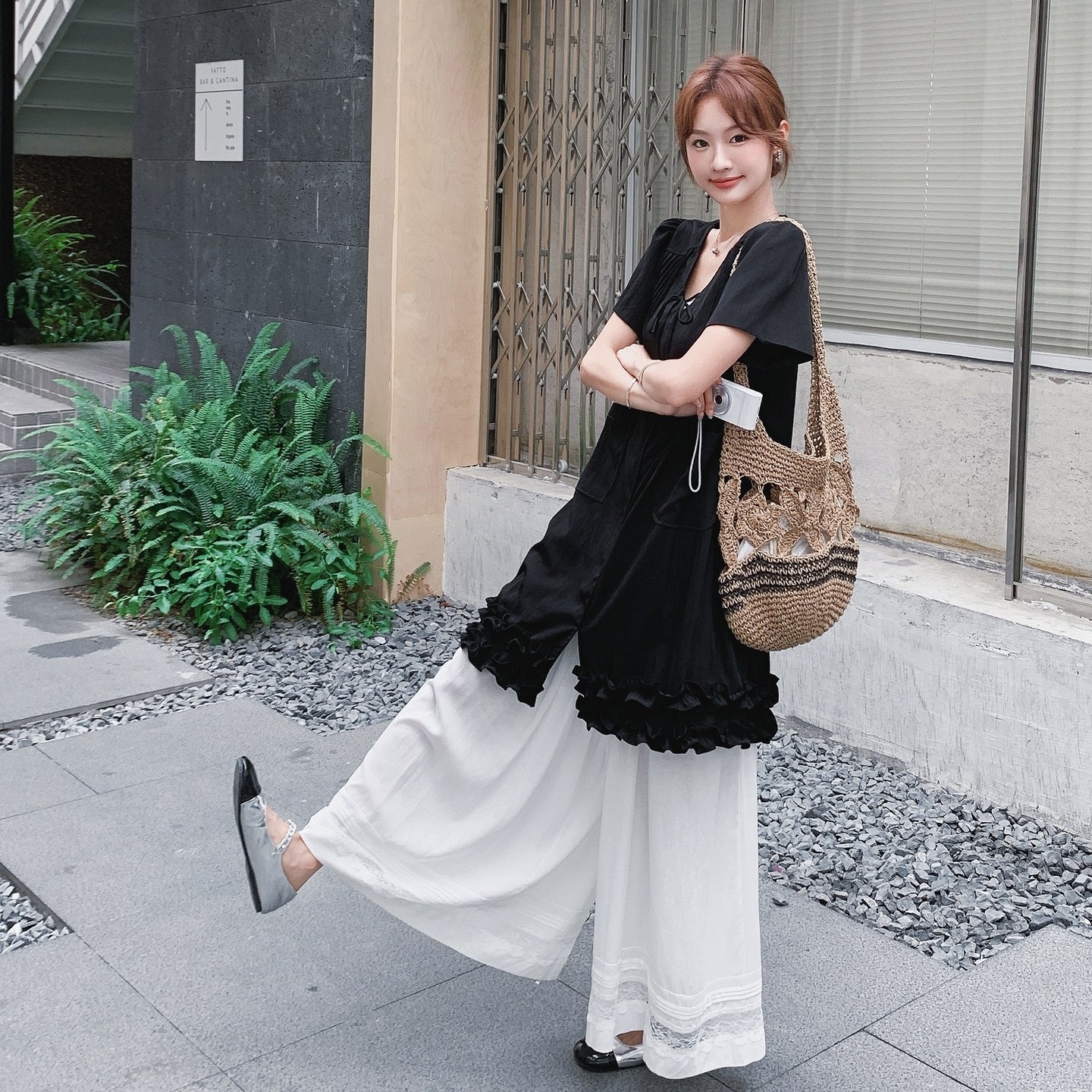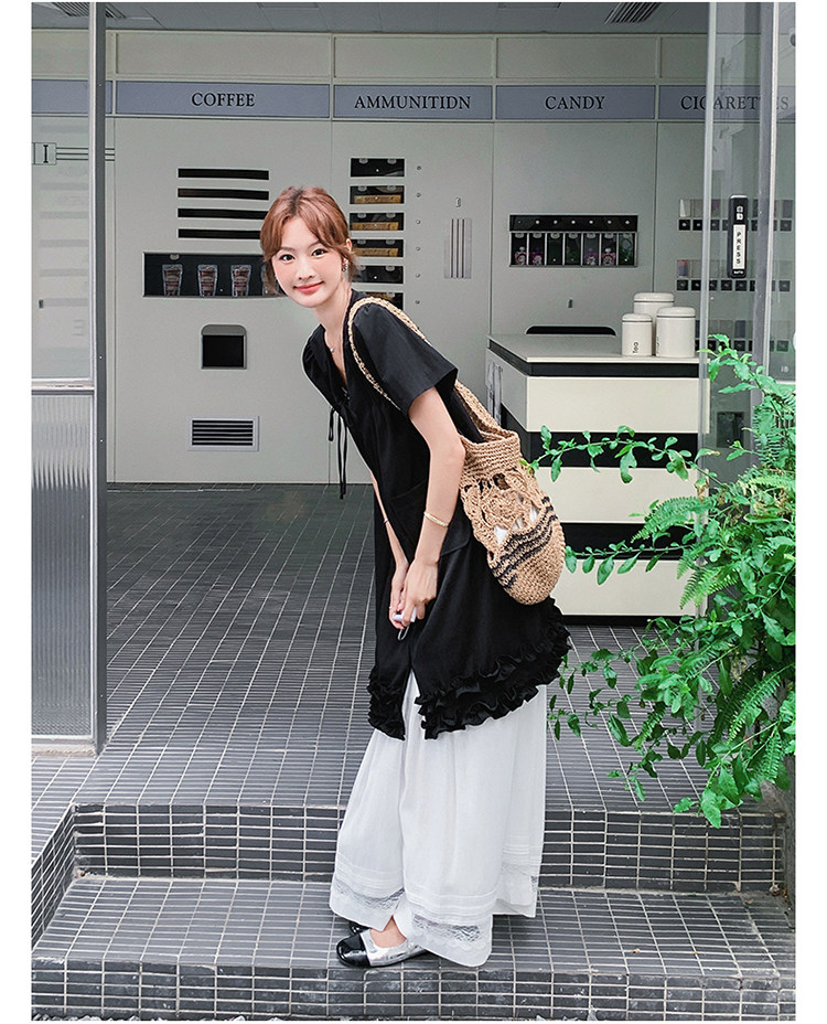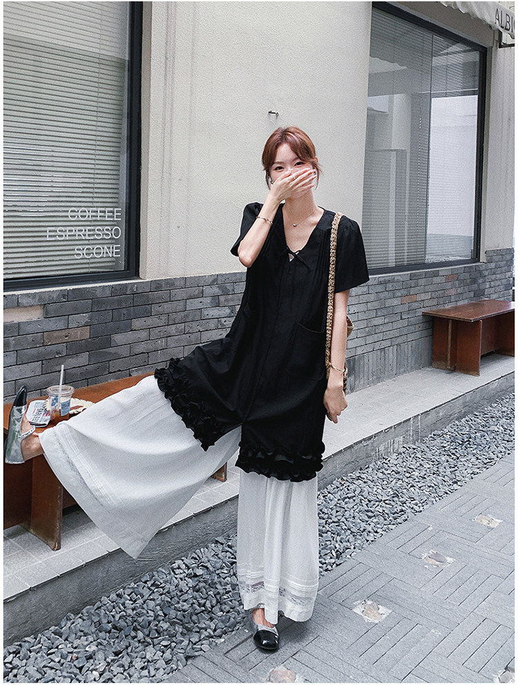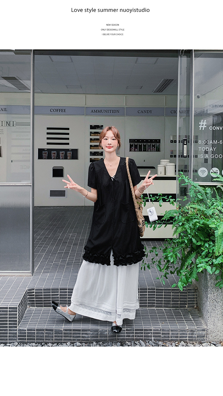 2点セット!【セットアップ】リラックス感 セットアップ フリル Vネックトップス+ワイドパンツ 上下セット 気質よく細見えカジュアルスタイル【JZシリーズ】