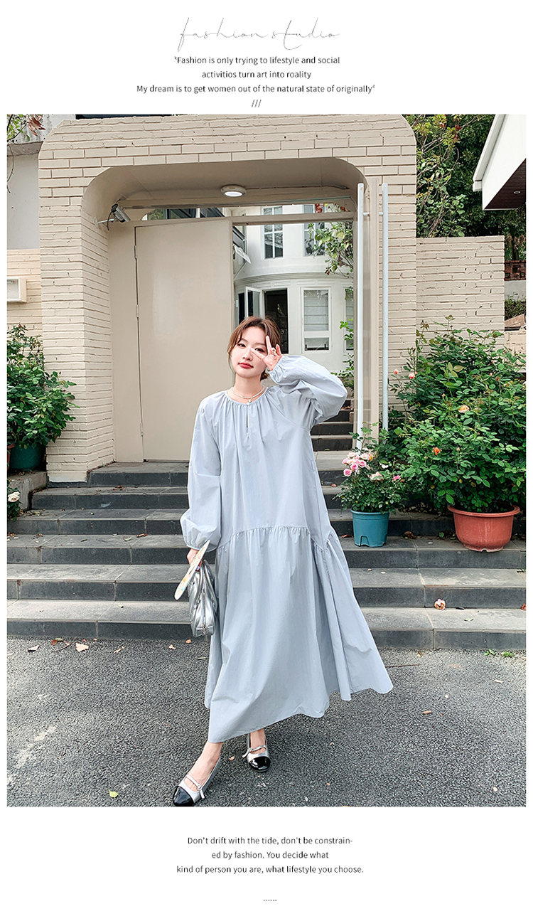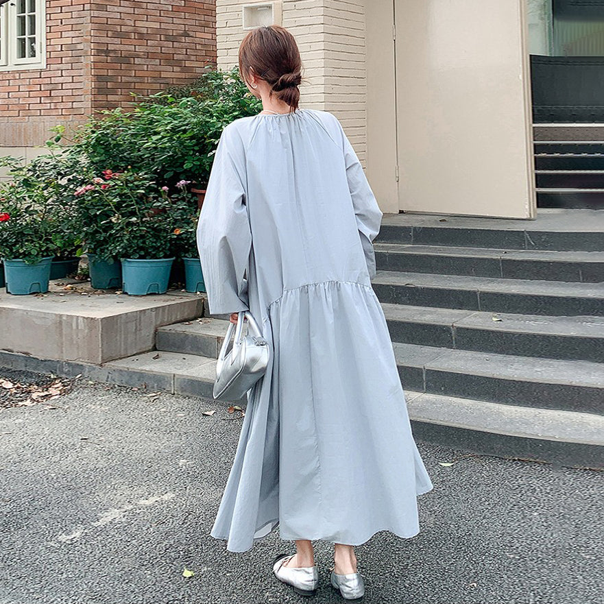 【ワンピース】細見え 日系 Vネック 無地 長袖ワンピース 切替デザイン ゆったり 気質ロング【JZシリーズ】【AHシリーズ】