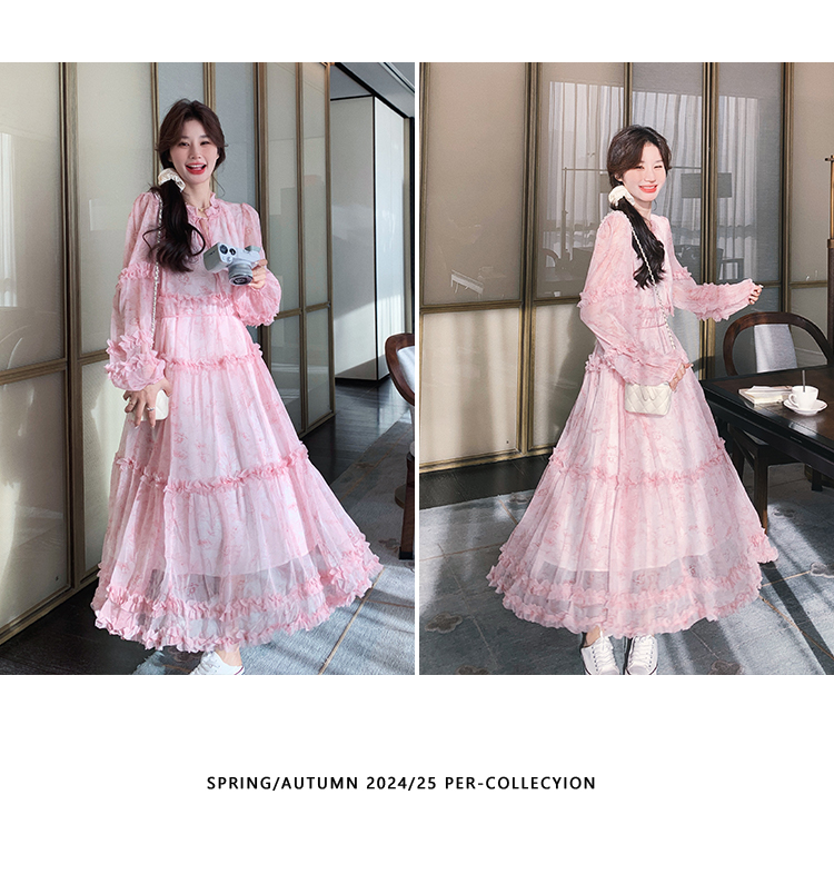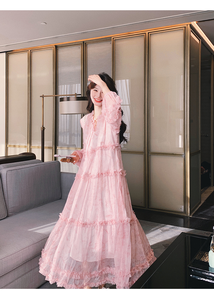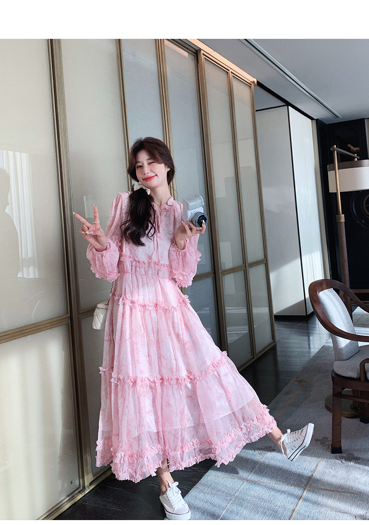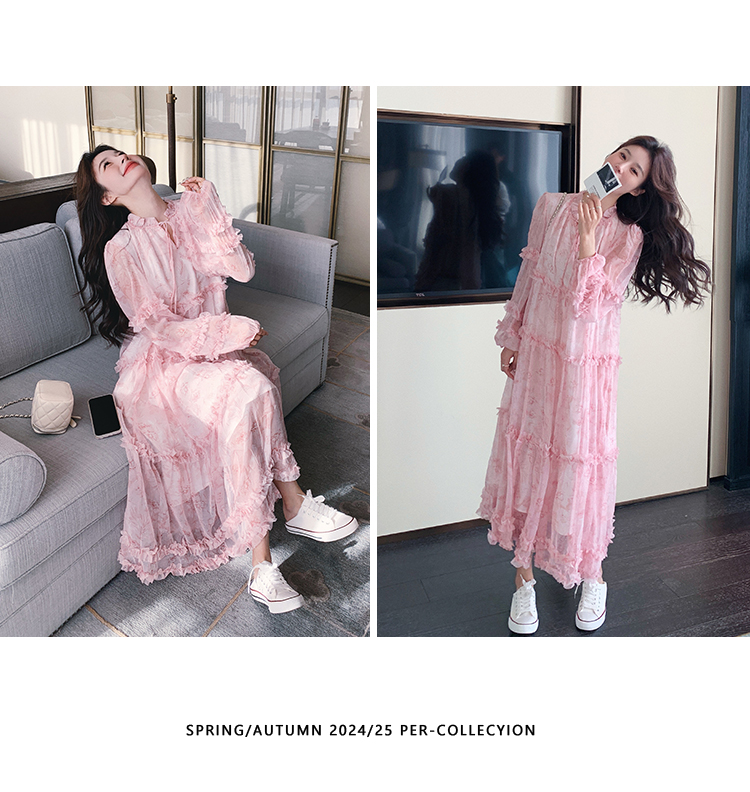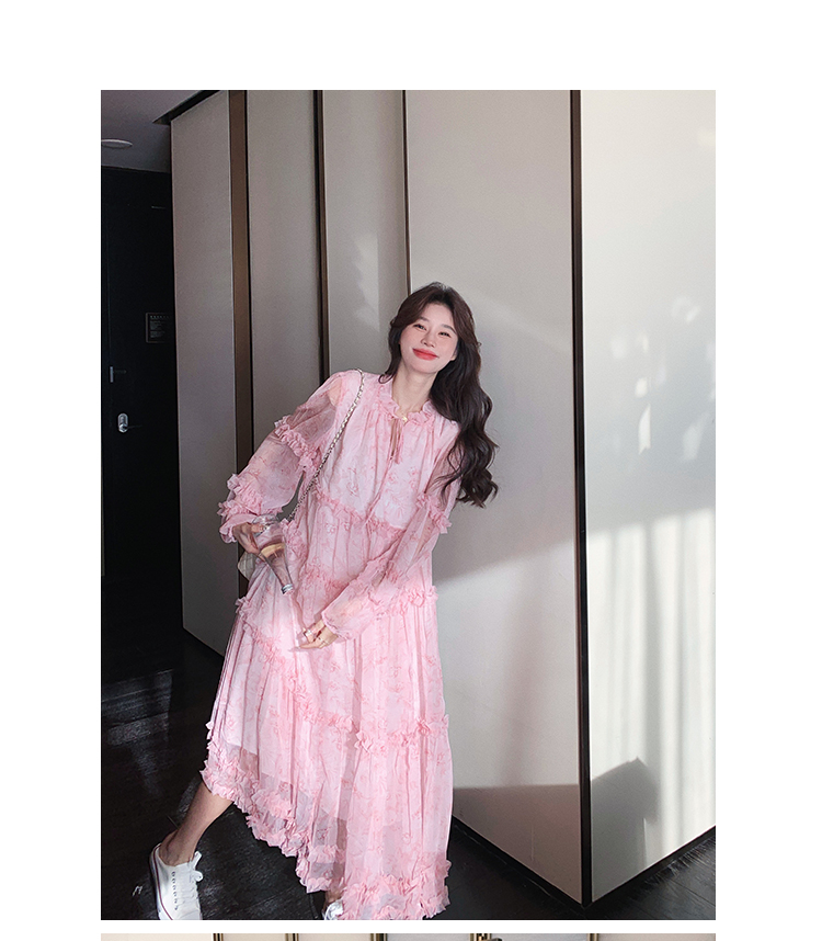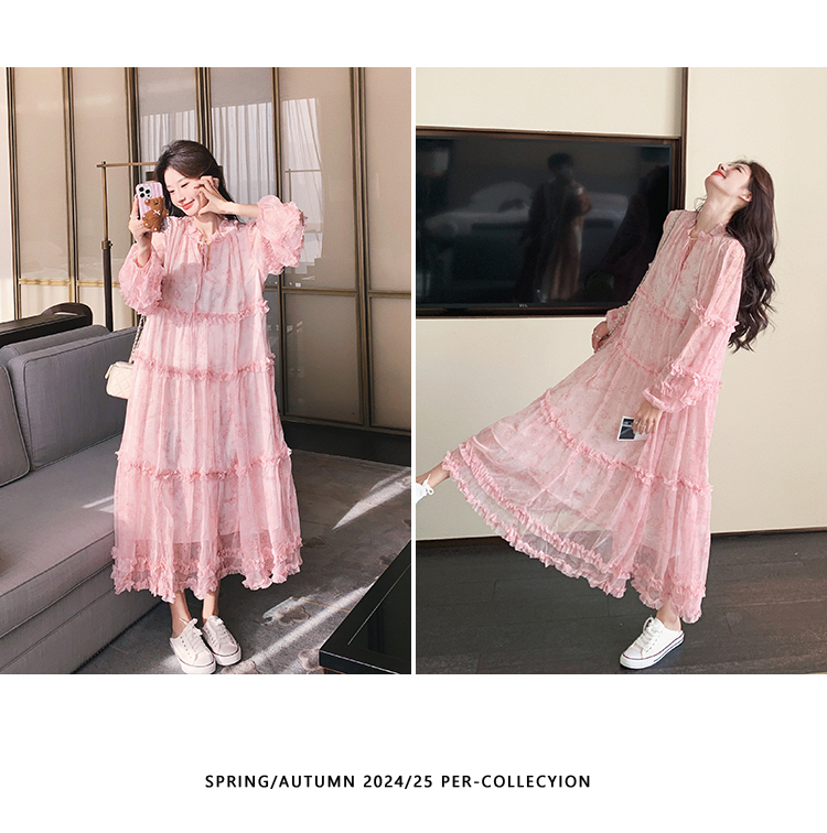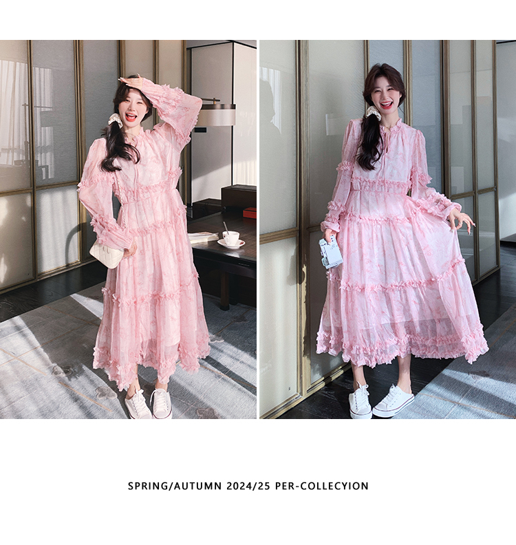 【商品名】【ワンピース】透かし編み 水墨画風花柄長袖ワンピース レディース 春秋 トレンド 超可愛い【SHシリーズ】