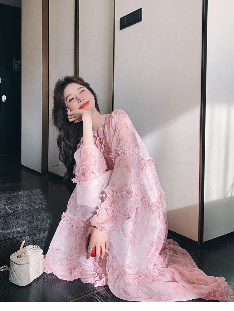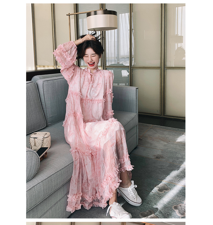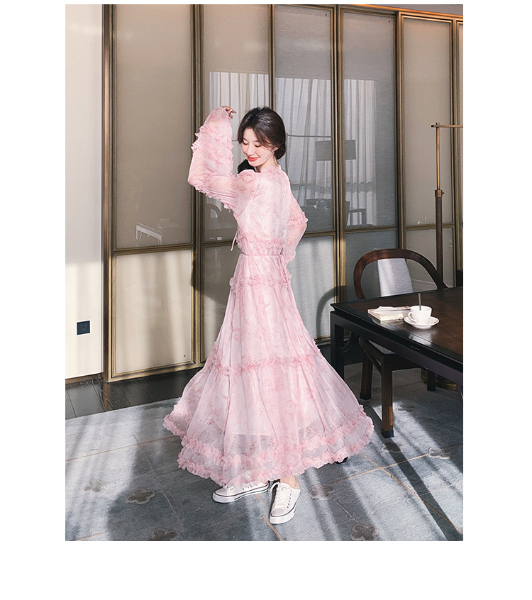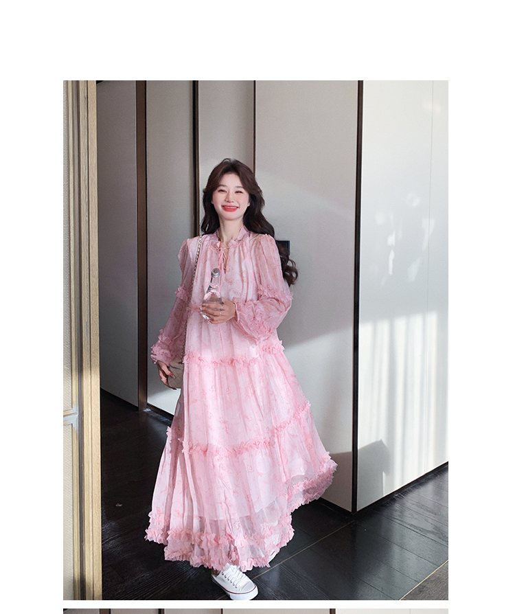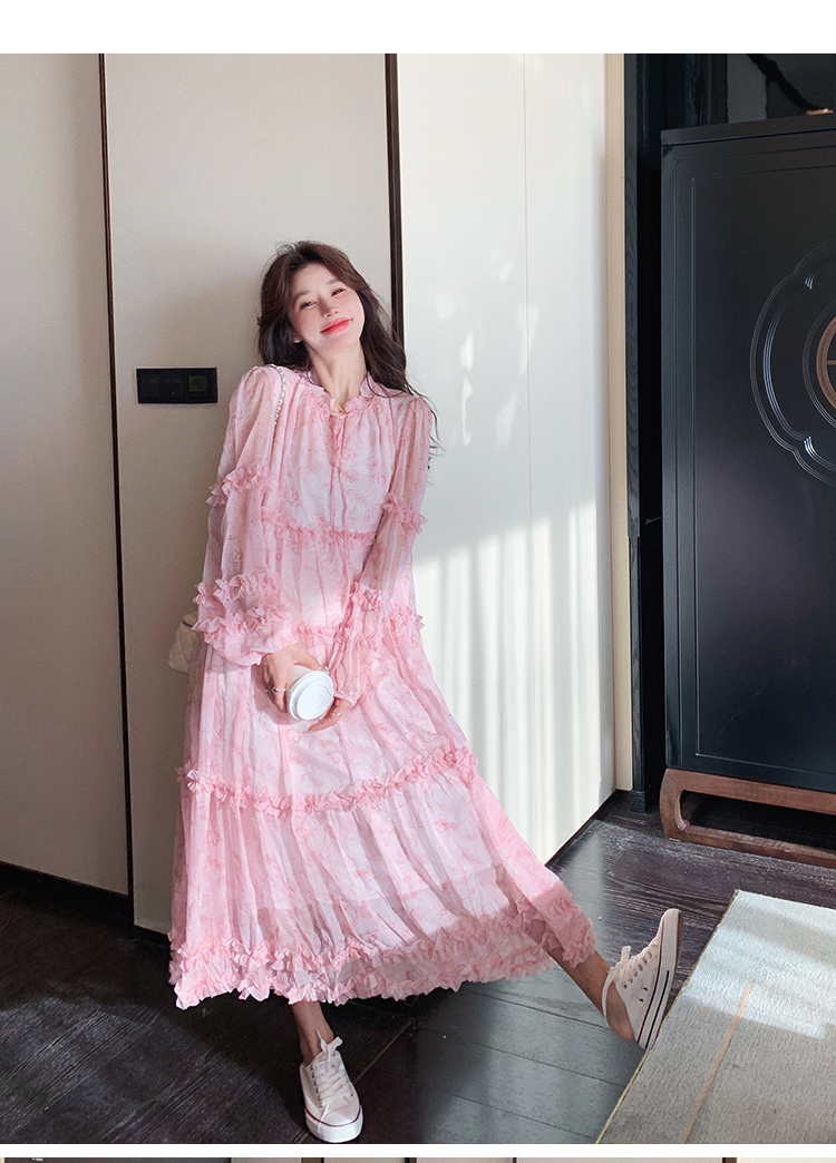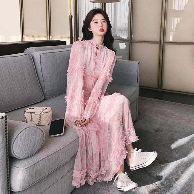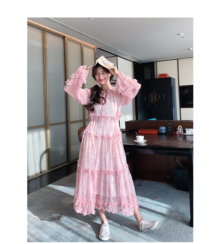 【商品名】【ワンピース】透かし編み 水墨画風花柄長袖ワンピース レディース 春秋 トレンド 超可愛い【SHシリーズ】