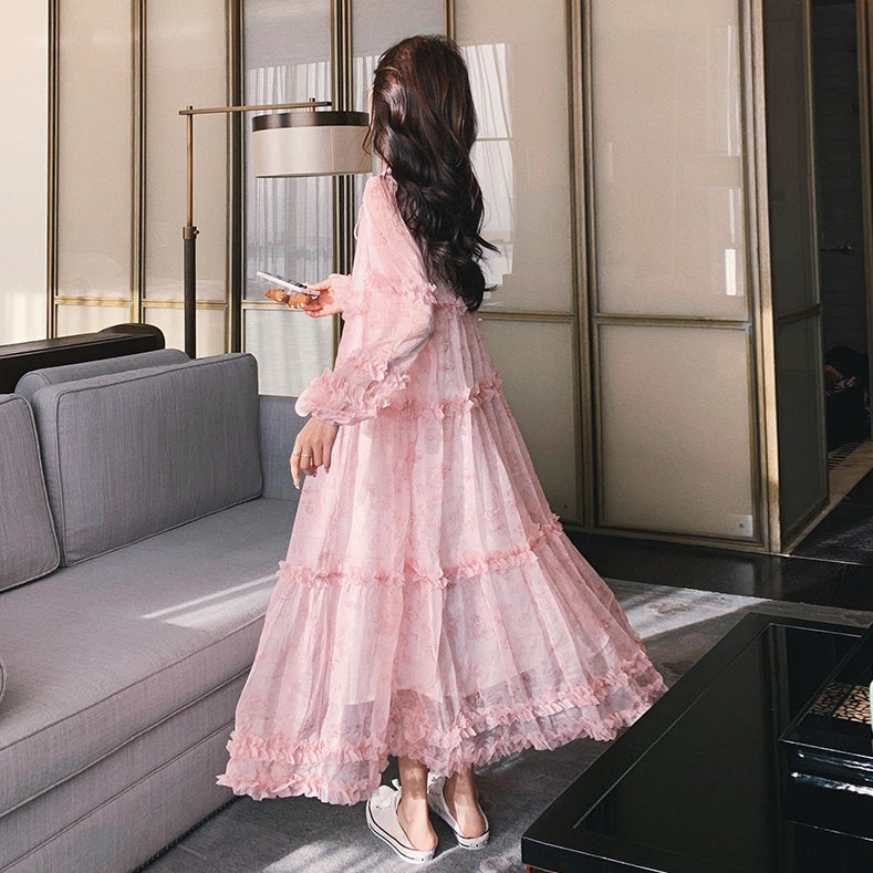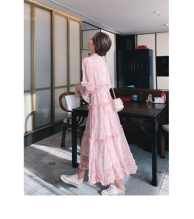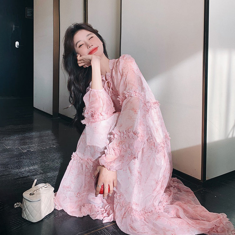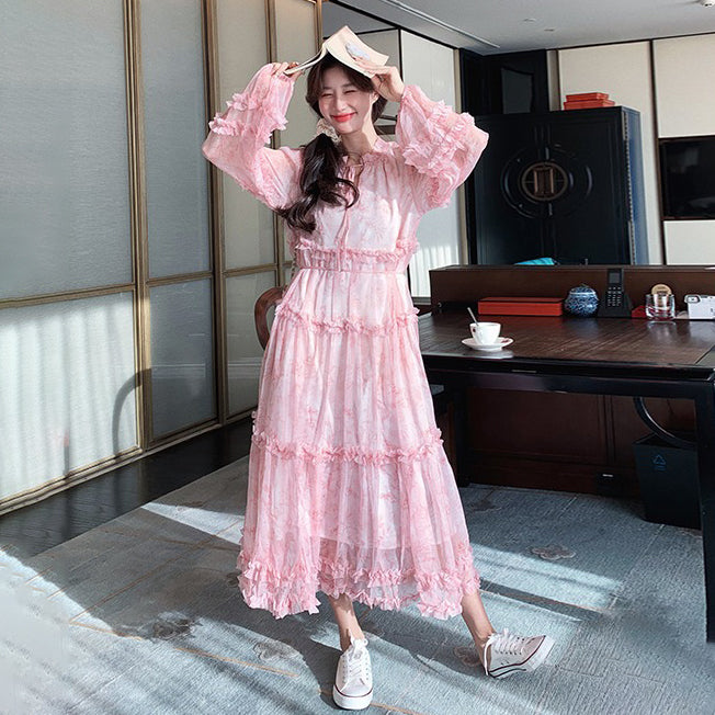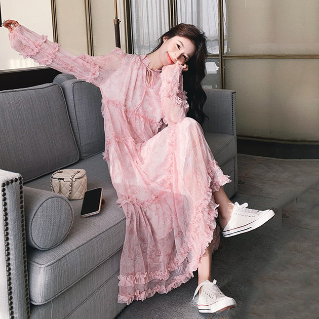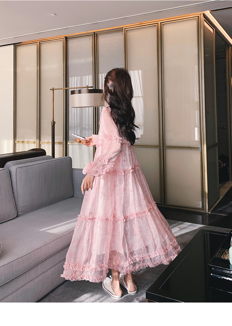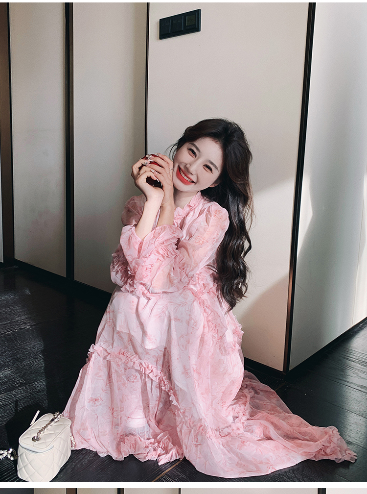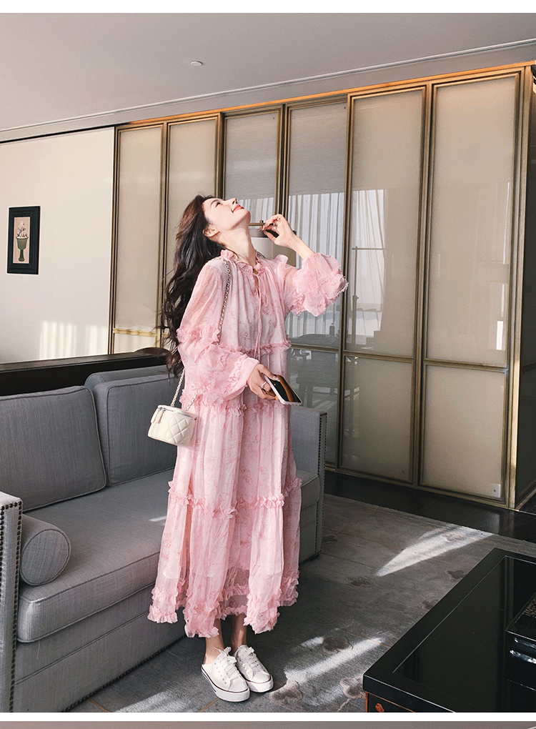 【商品名】【ワンピース】透かし編み 水墨画風花柄長袖ワンピース レディース 春秋 トレンド 超可愛い【SHシリーズ】