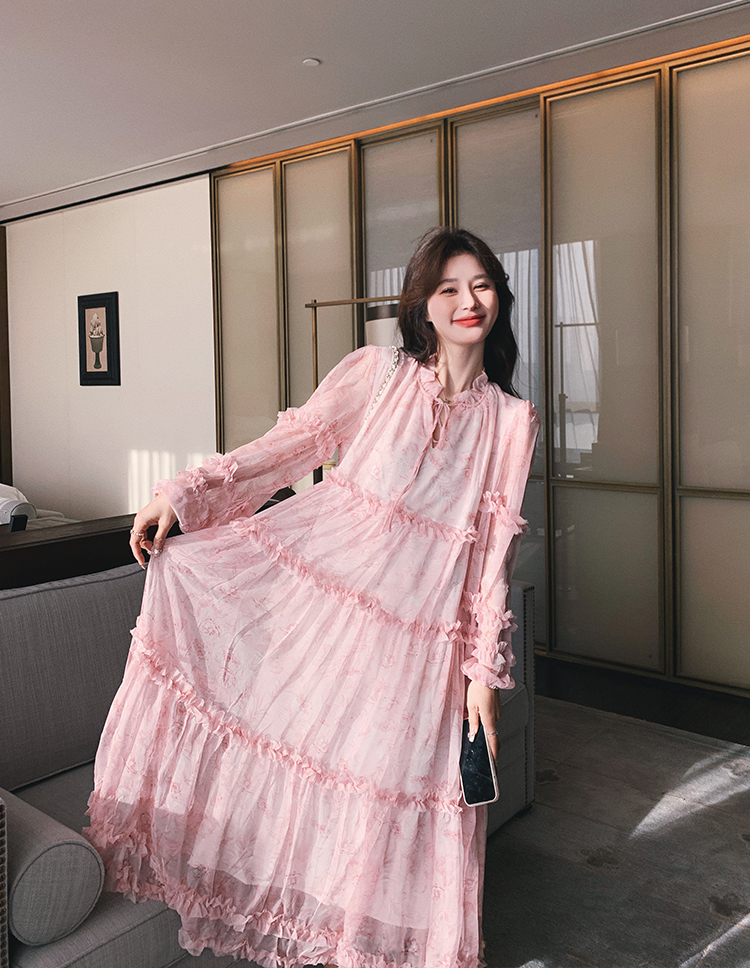 【ワンピース】透かし編み 水墨画風花柄長袖ワンピース レディース 春秋 トレンド 超可愛い【SHシリーズ】