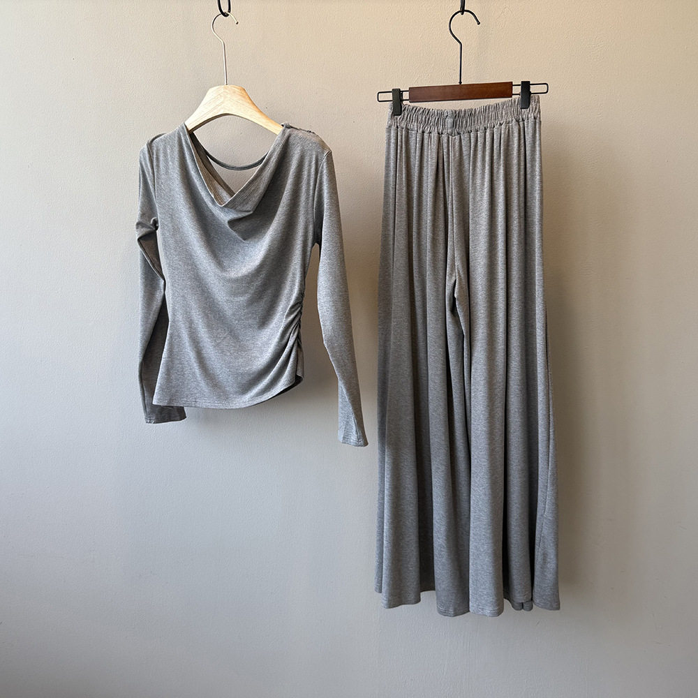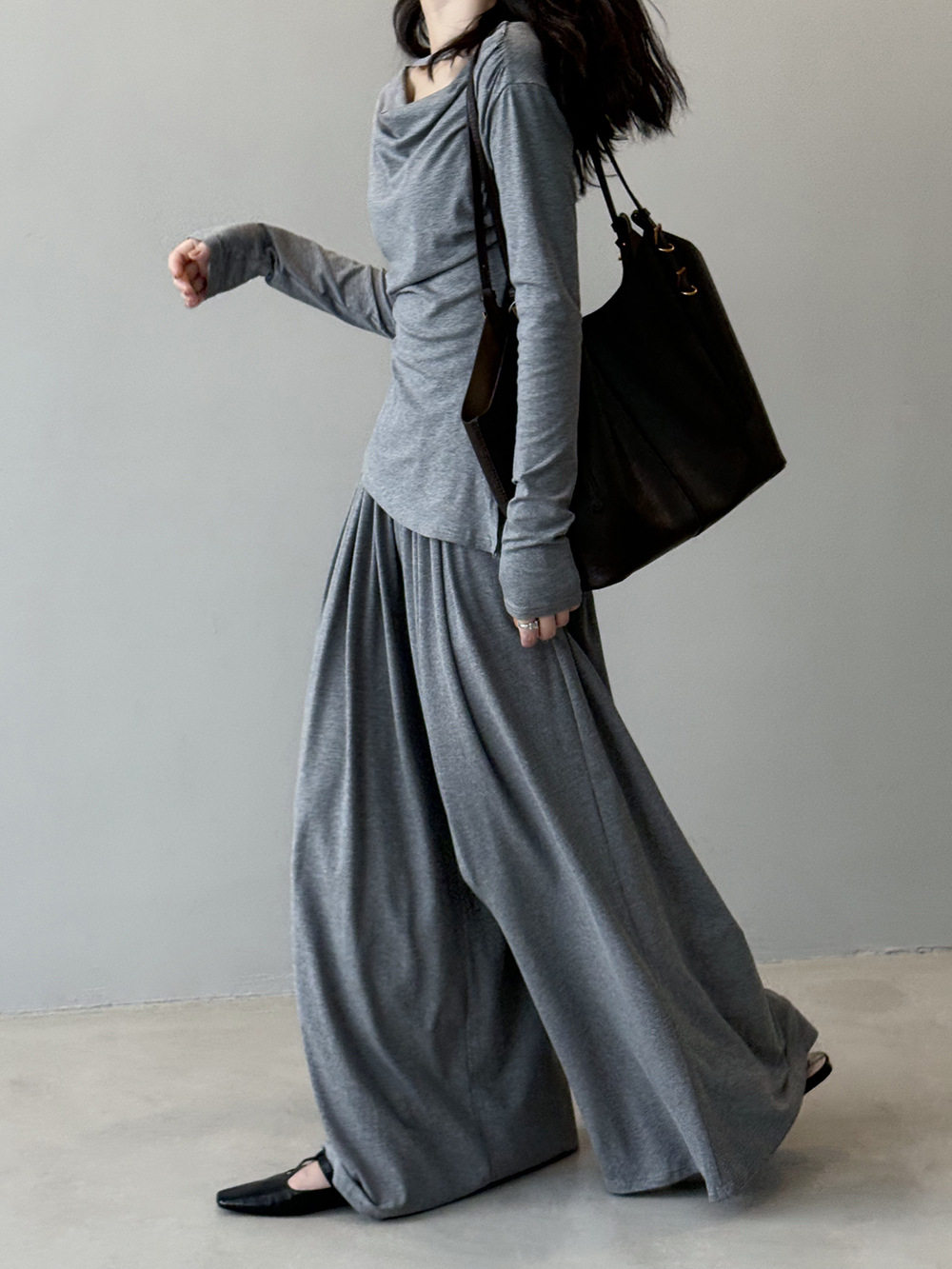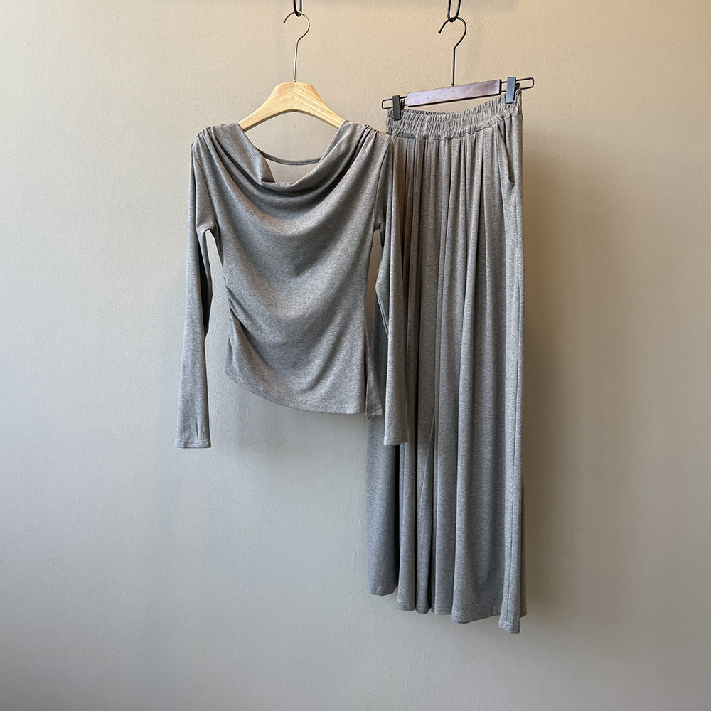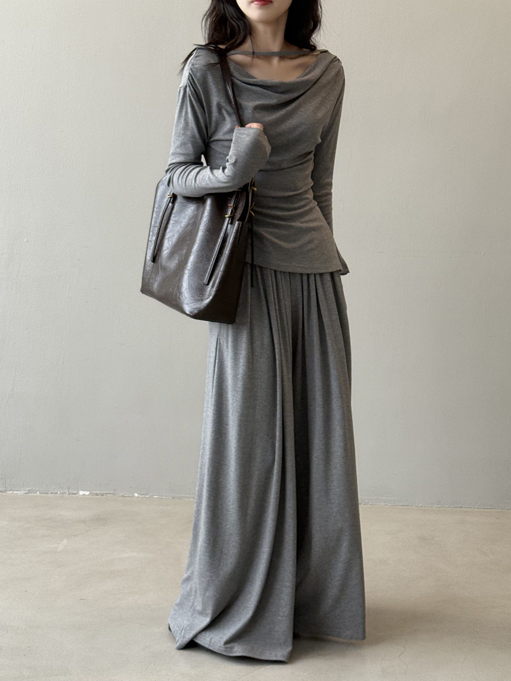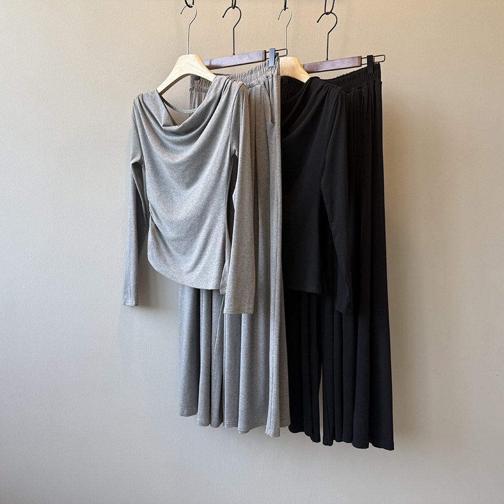 2点セット!【セットアップ】フレンチ ウエストマークTシャツ+ハイウエストドレープ感フルレングスパンツ レディース 秋 リラックス風 上下セット【JZシリーズ】