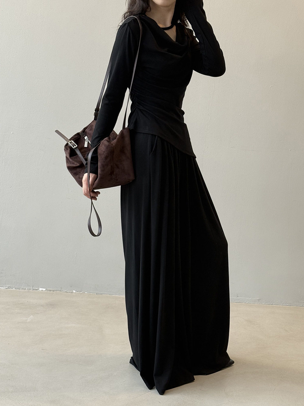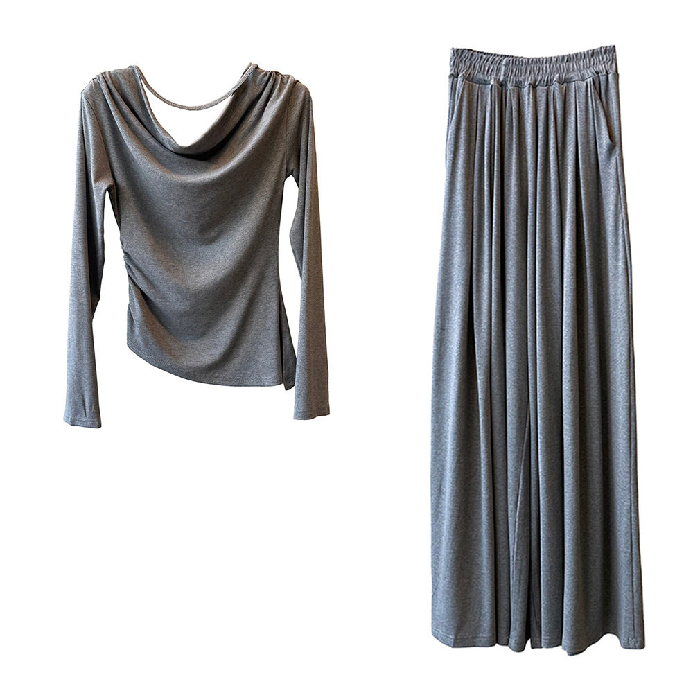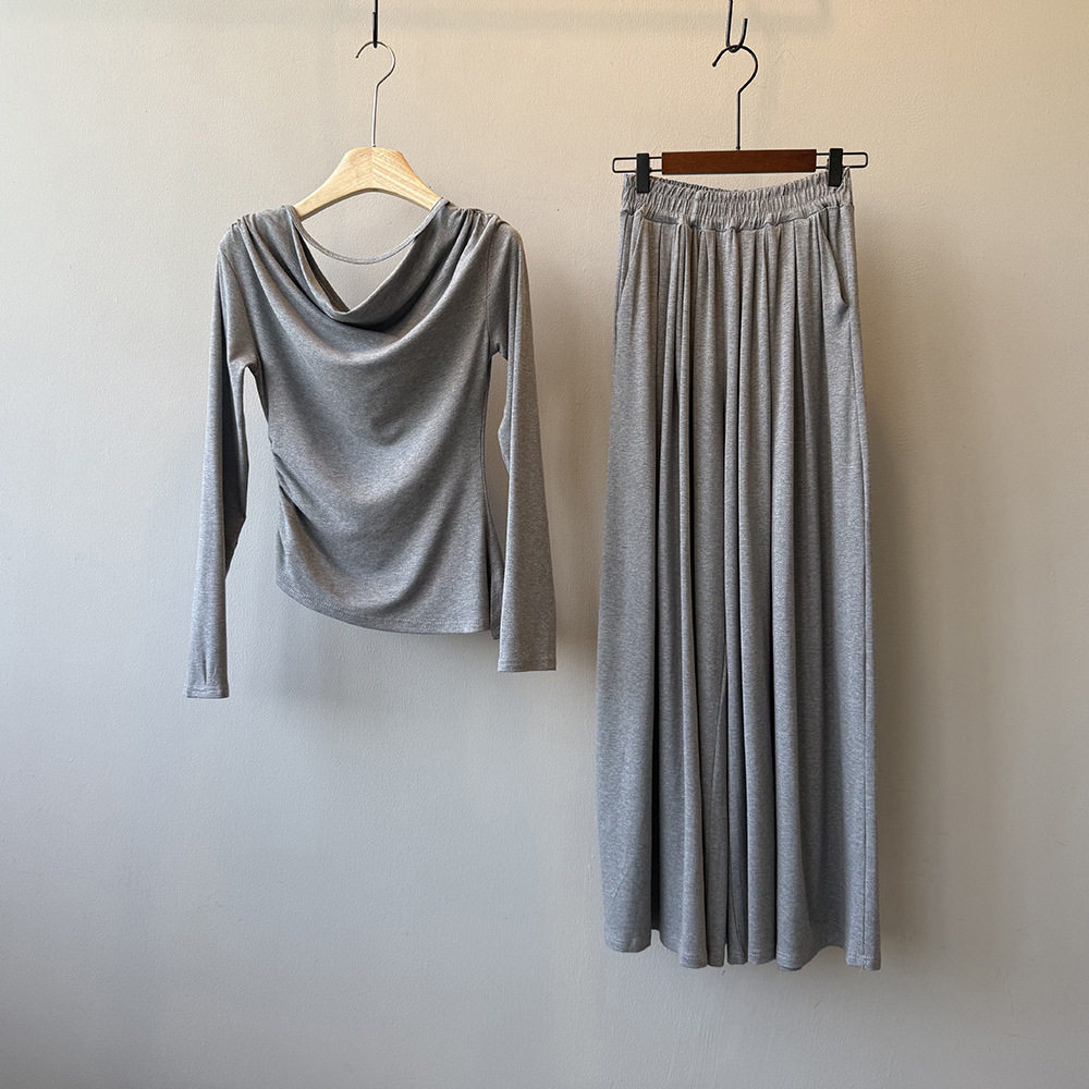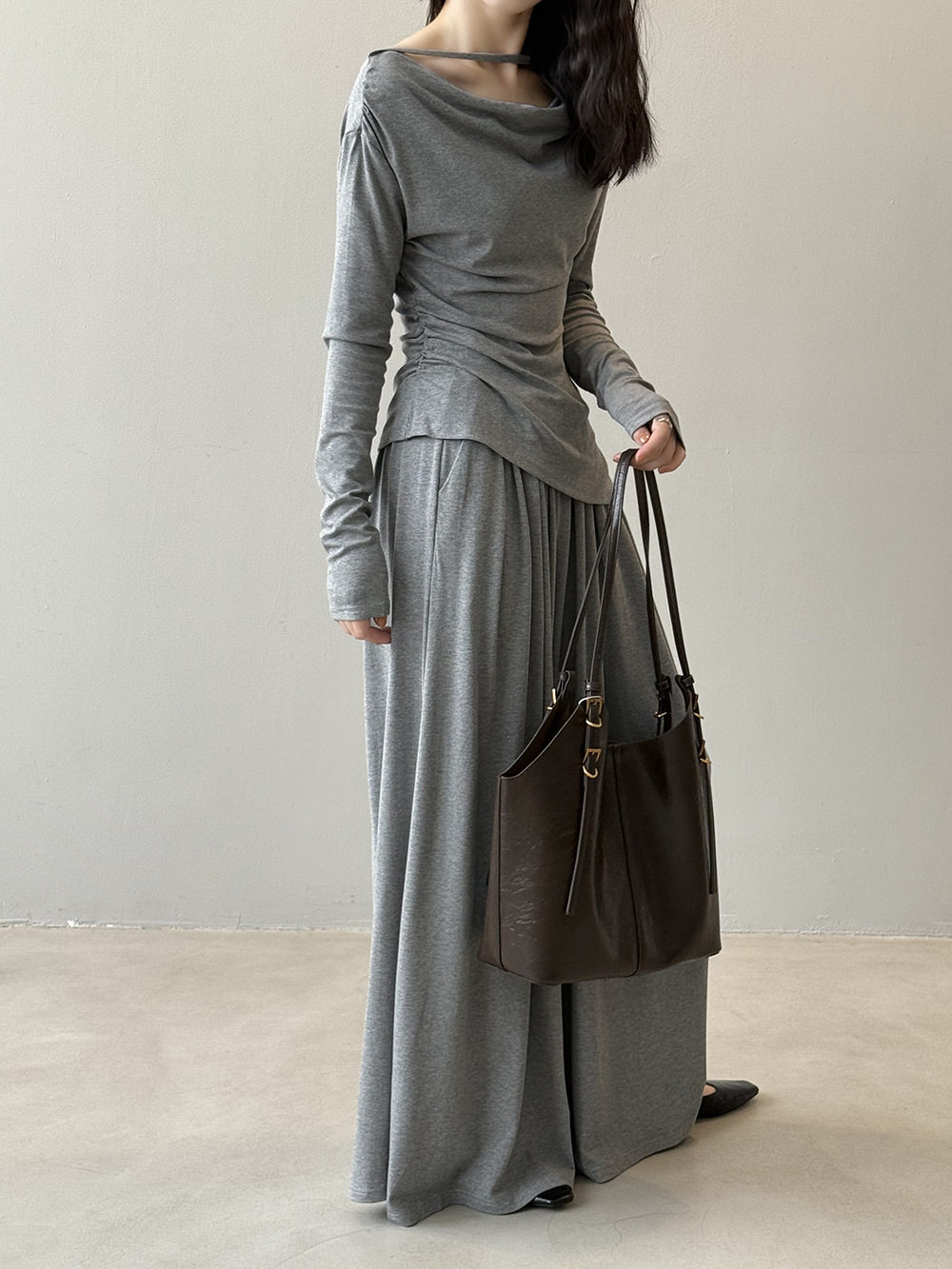 2点セット!【セットアップ】フレンチ ウエストマークTシャツ+ハイウエストドレープ感フルレングスパンツ レディース 秋 リラックス風 上下セット【JZシリーズ】