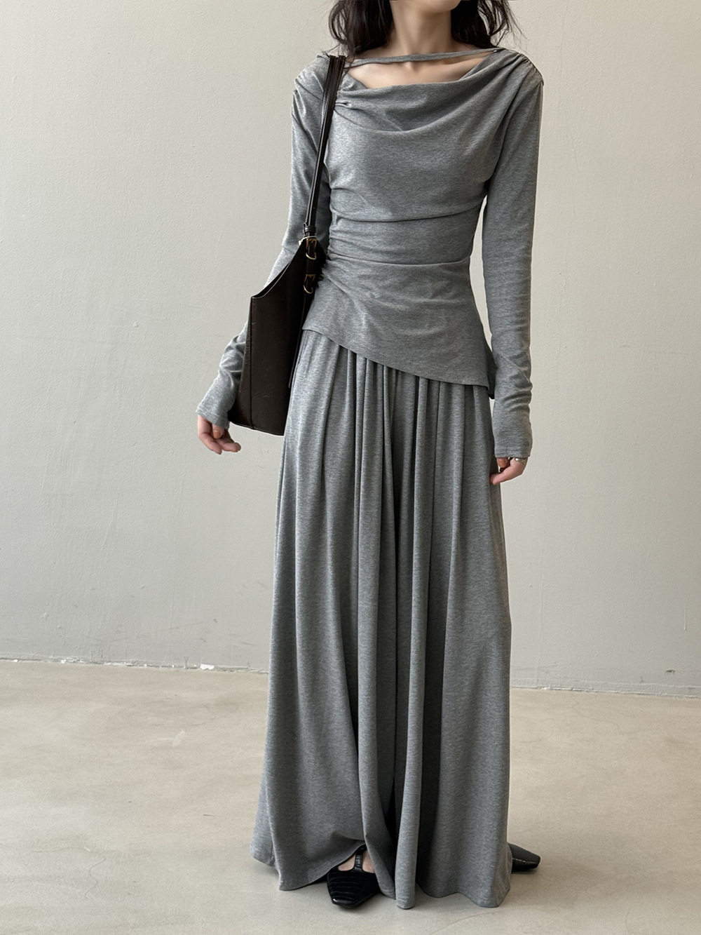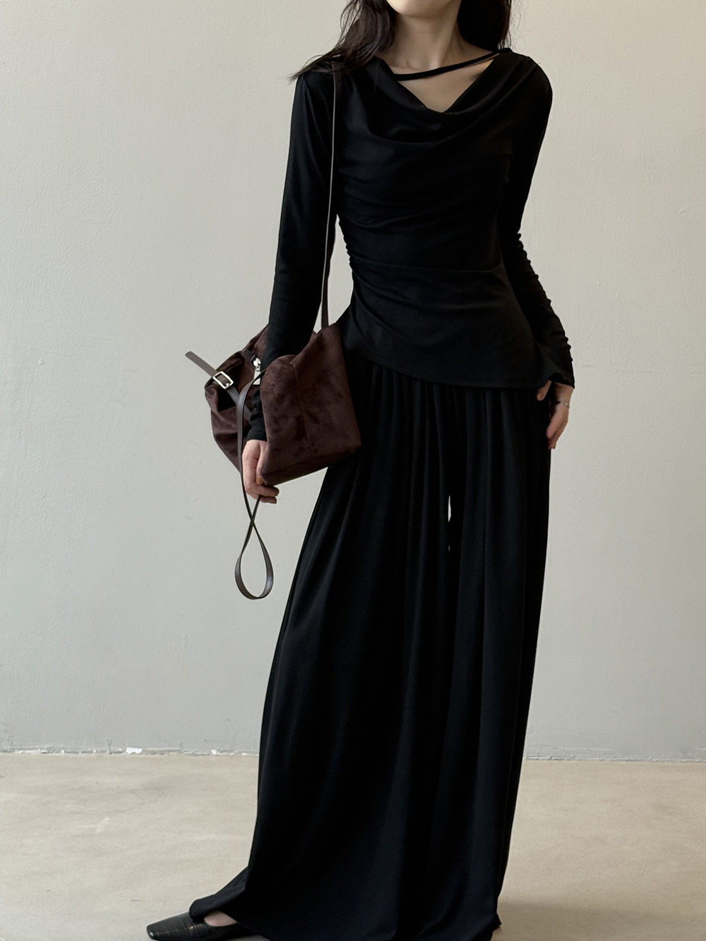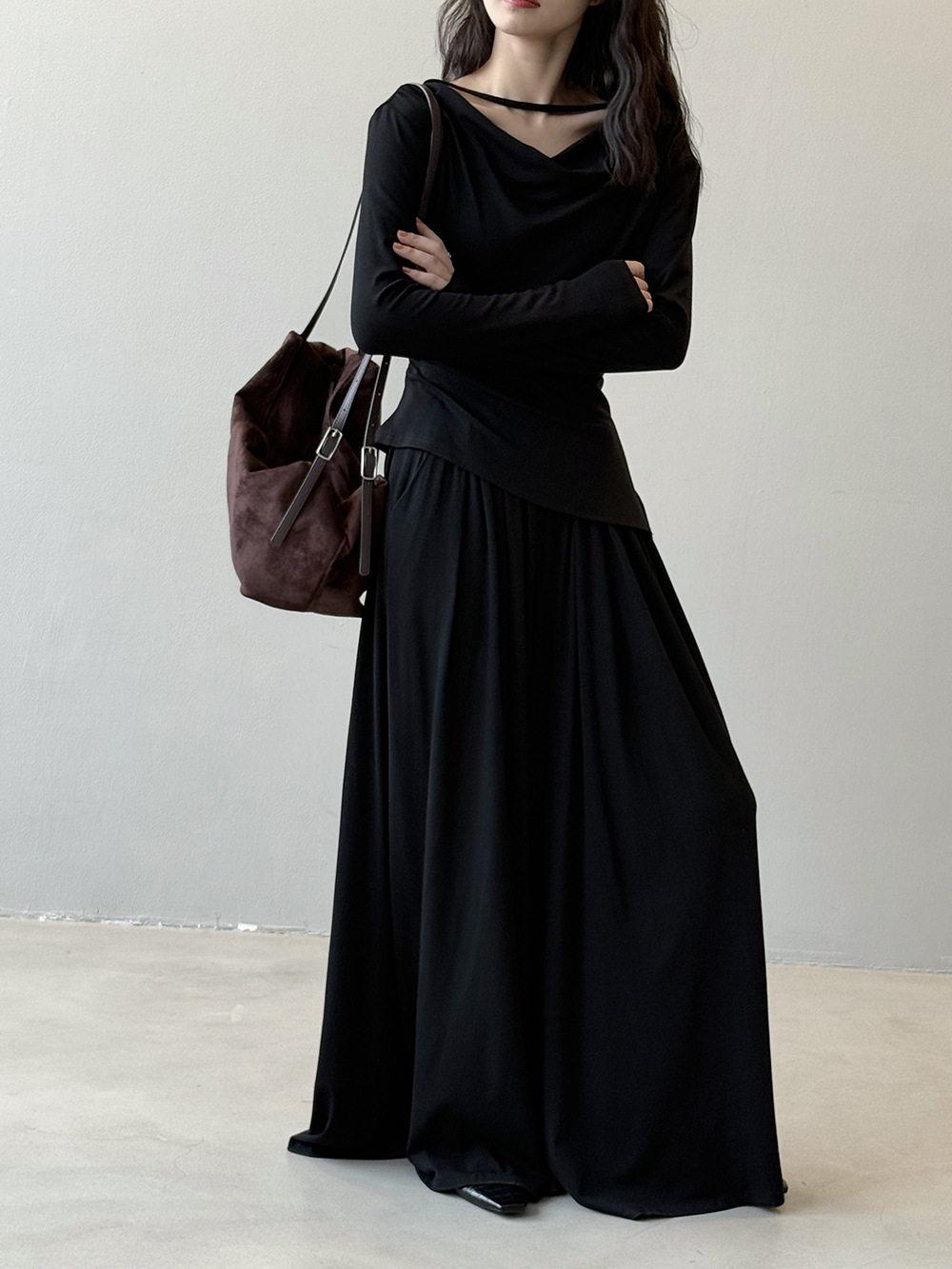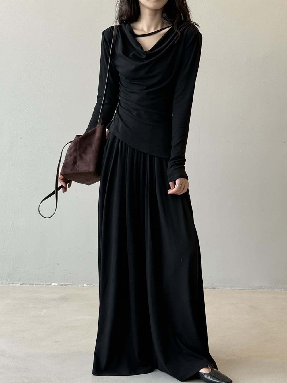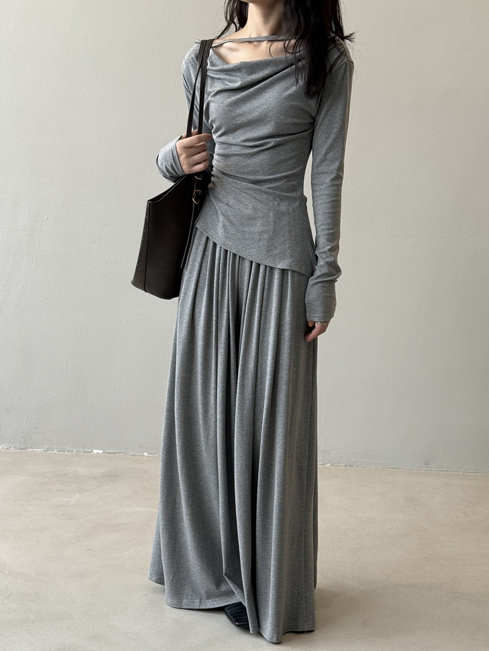 2点セット!【セットアップ】フレンチ ウエストマークTシャツ+ハイウエストドレープ感フルレングスパンツ レディース 秋 リラックス風 上下セット【JZシリーズ】