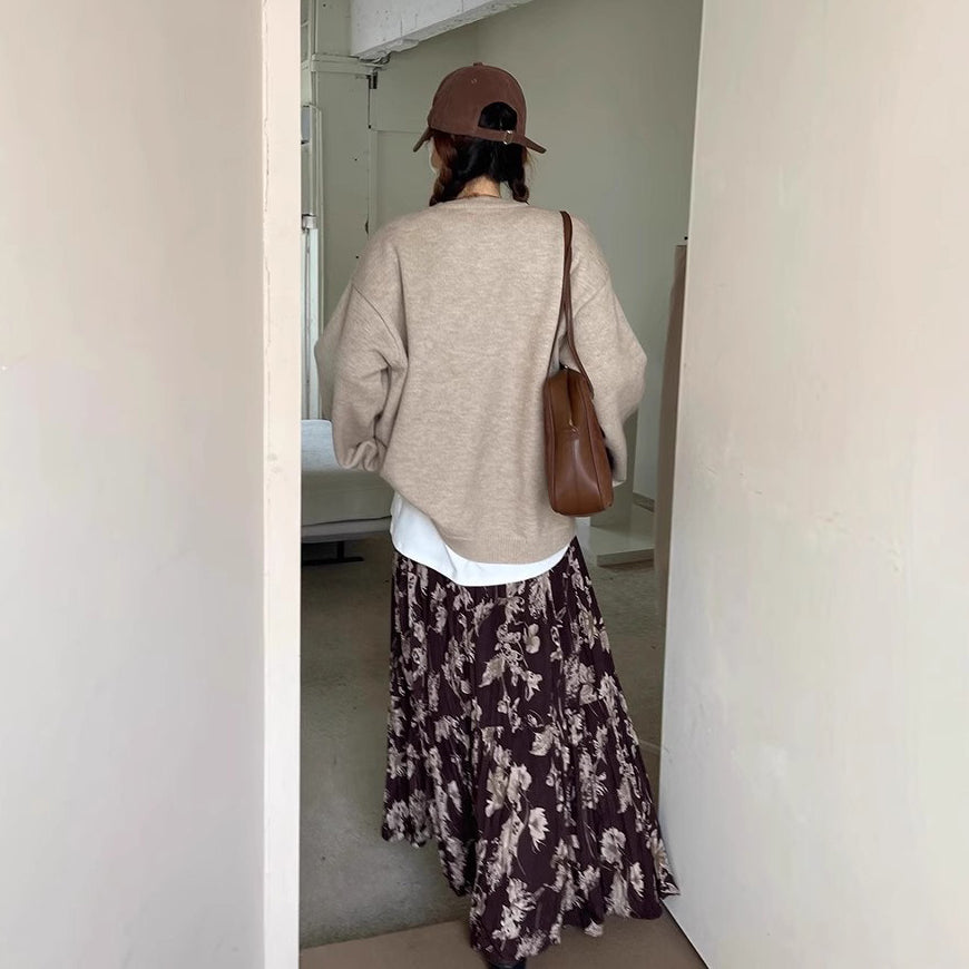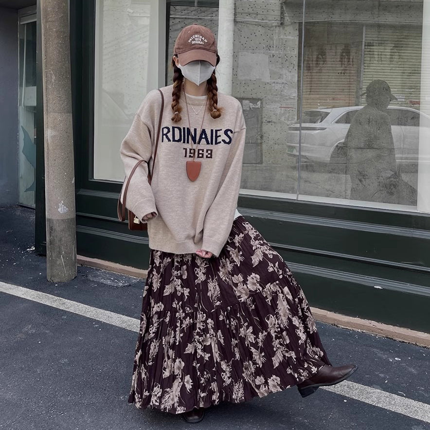 【ワンピース】韓国風 春秋新作 ゆったり大きめサイズ 体型カバー 花柄長袖ミディアムワンピース【SHシリーズ】