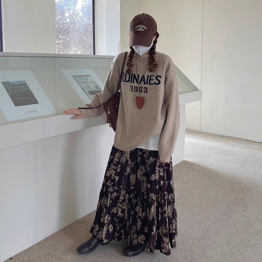 【トップス】レトロ 豹柄 猫 ゆったり ラウンドネック ニットセーター【FCシリーズ】