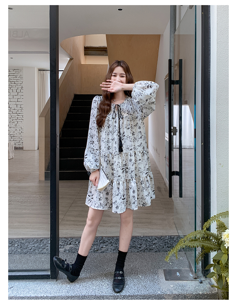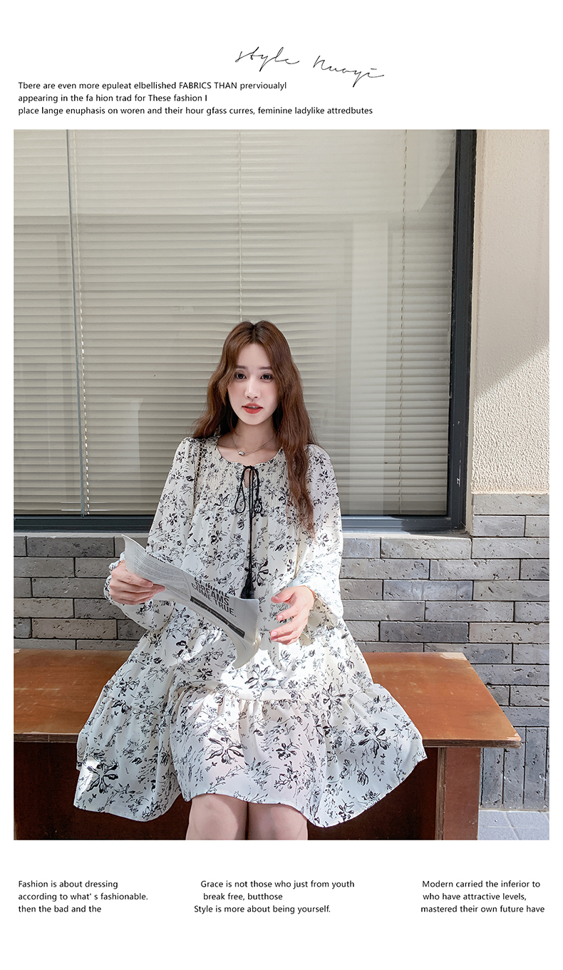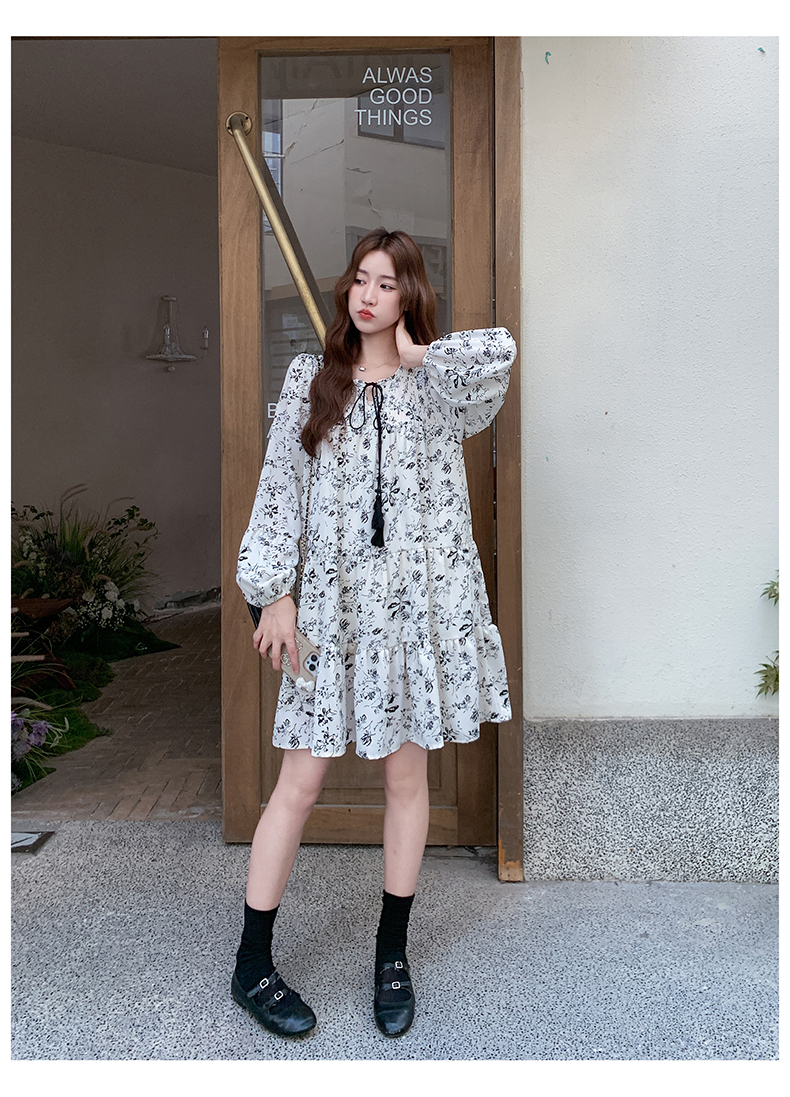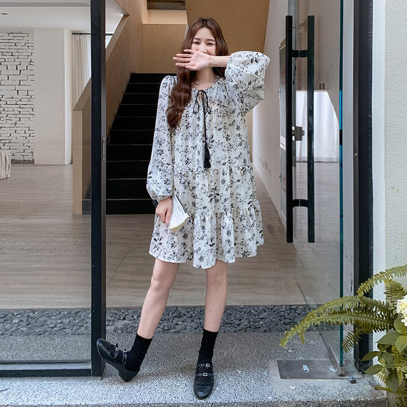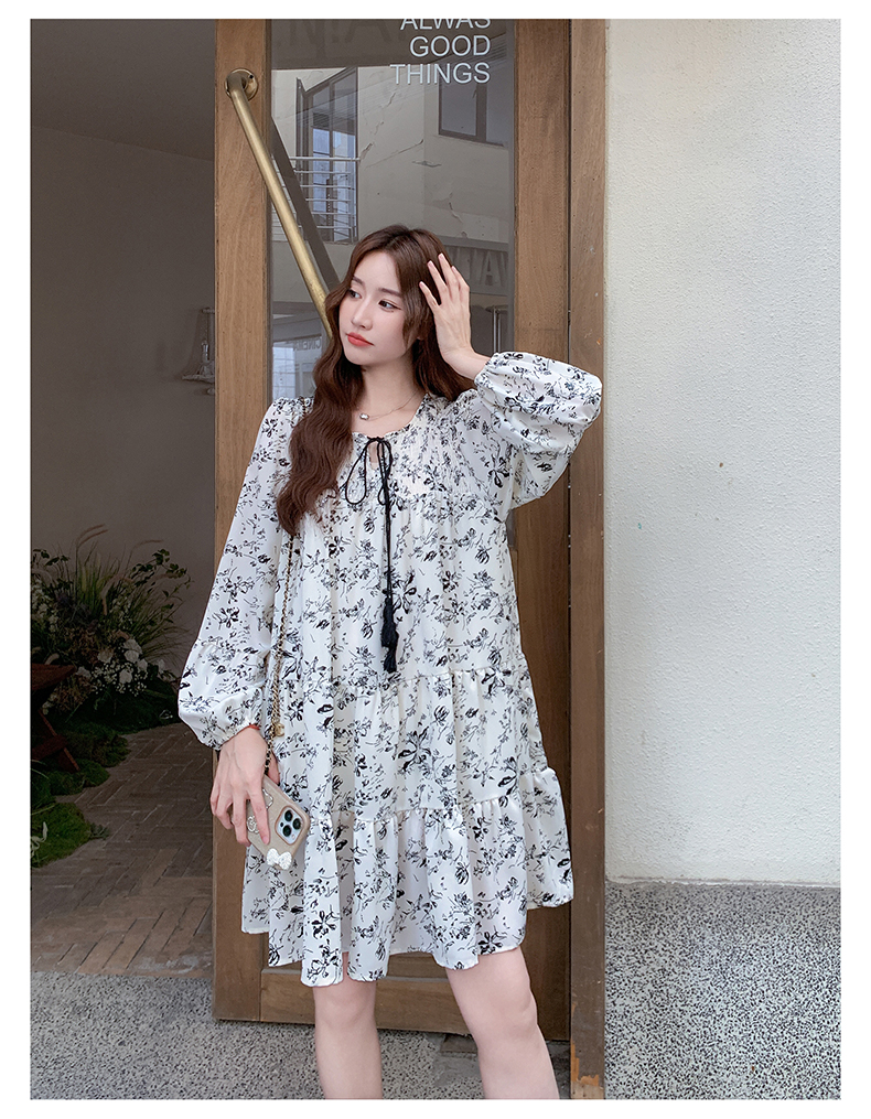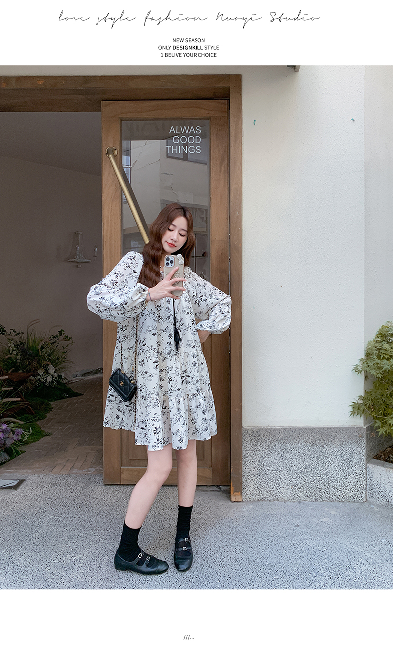【商品名】【ワンピース】花柄 ミニ丈 長袖ワンピース 春夏秋 体型カバー 細見え 着回し万能【SHシリーズ】