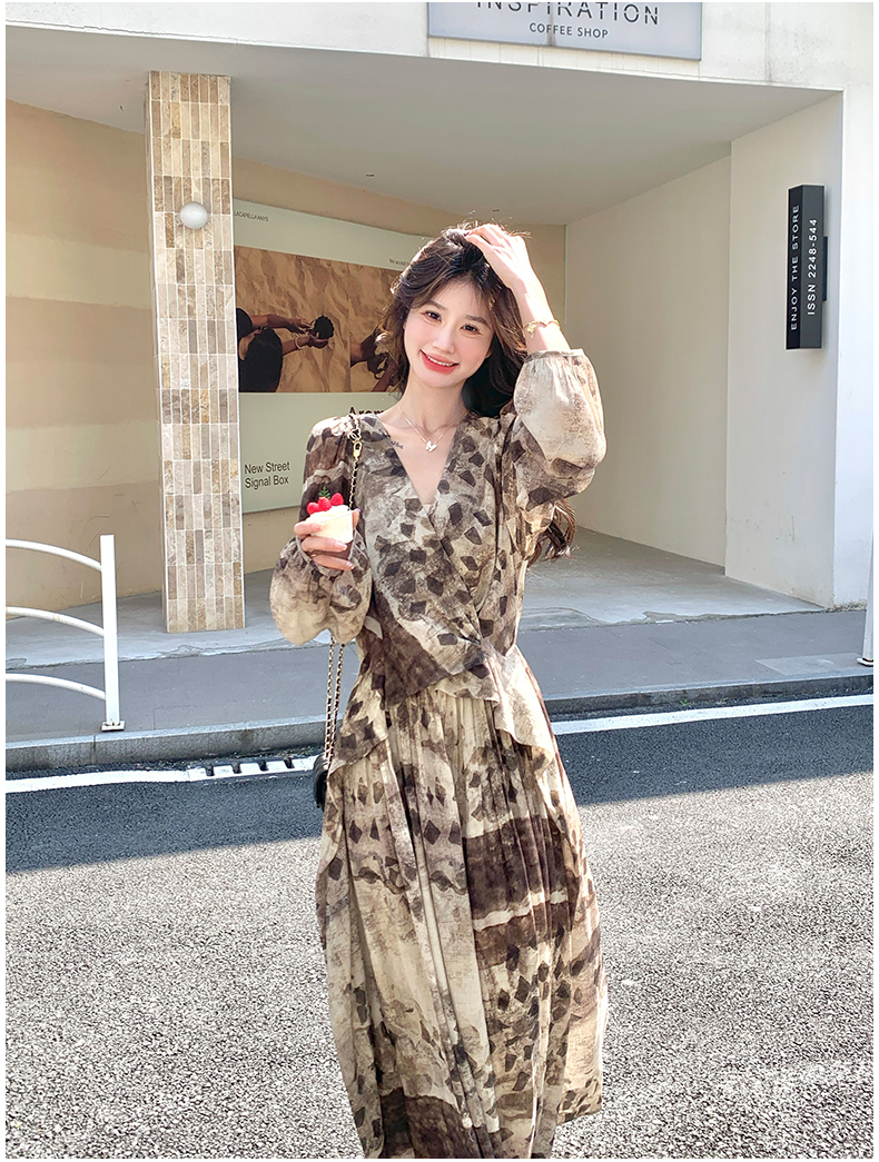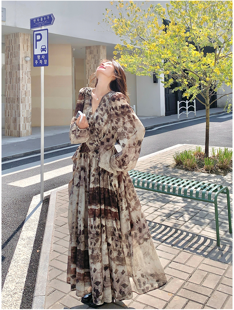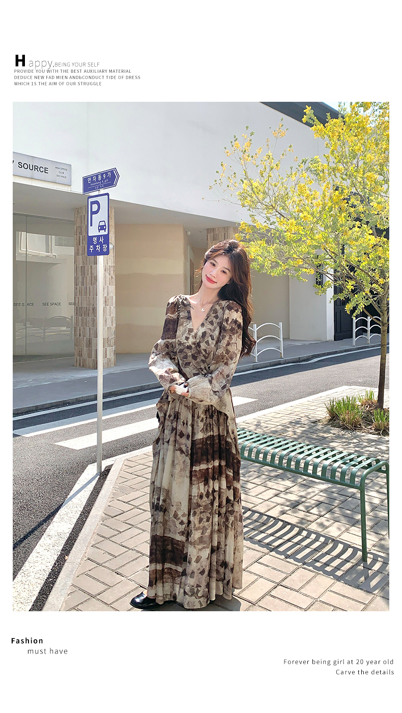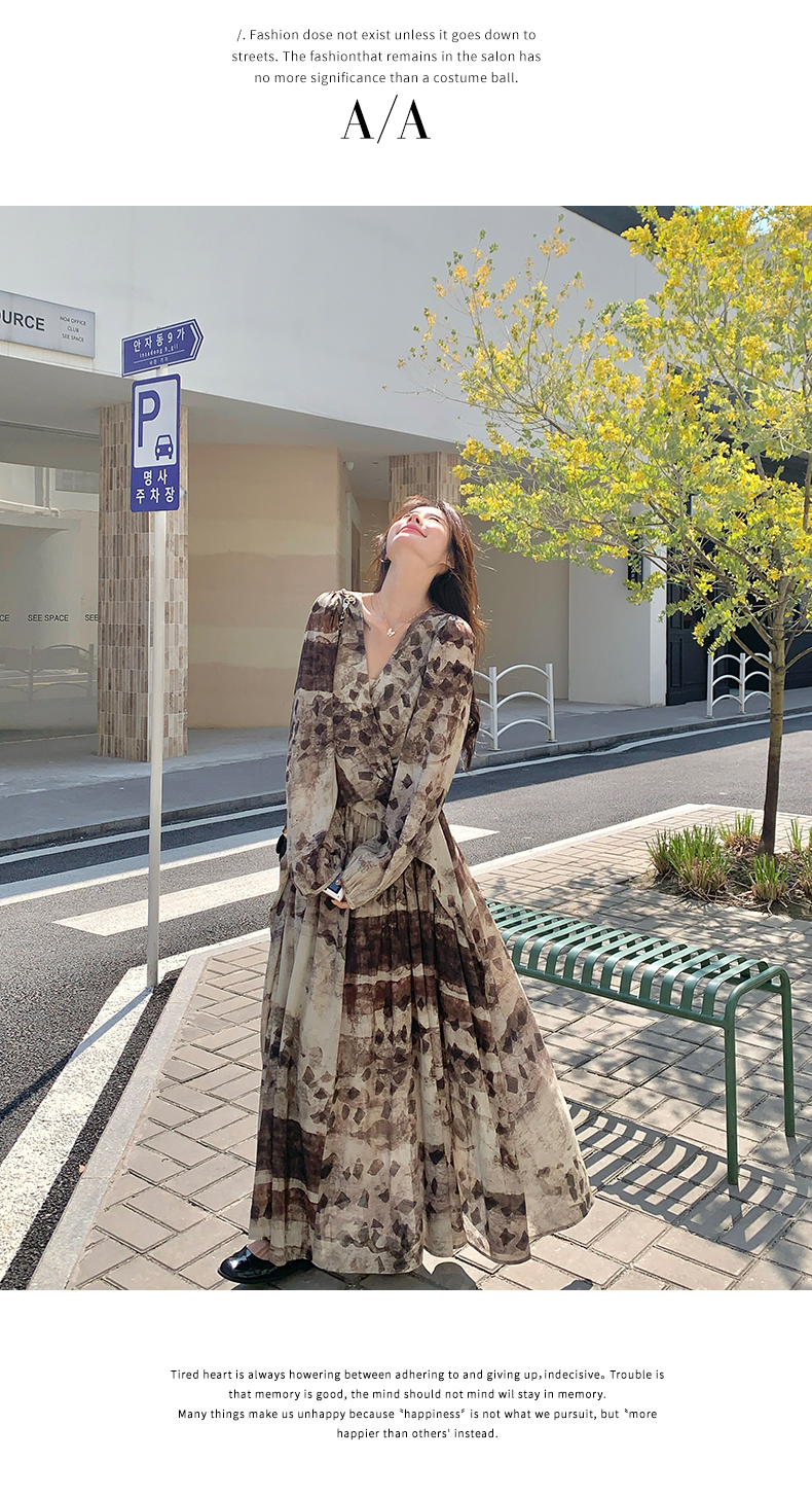 【ワンピース】細見え 日系 Vネック 無地 長袖ワンピース 切替デザイン ゆったり 気質ロング【JZシリーズ】【AHシリーズ】