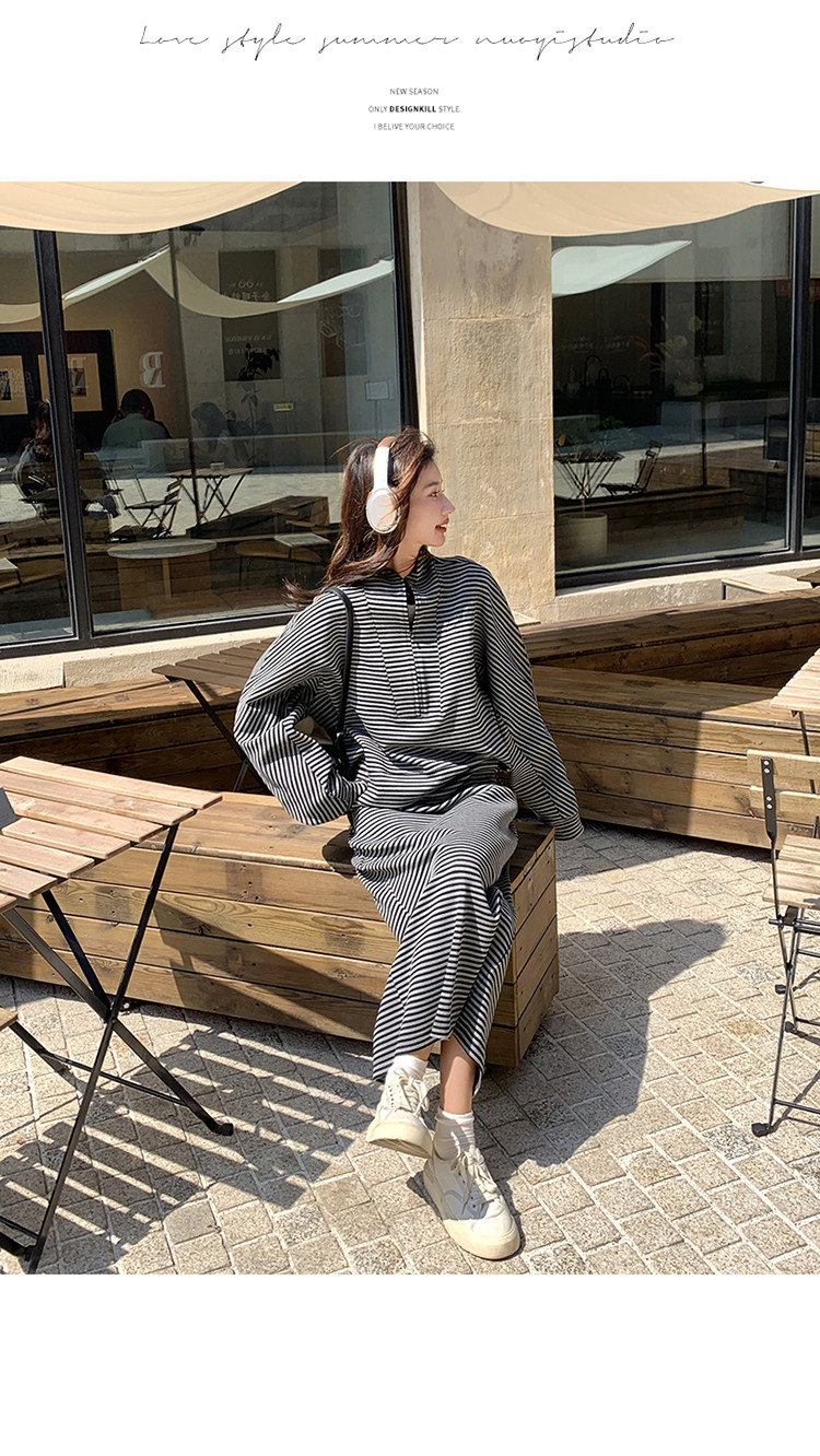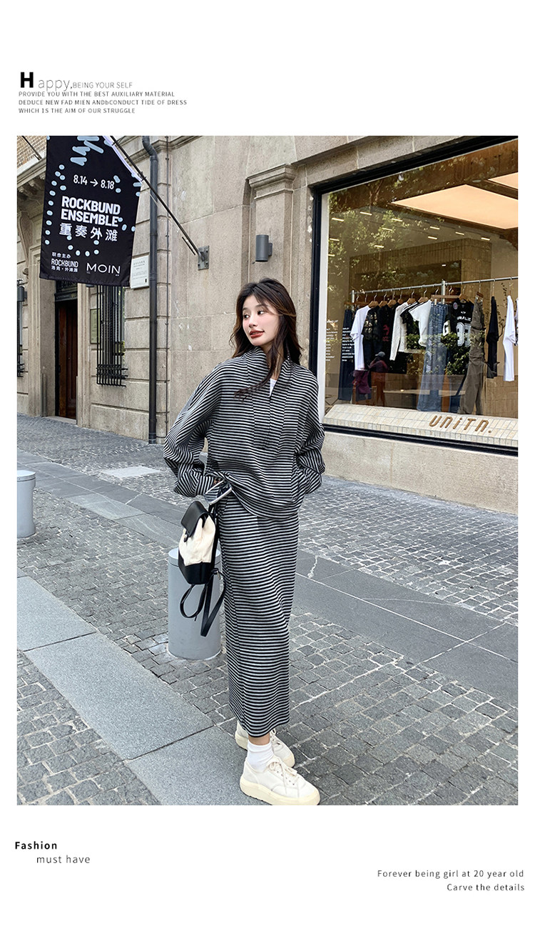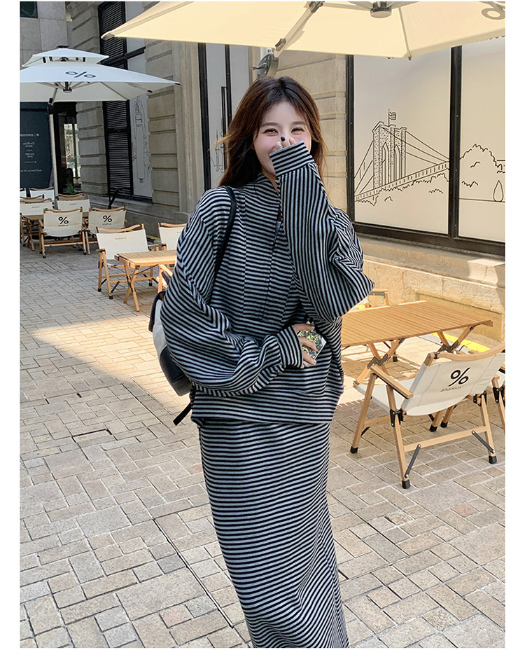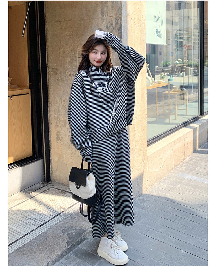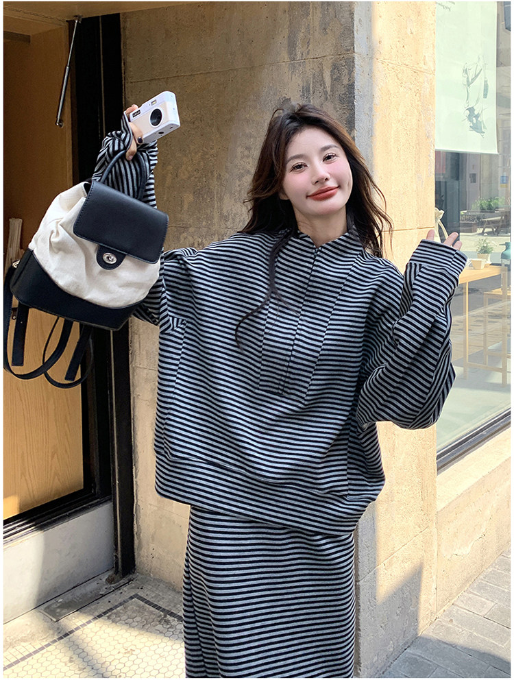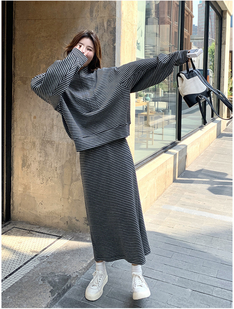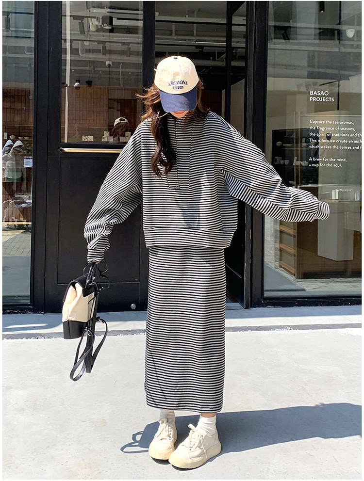 2点セット!【セットアップ】韓国トレンド ストライプスウェット パーカー+スカート 春秋 2点セット カジュアル OOTDコーデ フェミニン【SHシリーズ】