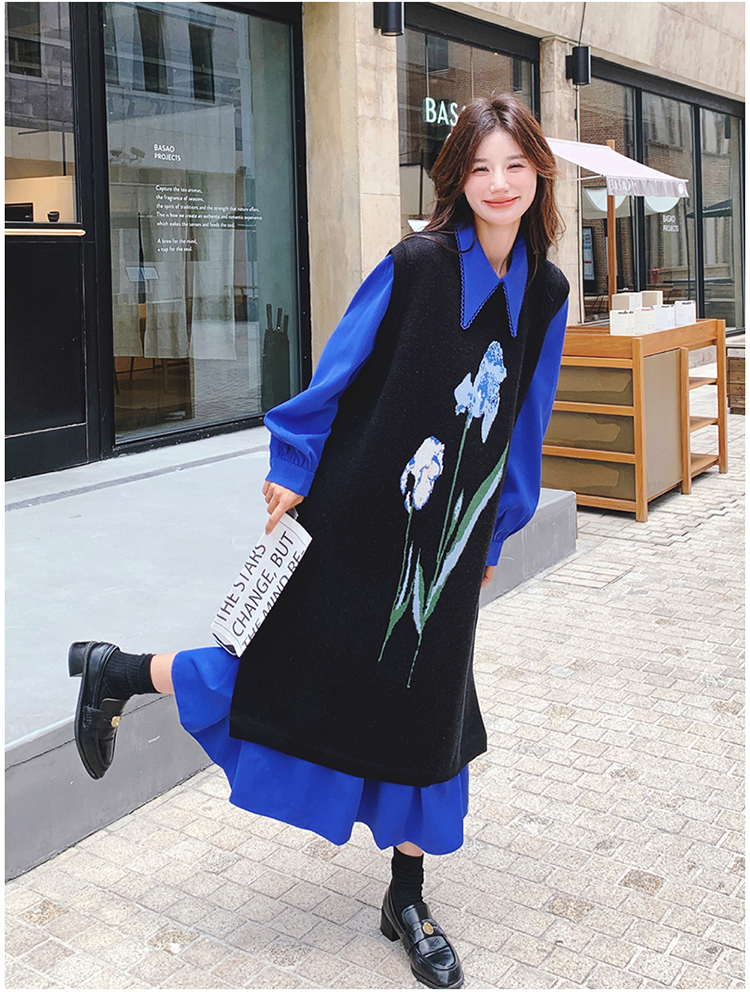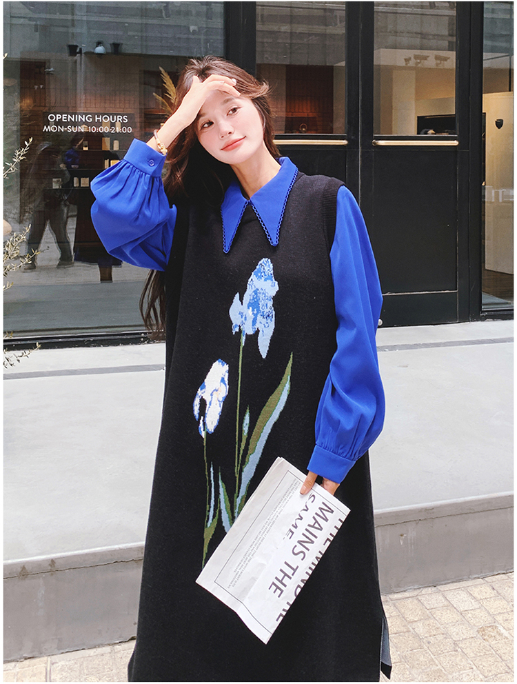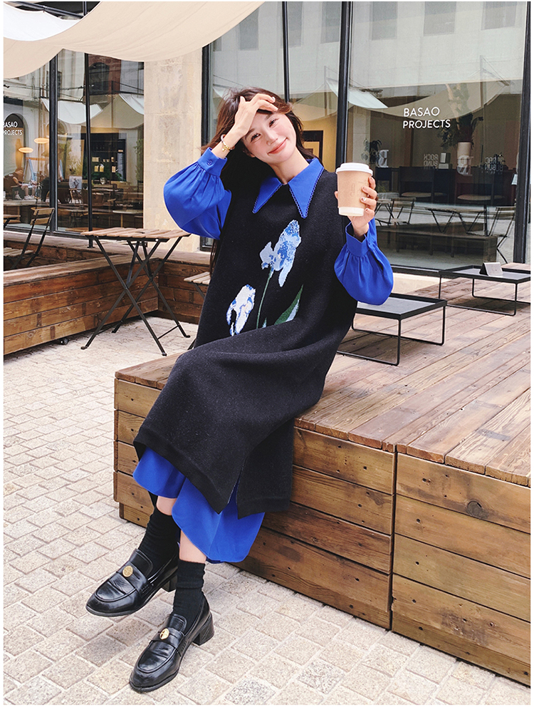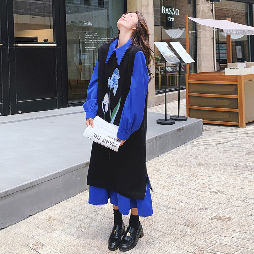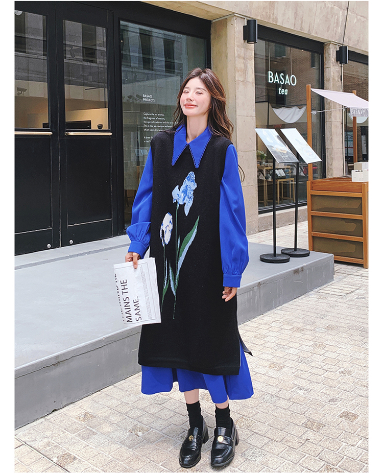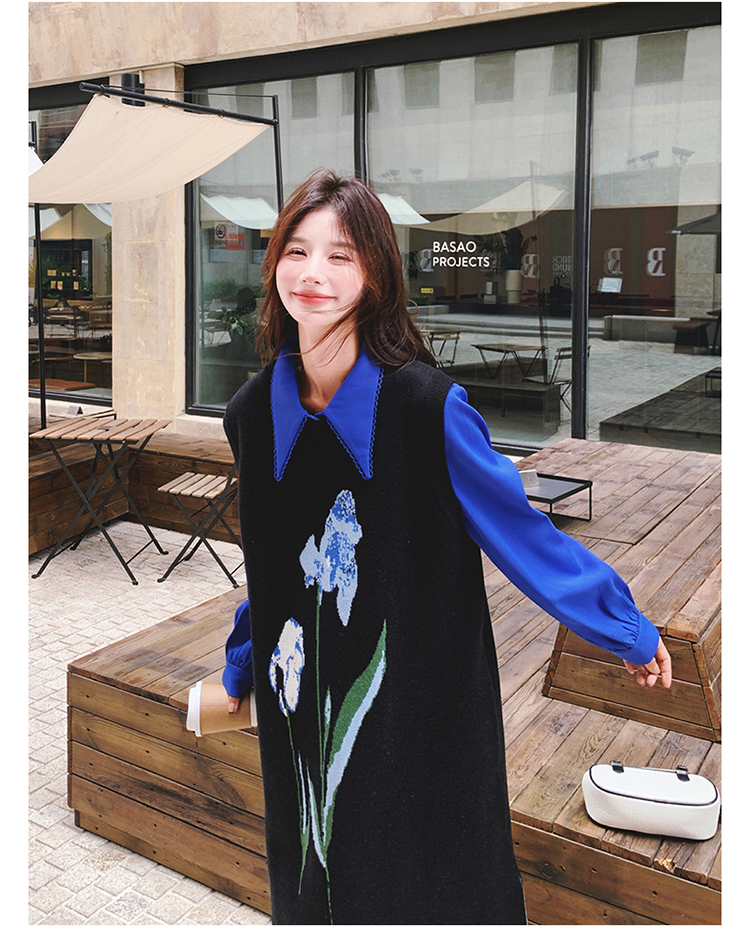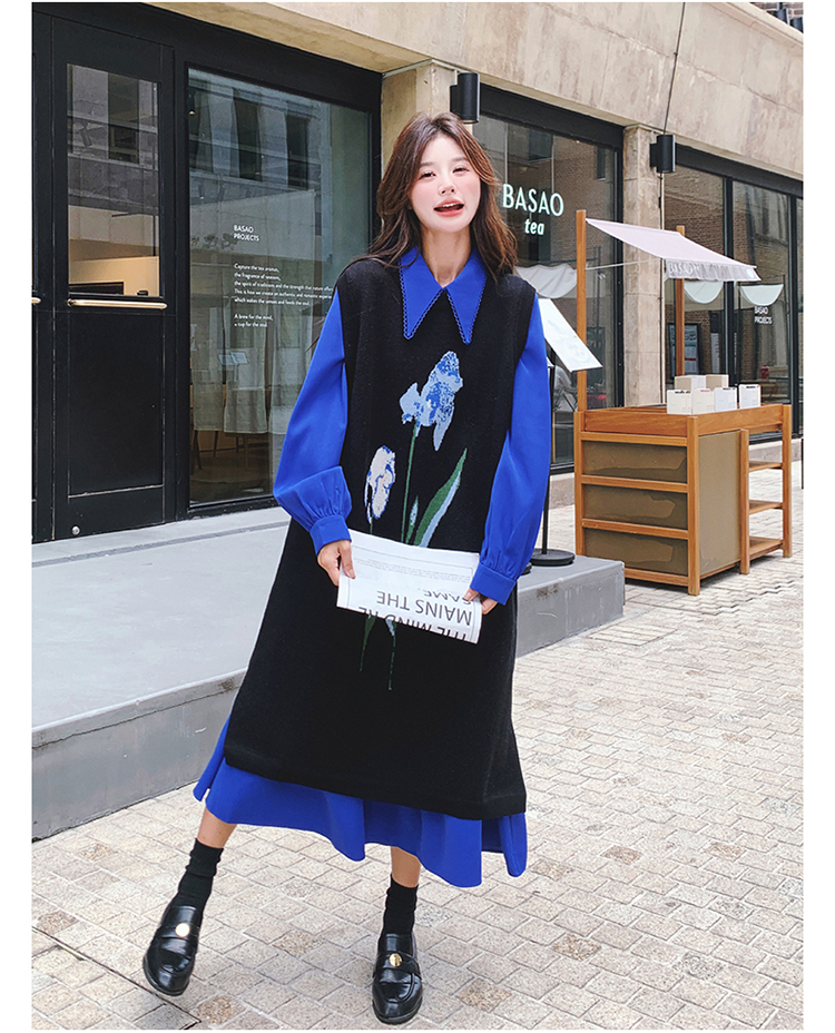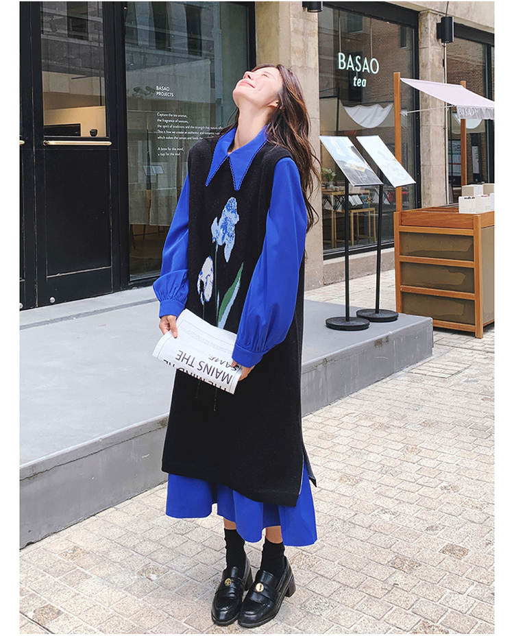 2点セット!【セットアップ】ブルー ジャカードニット+シャツ長袖ワンピース セットアップ レディース OOTDコーデ 若見え【SHシリーズ】