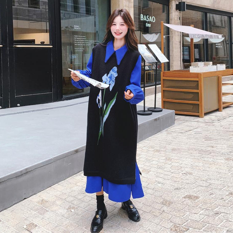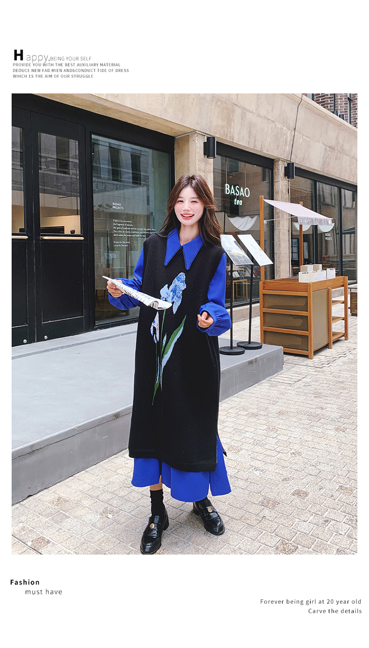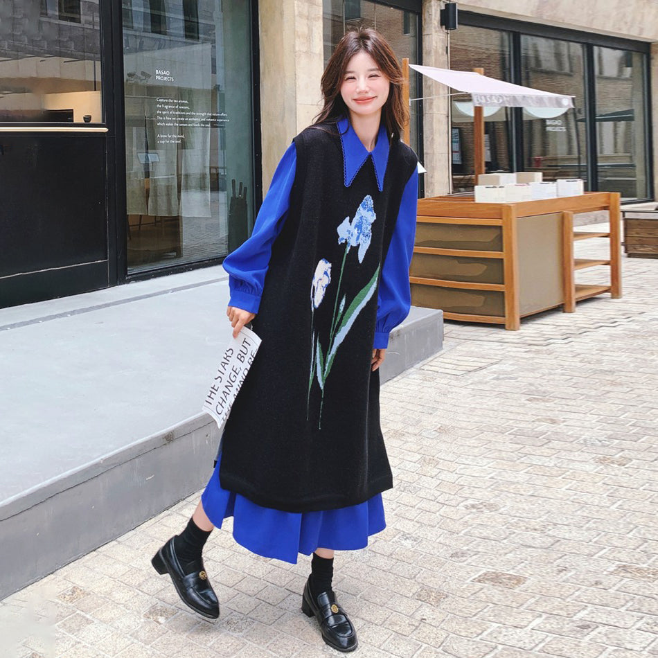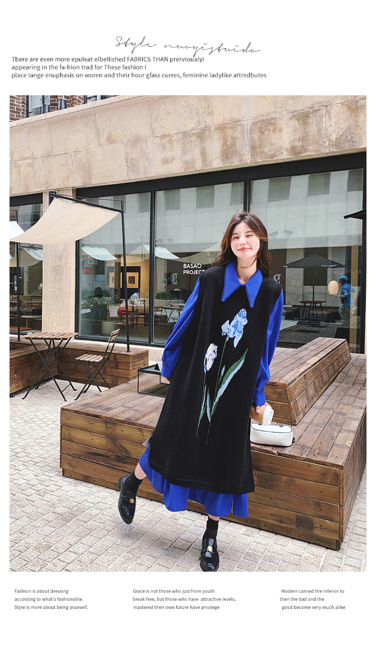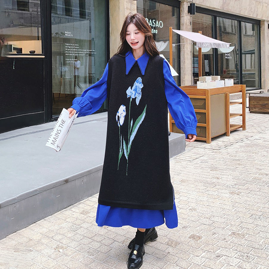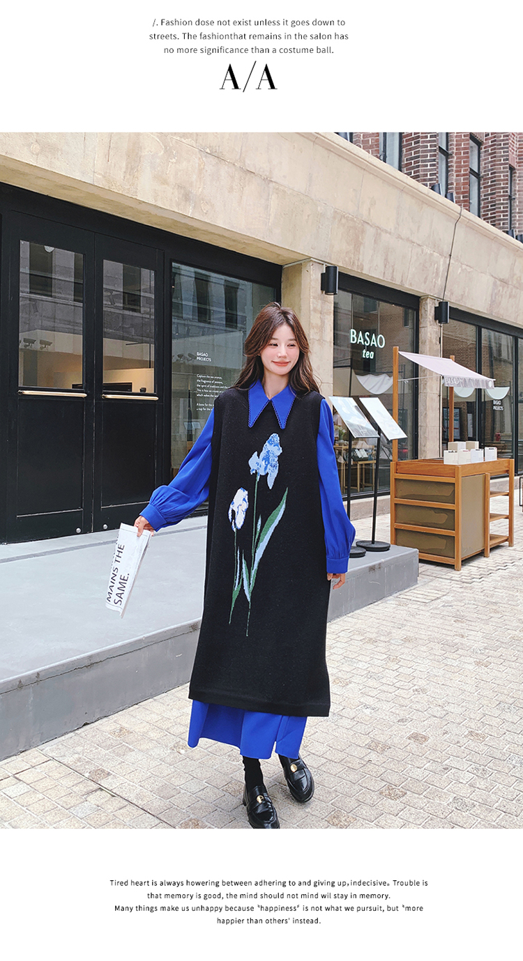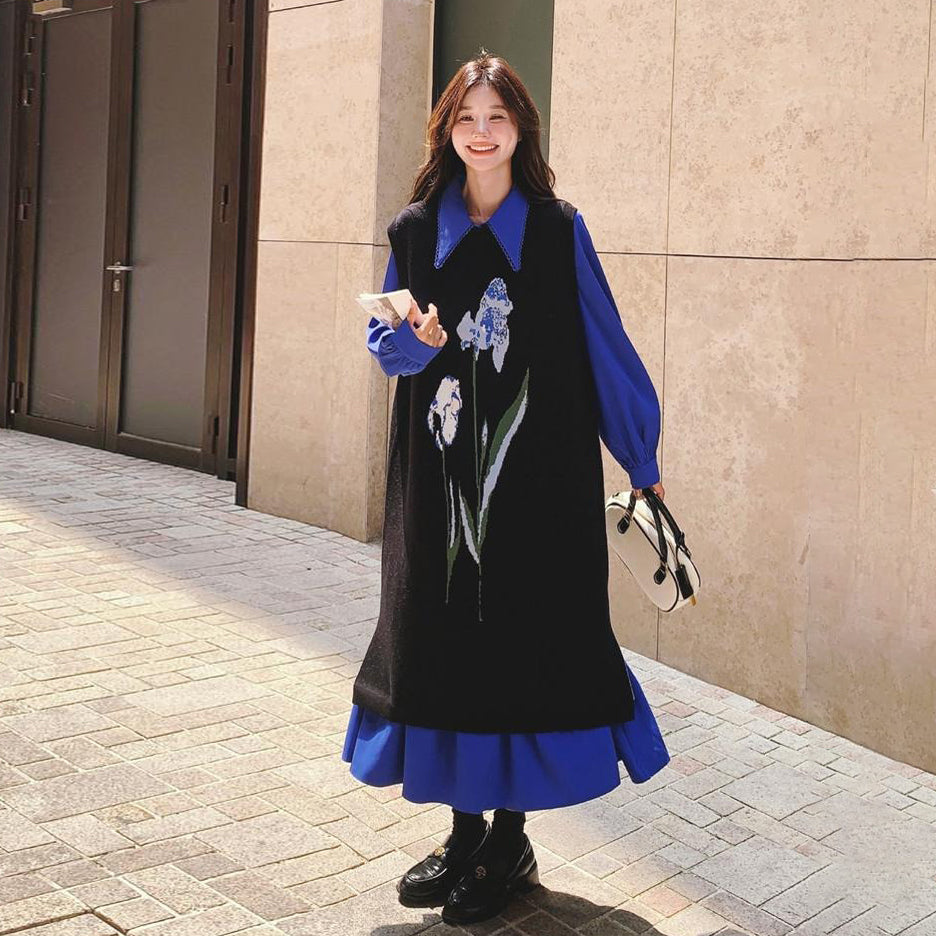 2点セット!【セットアップ】ブルー ジャカードニット+シャツ長袖ワンピース セットアップ レディース OOTDコーデ 若見え【SHシリーズ】