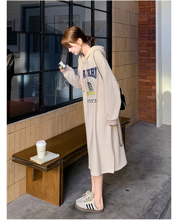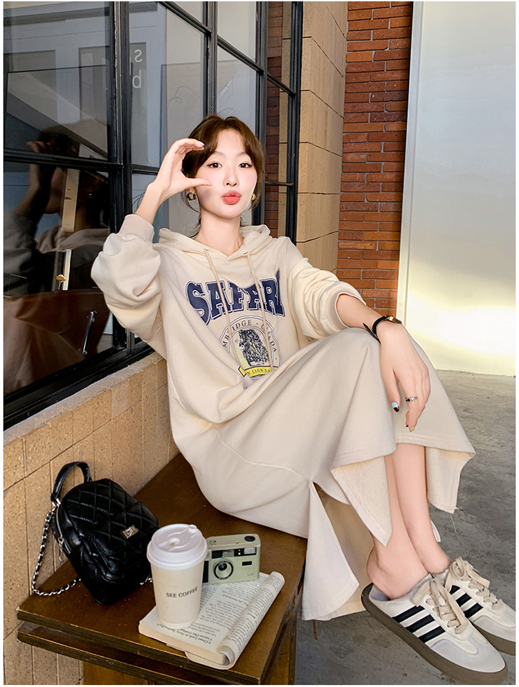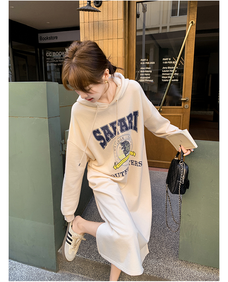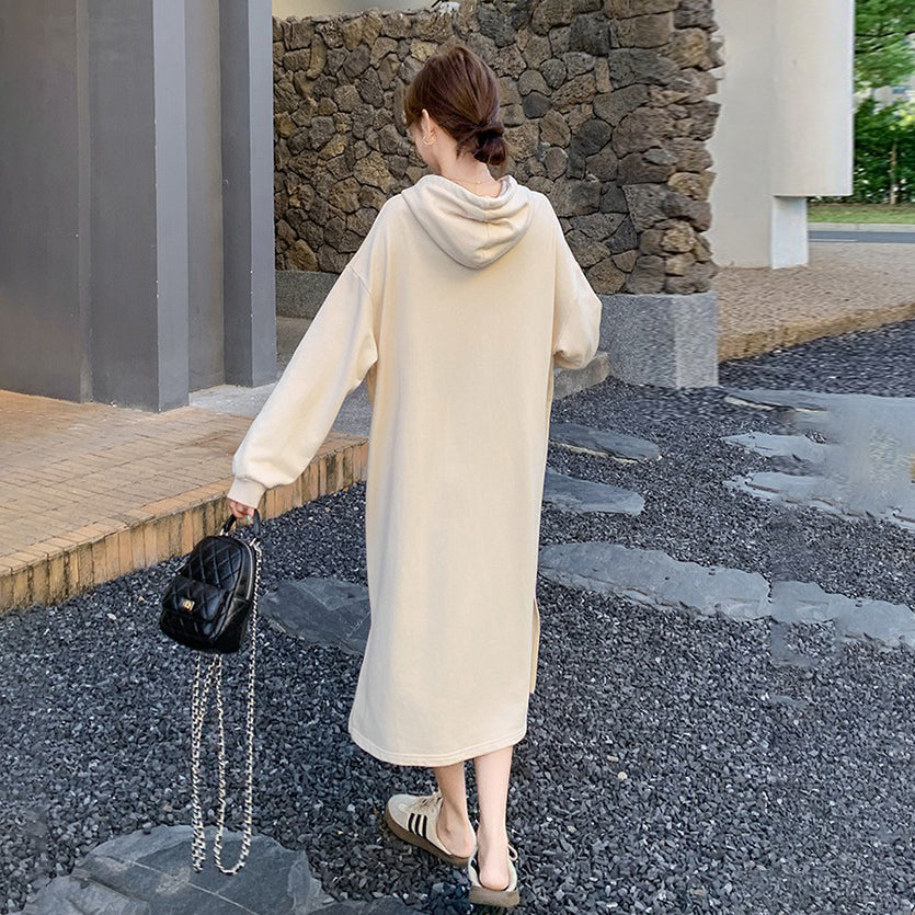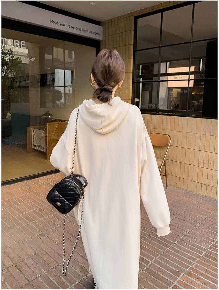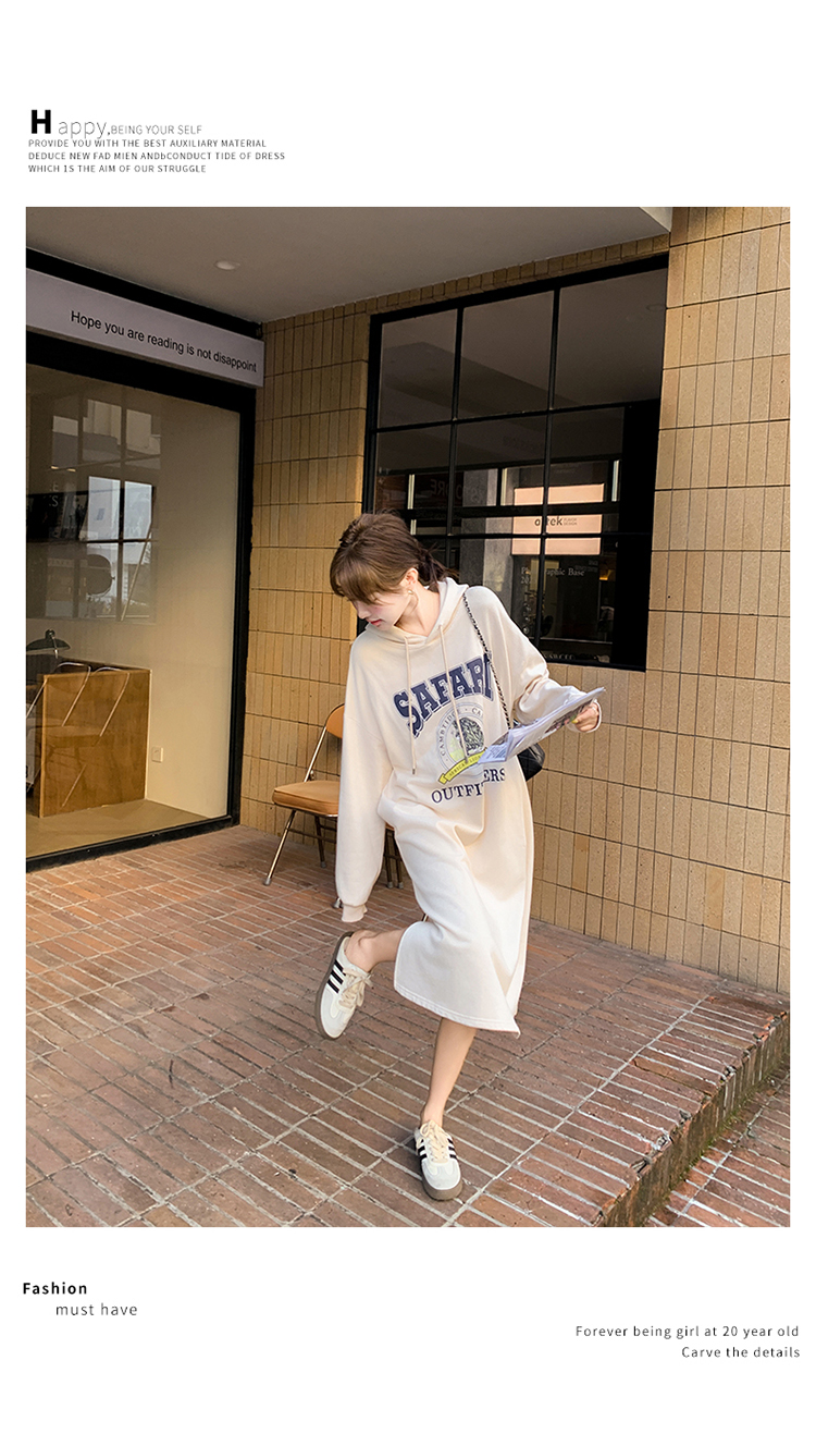 【ワンピース】高級感 韓国風 オフホワイト フード付き長袖ワンピース おしゃれ ゆったりスウェットロングワンピース【JZシリーズ】